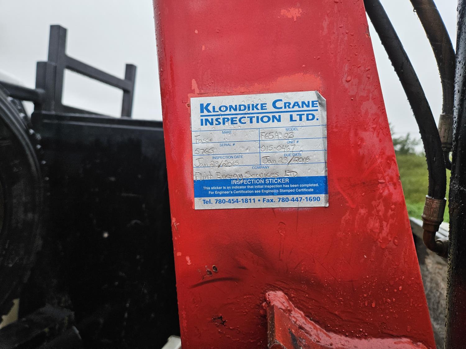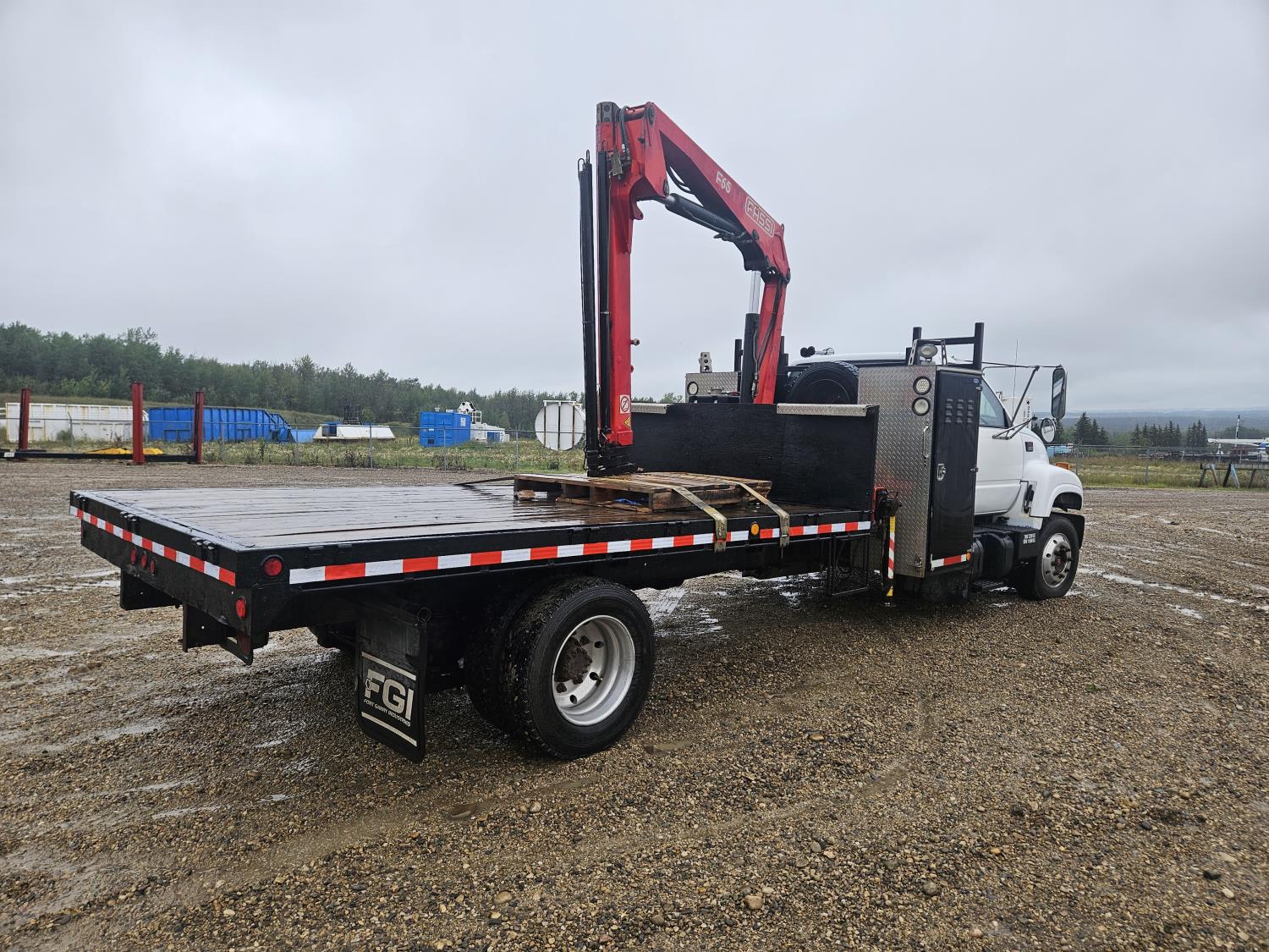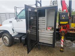 Cat 3126 7.2 L 6 cylinder 210 HP diesel engine, Allison automatic transmission, A/C, hydraulic wet kit, steel tool boxes, 8 ft x 13 ft deck, Fassi F65A.23 3 section 29 ft knuckle crane, outriggers, air ride suspension, hydraulic brakes, cruise control not working, all aluminum wheels, 245/70R19.5 tires