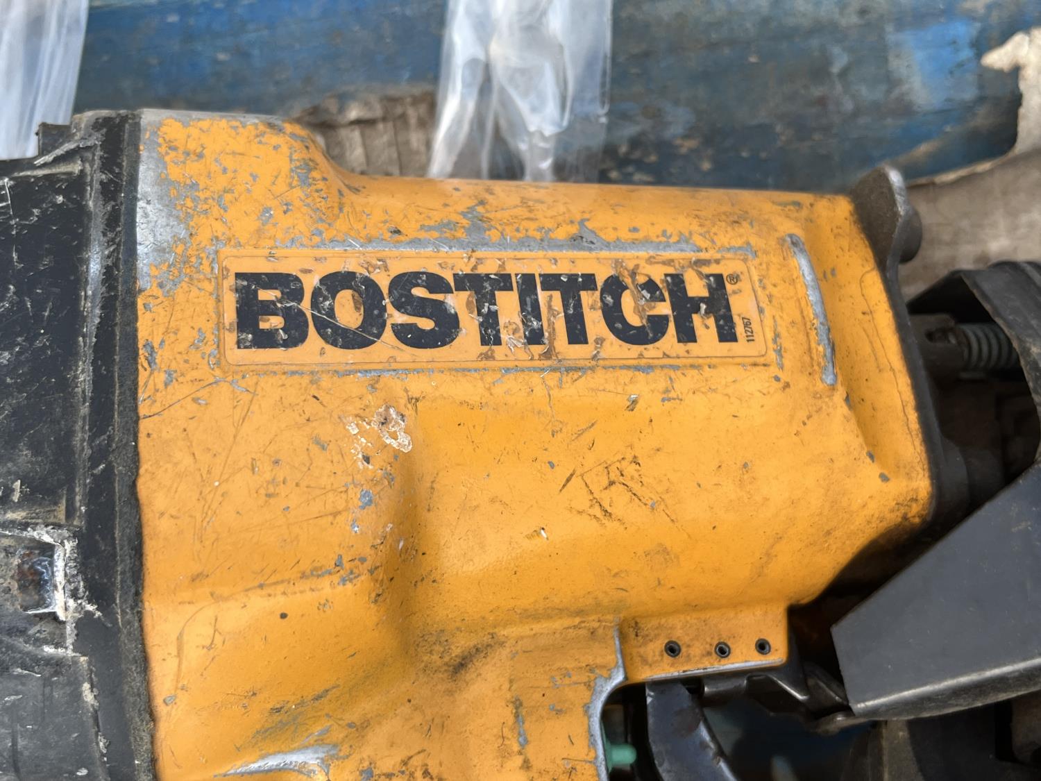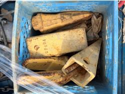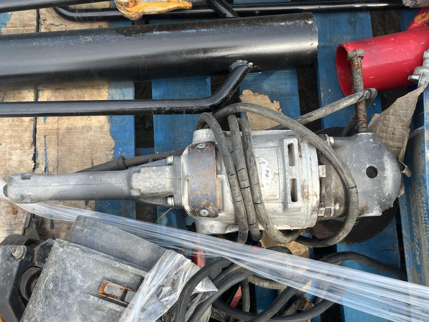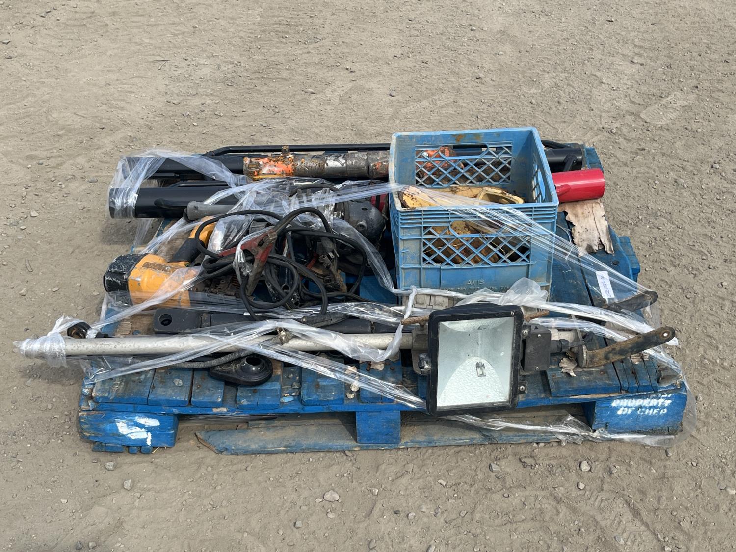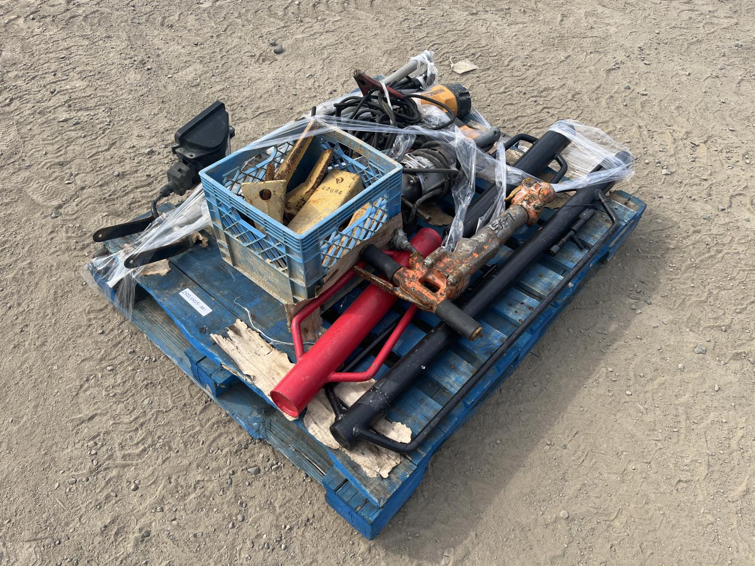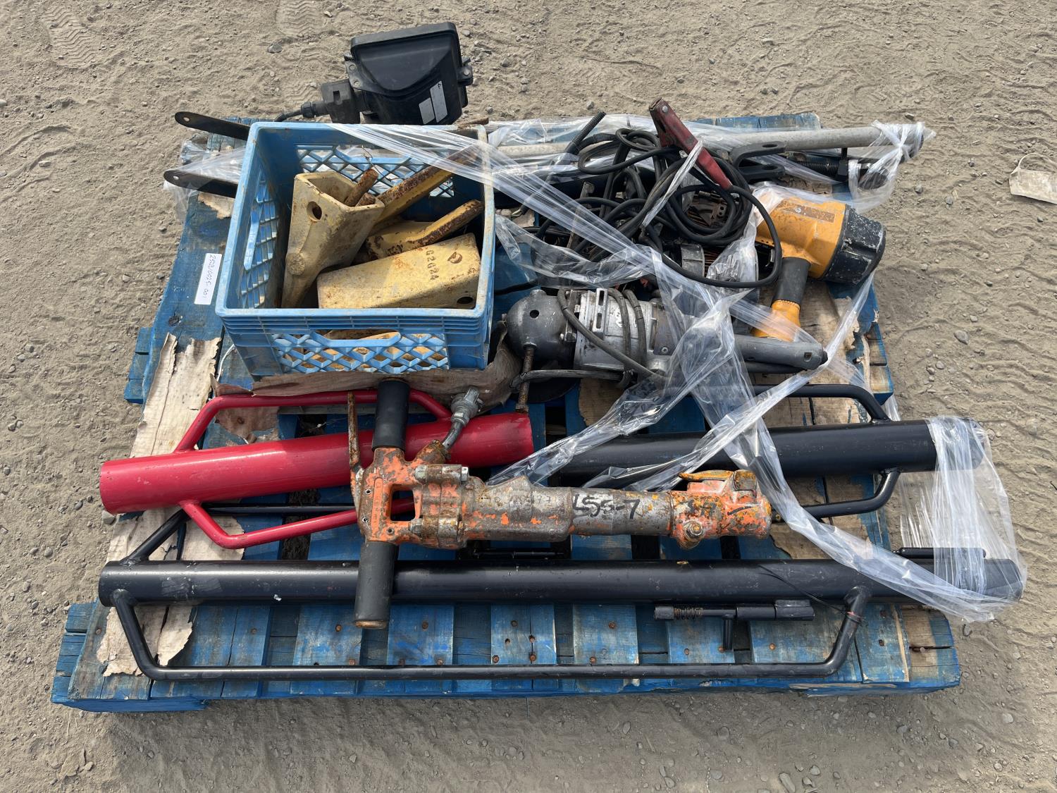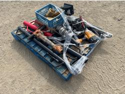 Rock hand drill, Bostitch nail gun, (3) post pounders, excavator/bucket teeth, jumper cables, work light, die grinder