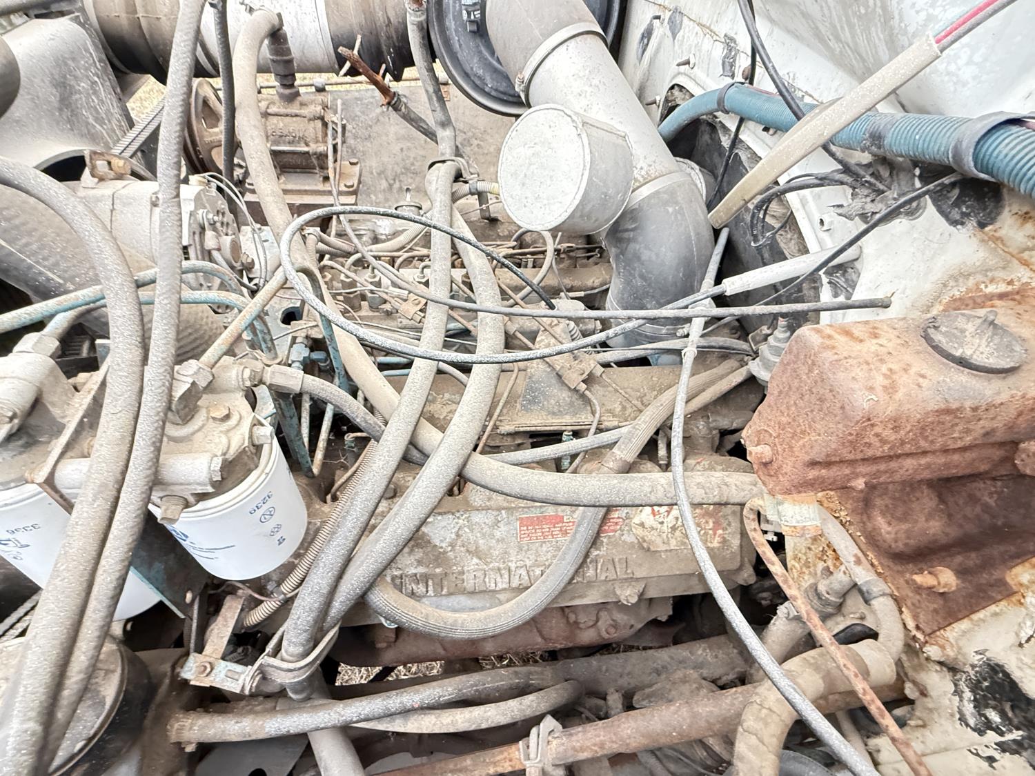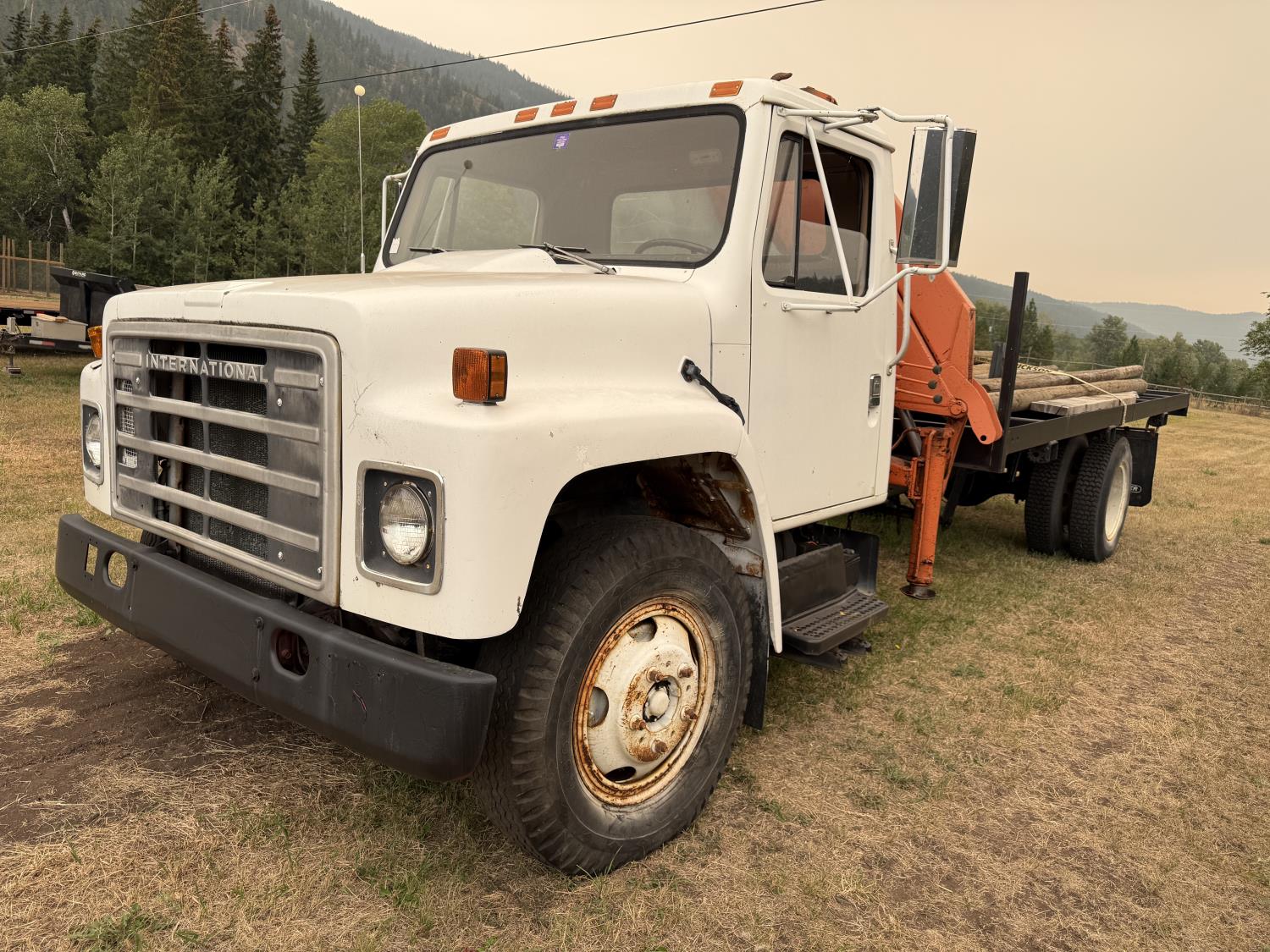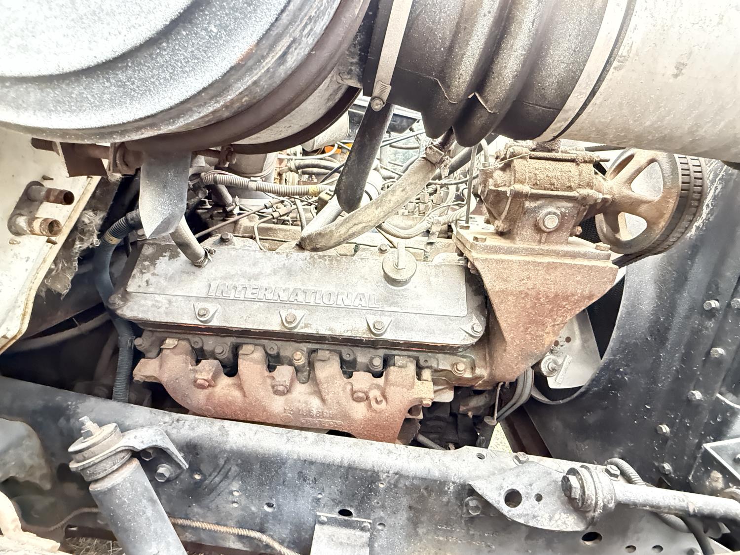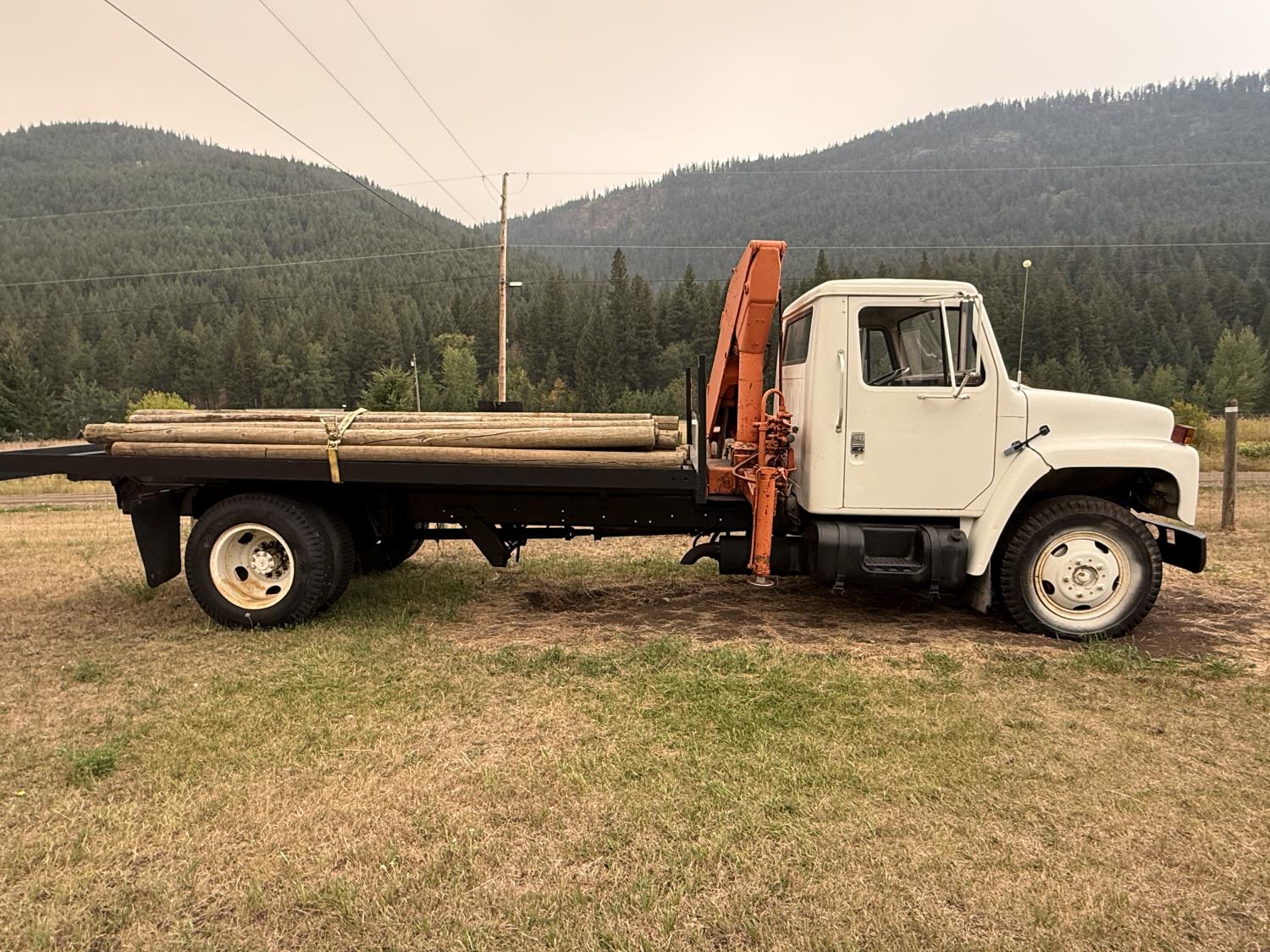 International V8 diesel engine, 5 speed manual transmission, 3 section 13 ft knuckle front mount crane, outriggers, spring suspension, 188 inch WB, 2 spd differential, Many spare parts included, 9.00/20 front tires, 8.25/20 rear tires