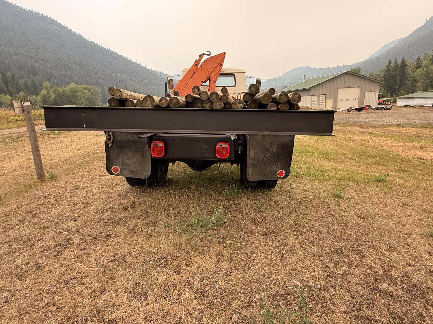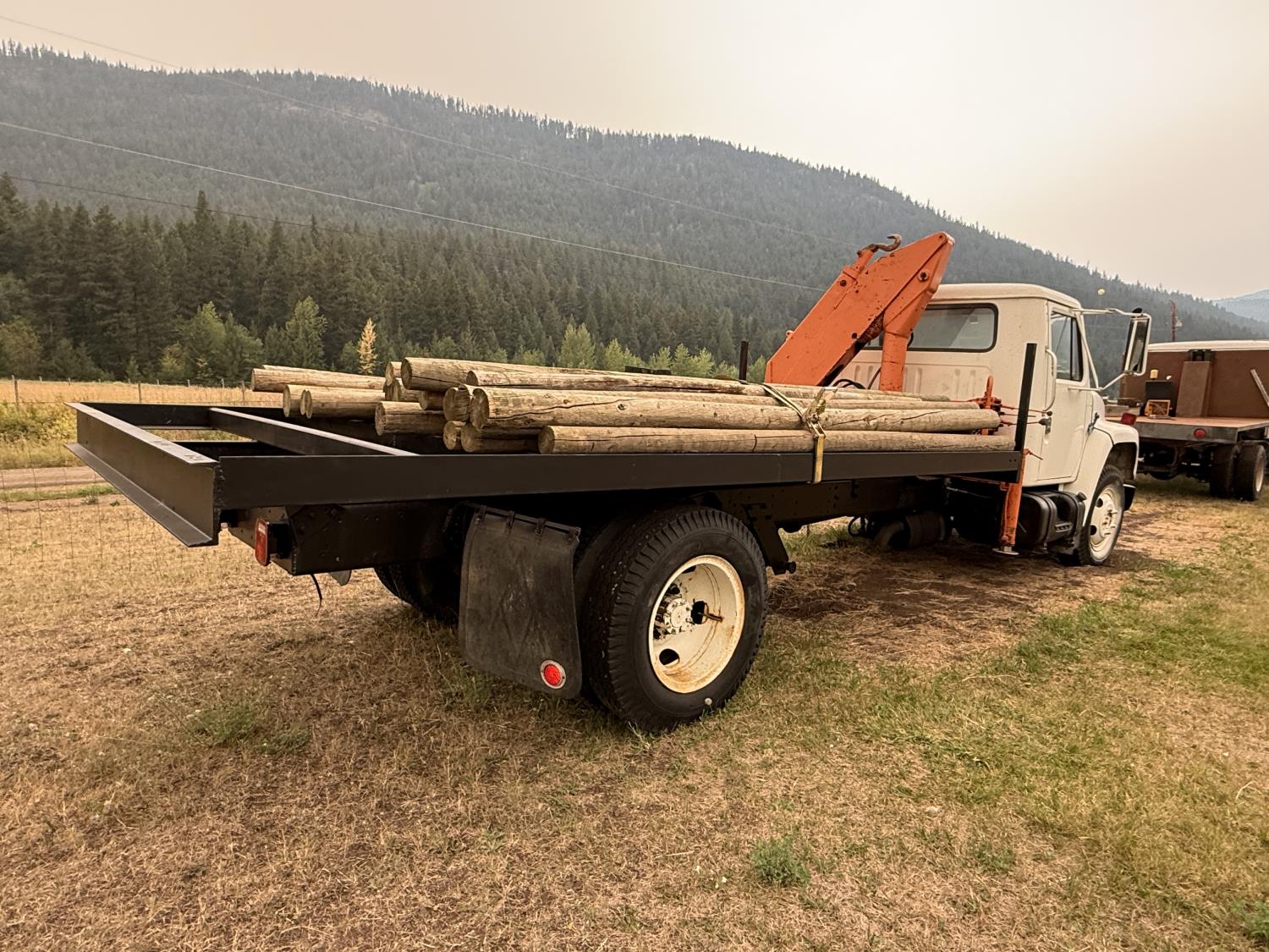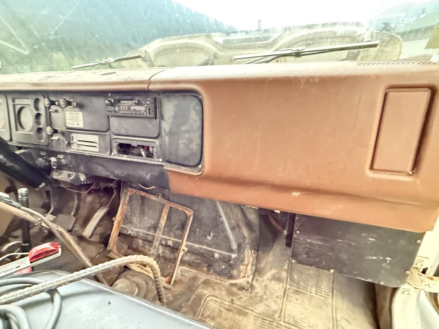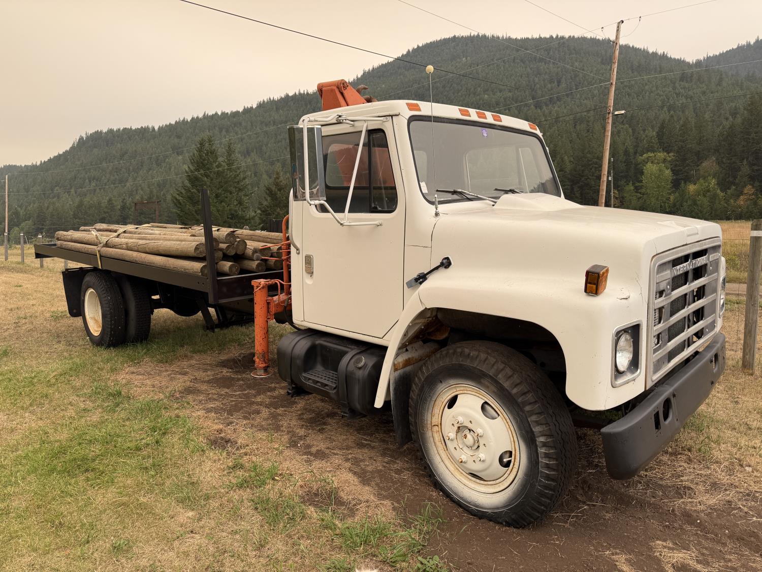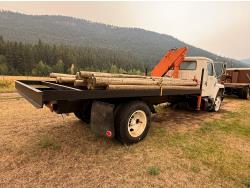 International V8 diesel engine, 5 speed manual transmission, 3 section 13 ft knuckle front mount crane, outriggers, spring suspension, 188 inch WB, 2 spd differential, Many spare parts included, 9.00/20 front tires, 8.25/20 rear tires