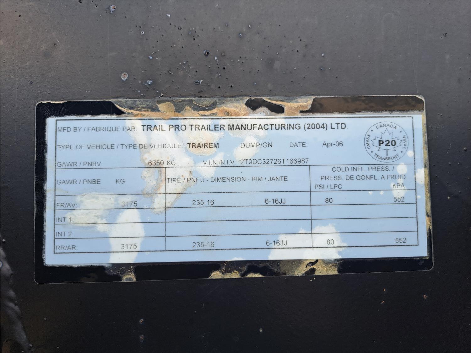 King pin hitch, 6 ft 7 inch box width, 22 inch side wall height, torsion suspension, 235/80R16 tires
