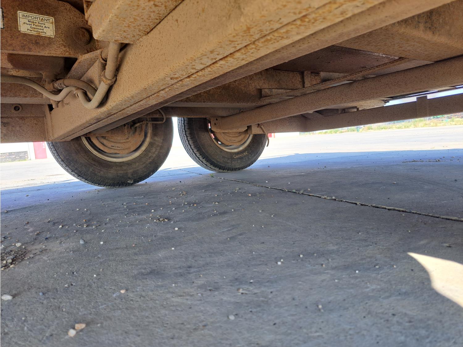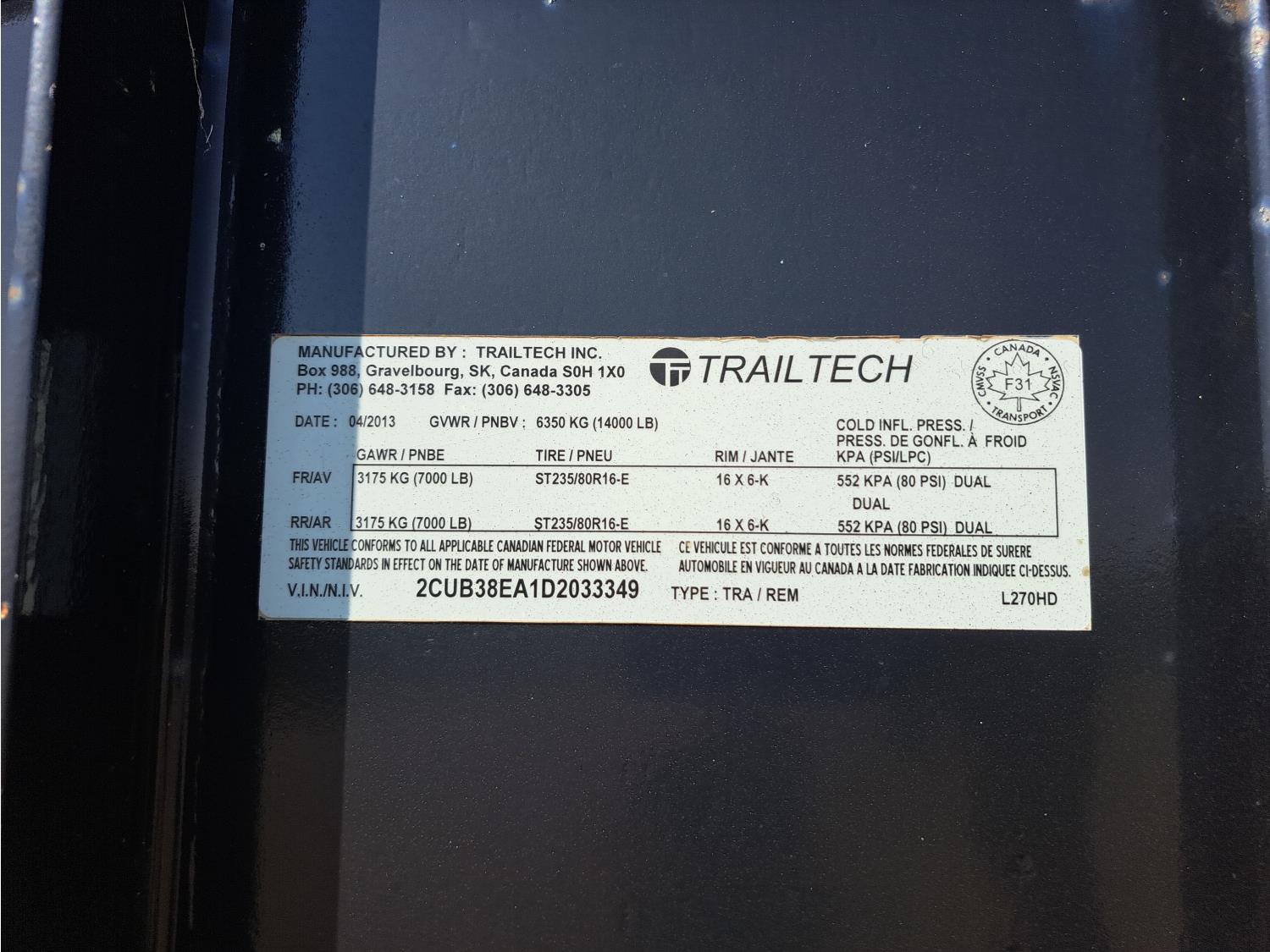 King pin hitch, 6 ft 9 inch box width, 19 inch side wall height, torsion suspension, 7,000 lb axles, 235/80R16 tires