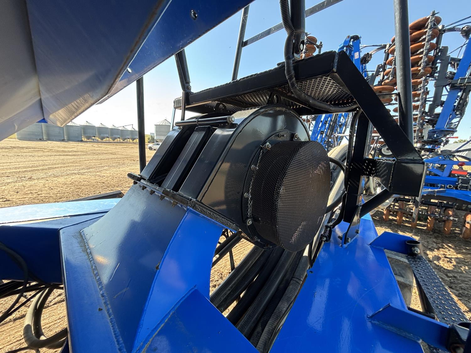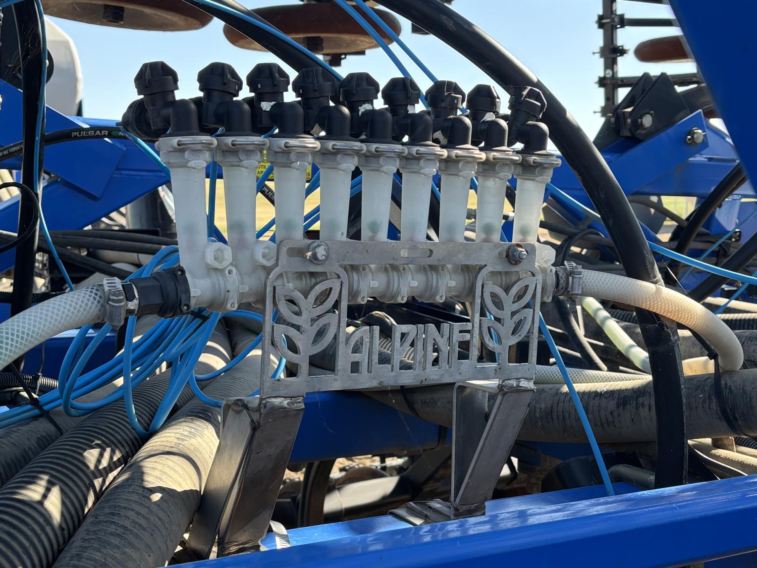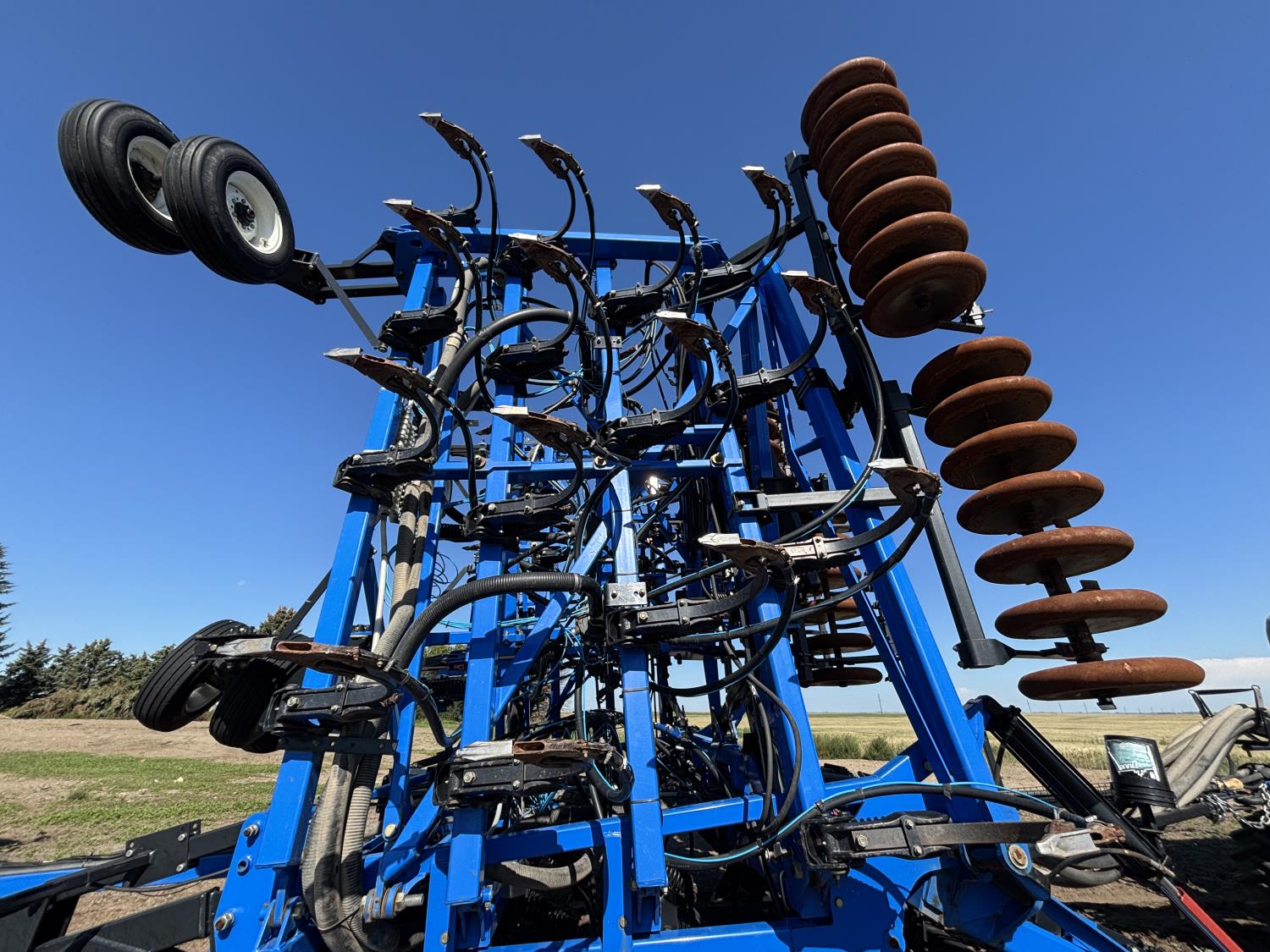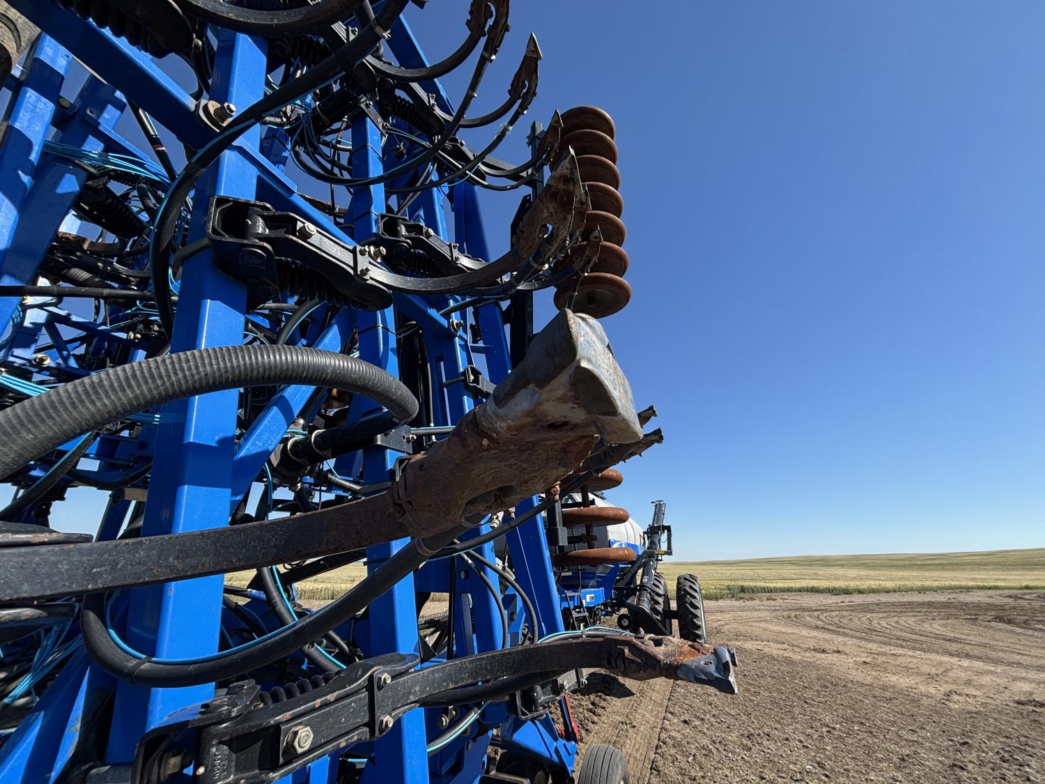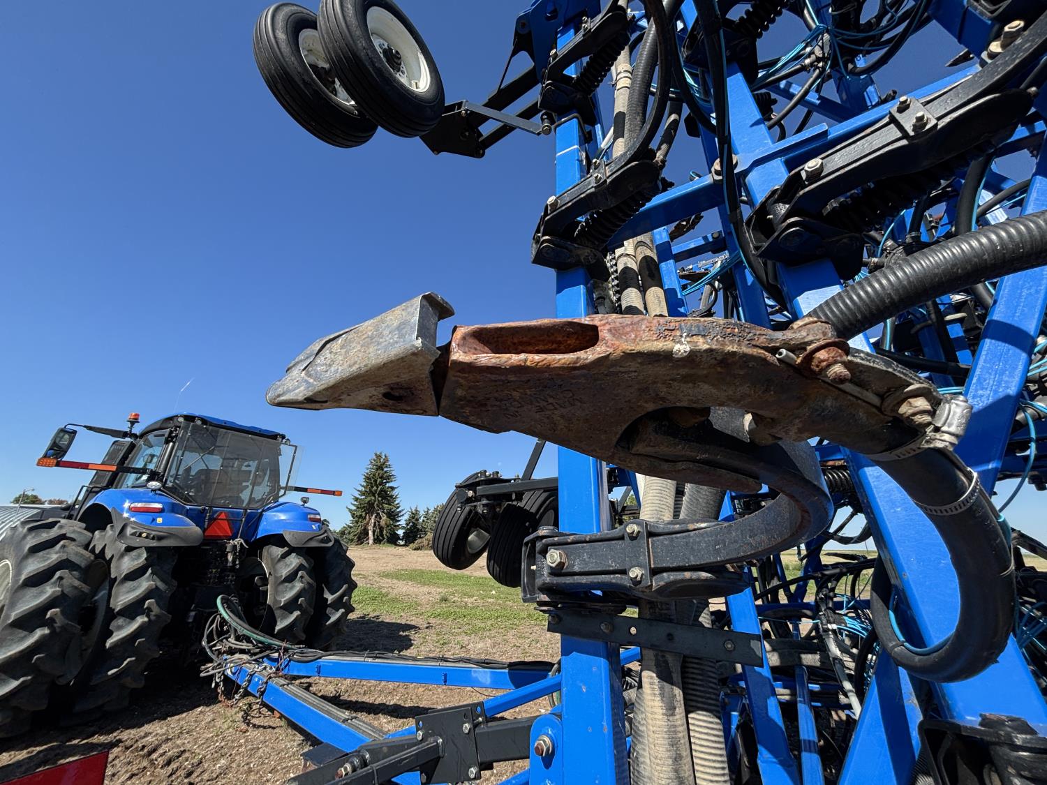 10 inch spacing, single shoot openers, 3 inch steel packers, liquid fertilizer kit, Alpine inoculant injection kit, Air Cart: 3 compartments, loading conveyor, double fan, variable rate metering, 3 tank cameras, New Holland IntelliVision IV display, dual 22.5X16.1 front tires, dual 18.4-38 rear tires