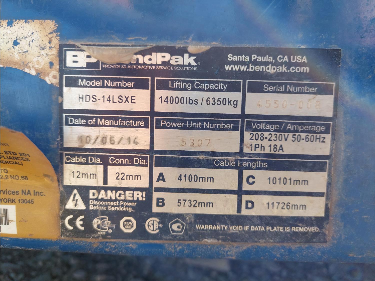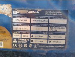 14,000 lb lift capacity, 2.5HP, 230V, single phase SMC motor, 20 inch W x 230 inch L platform, (2) 2014 BendPak RJ-7 bridge jacks