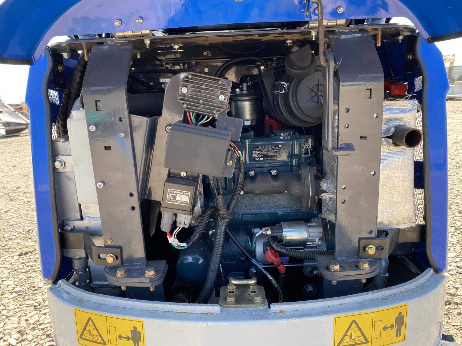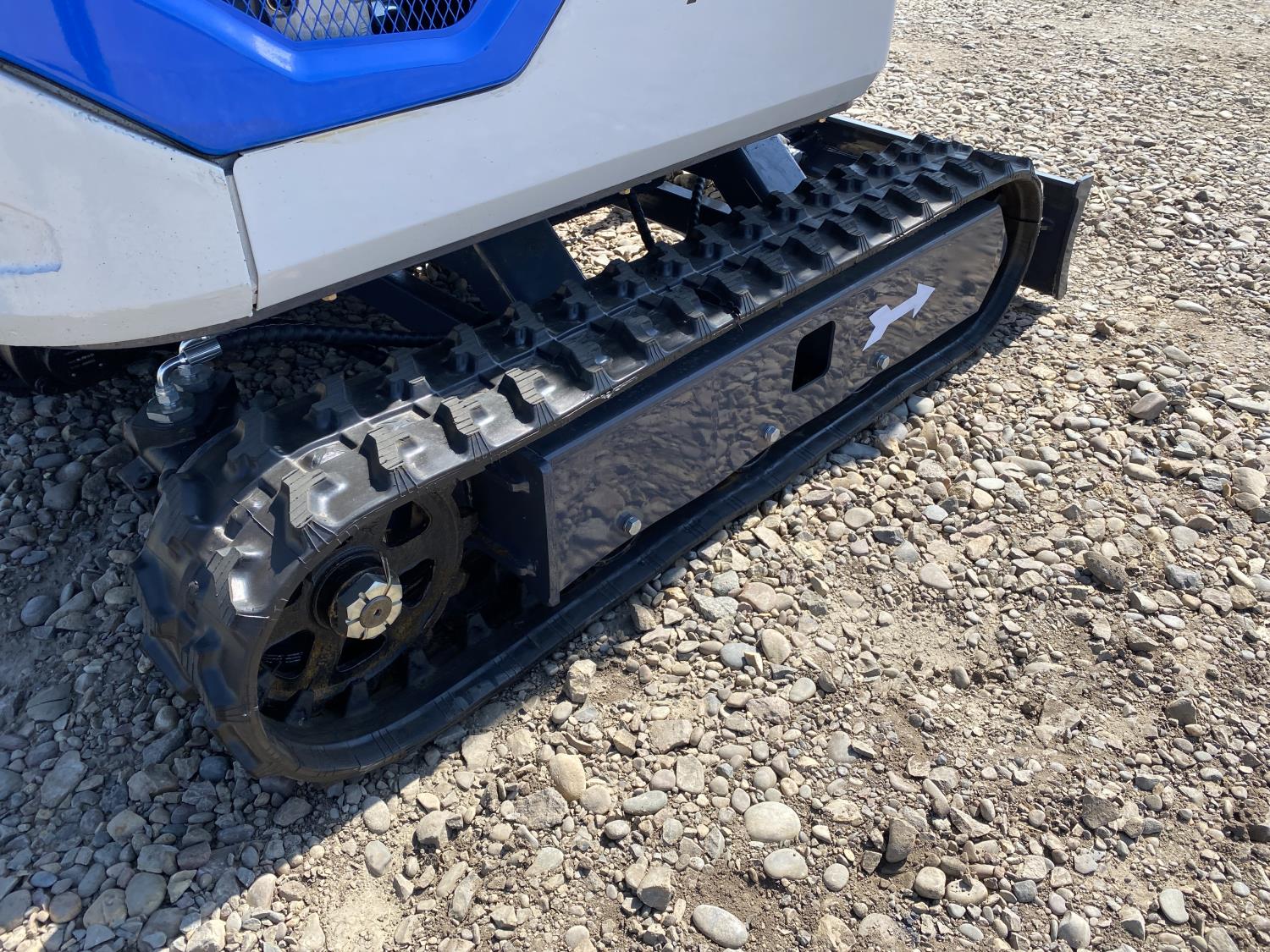 Open station, Kubota D722 3 cylinder diesel engine, 17 inch dig bucket, manual coupler, hydraulic thumb, 2 Ft 4 inch stick, swing boom, aux hydraulics, 43 inch backfill blade, 7 inch rubber tracks