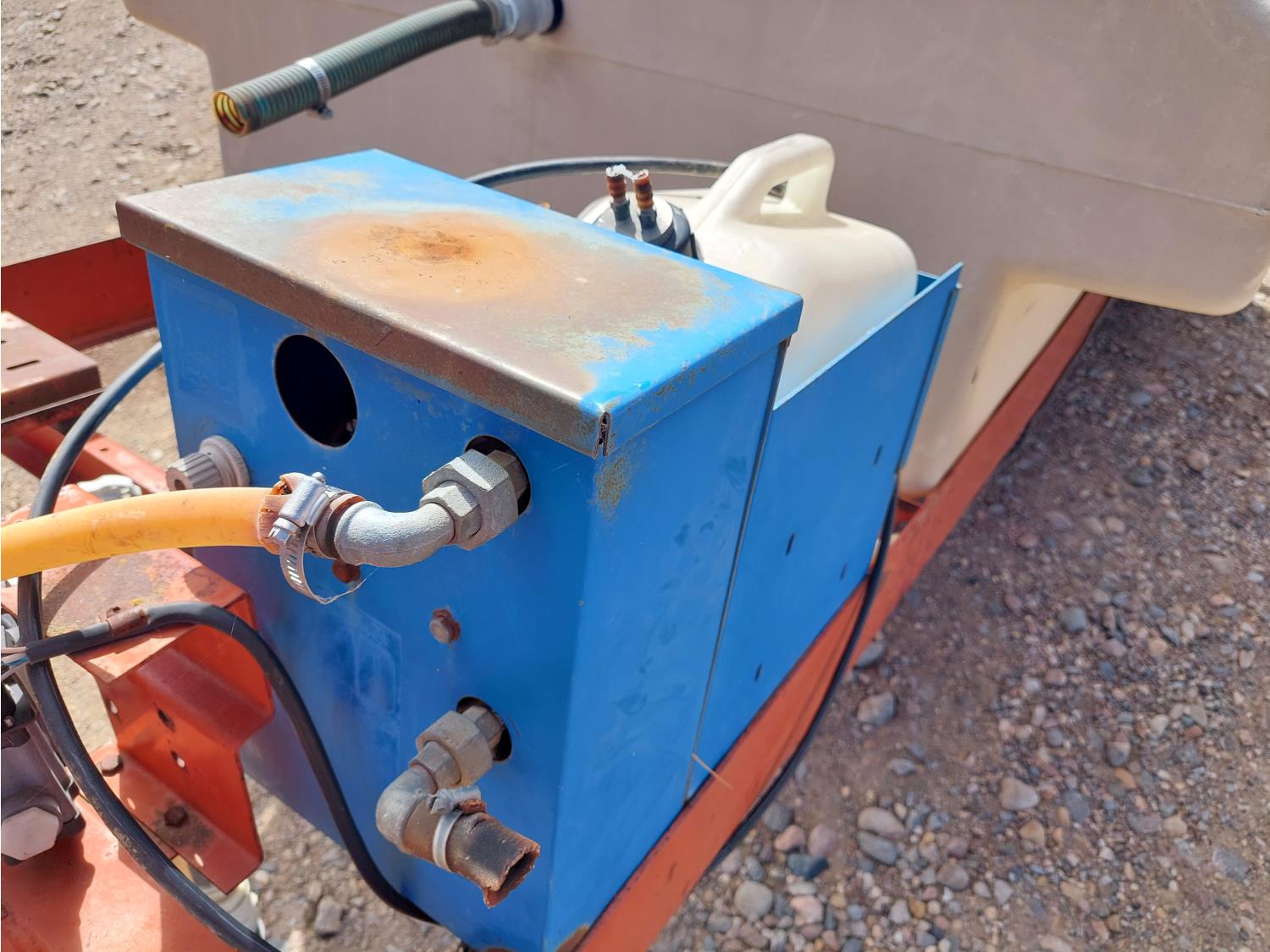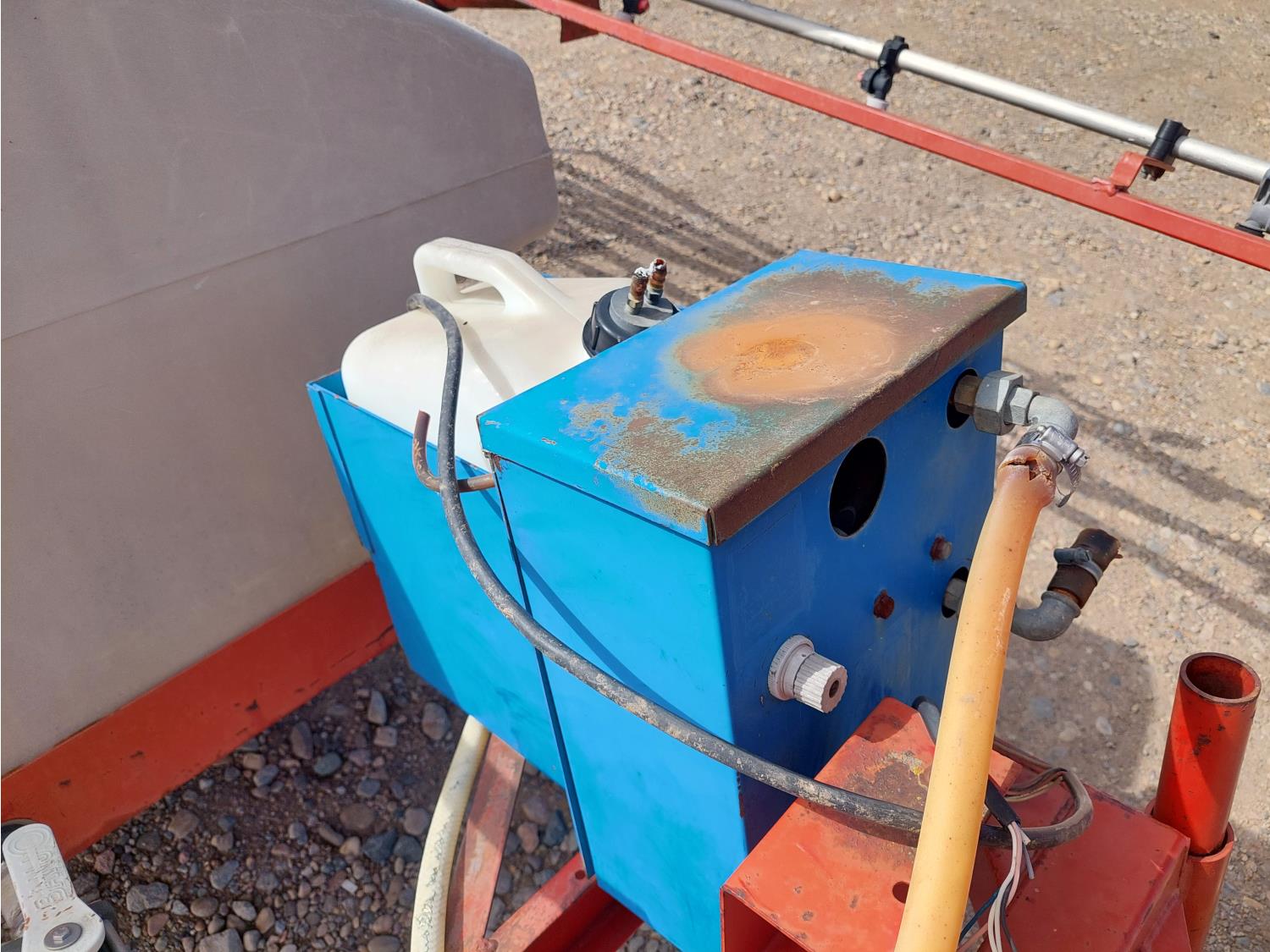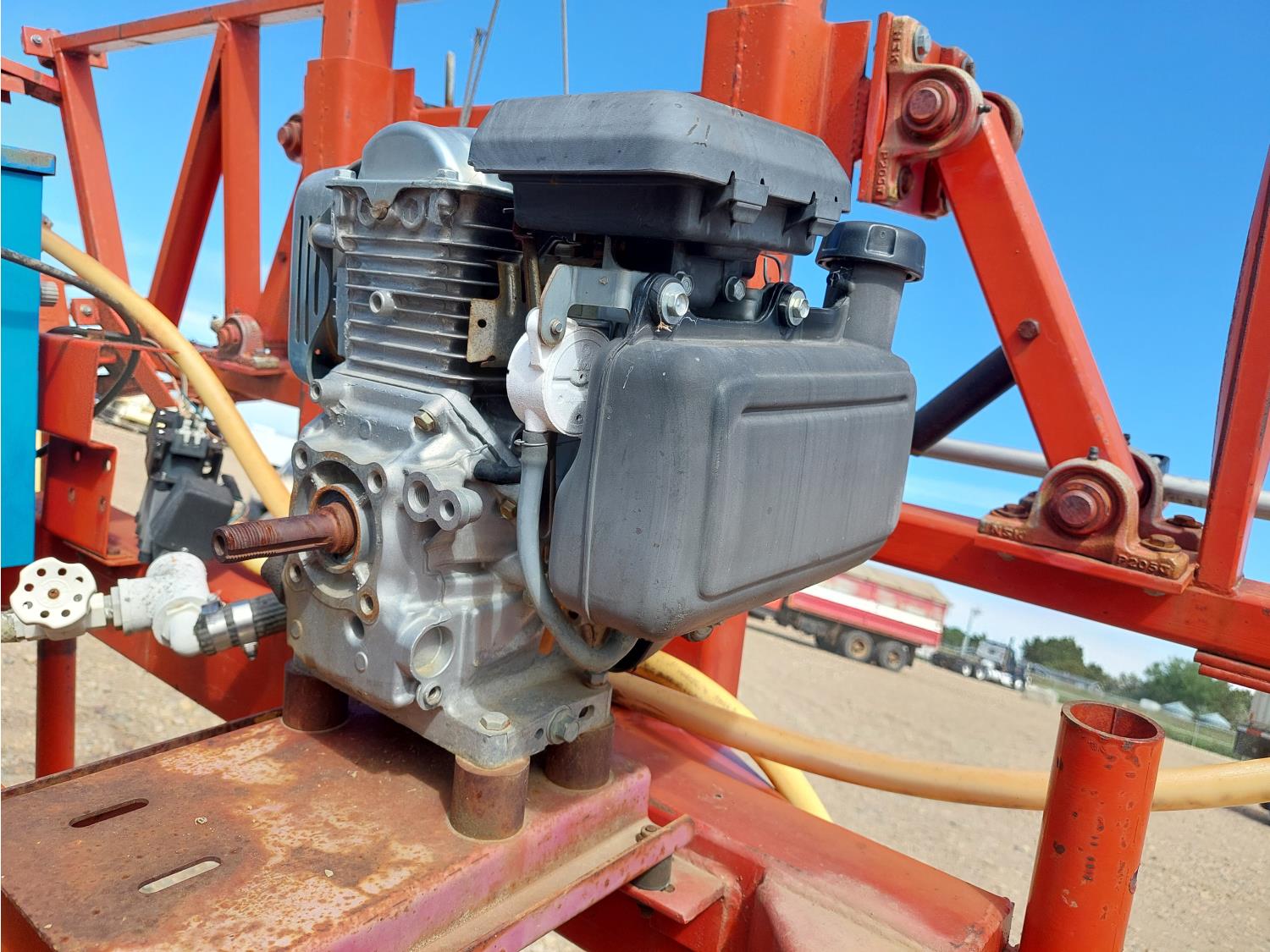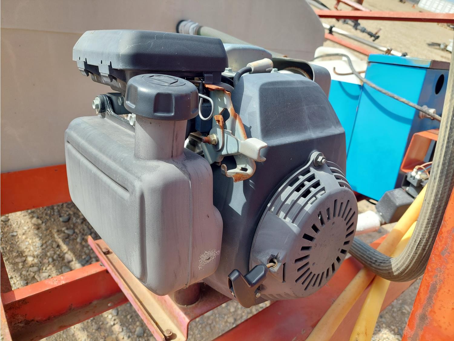 gas engine, 420 US gallon poly tank, chemical mix tank, single nozzle, 20 inch spacing, 48 inch W x 105 inch L base