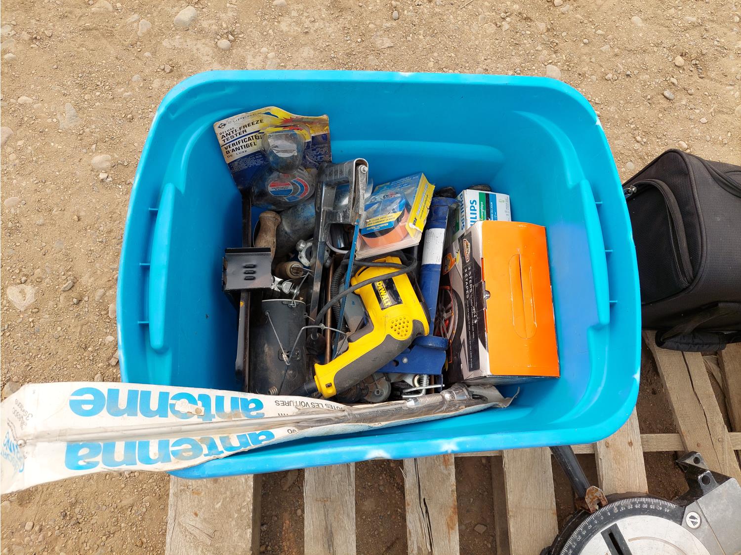 includes 120V DeWalt DW268 screwdriver, hacksaw, caulking gun, carry on travel bag, and vehicle care supplies
