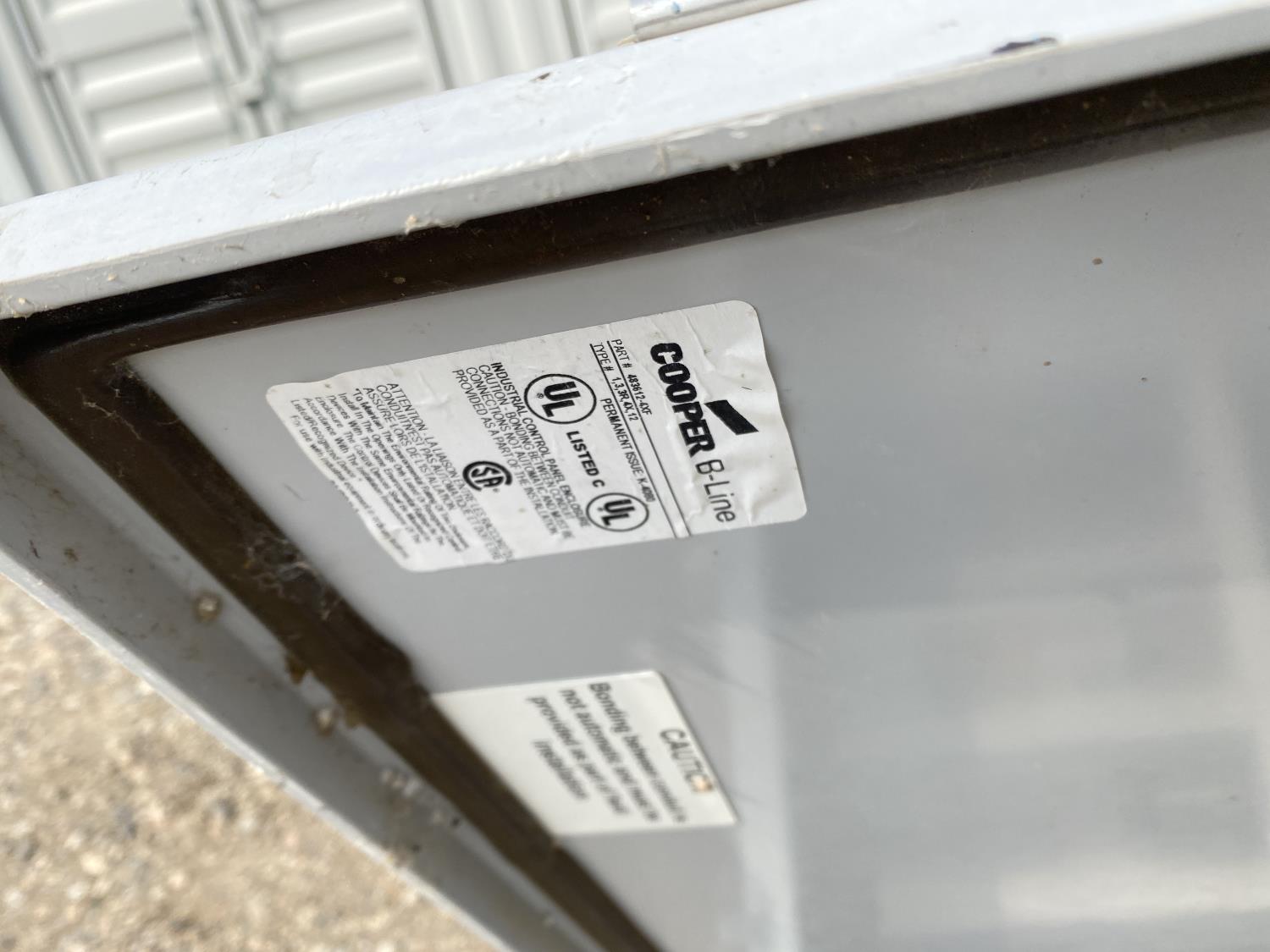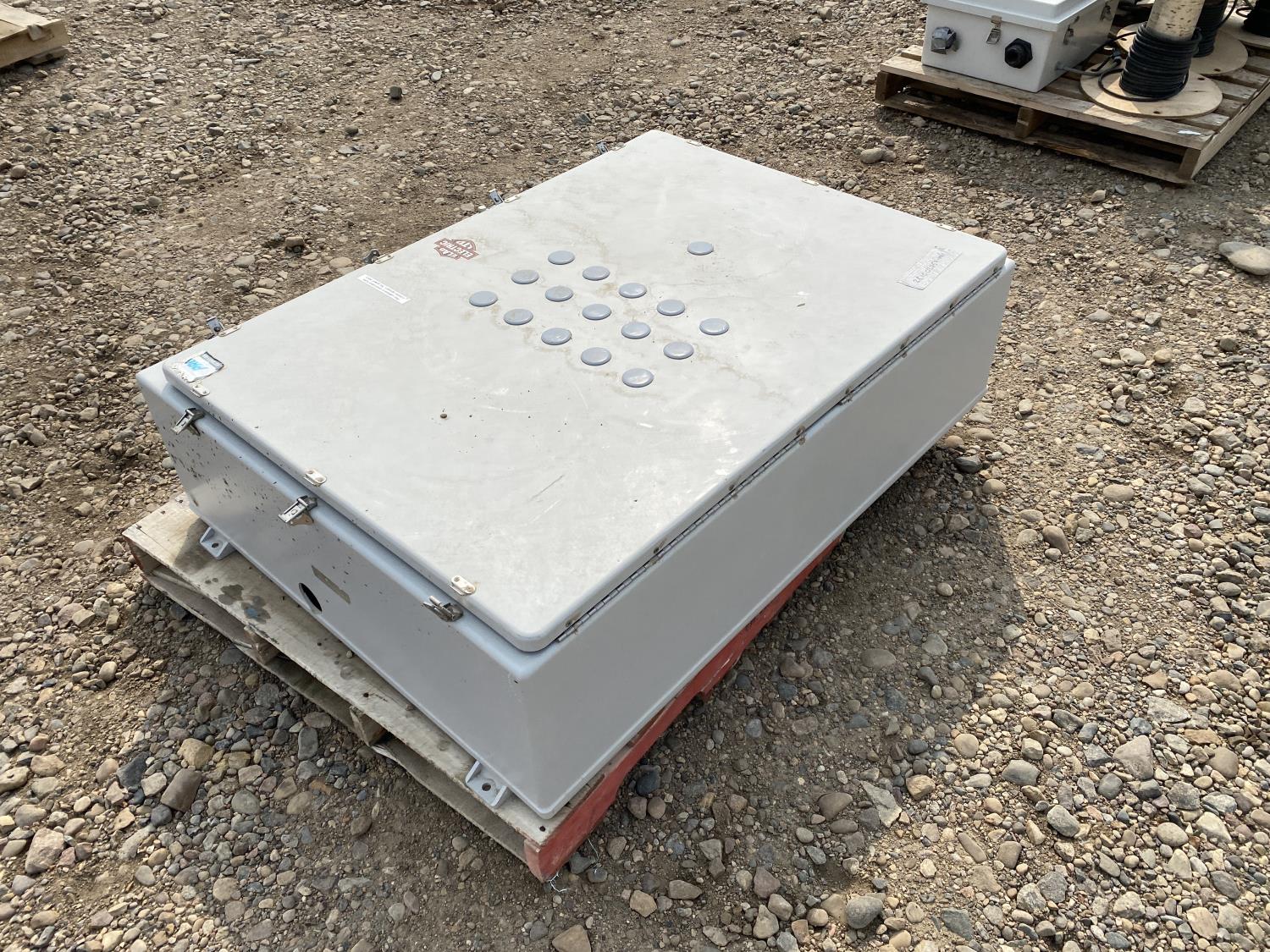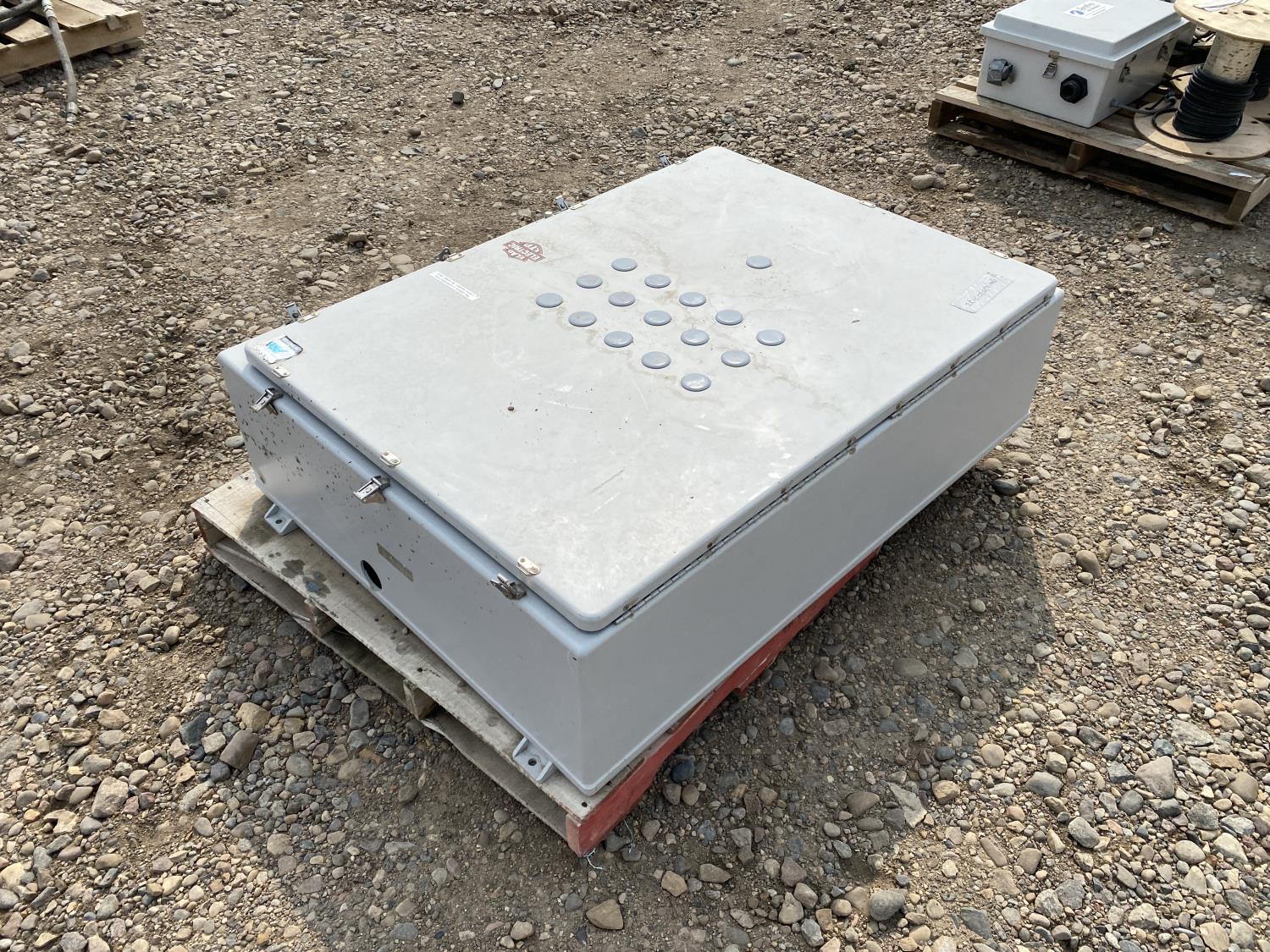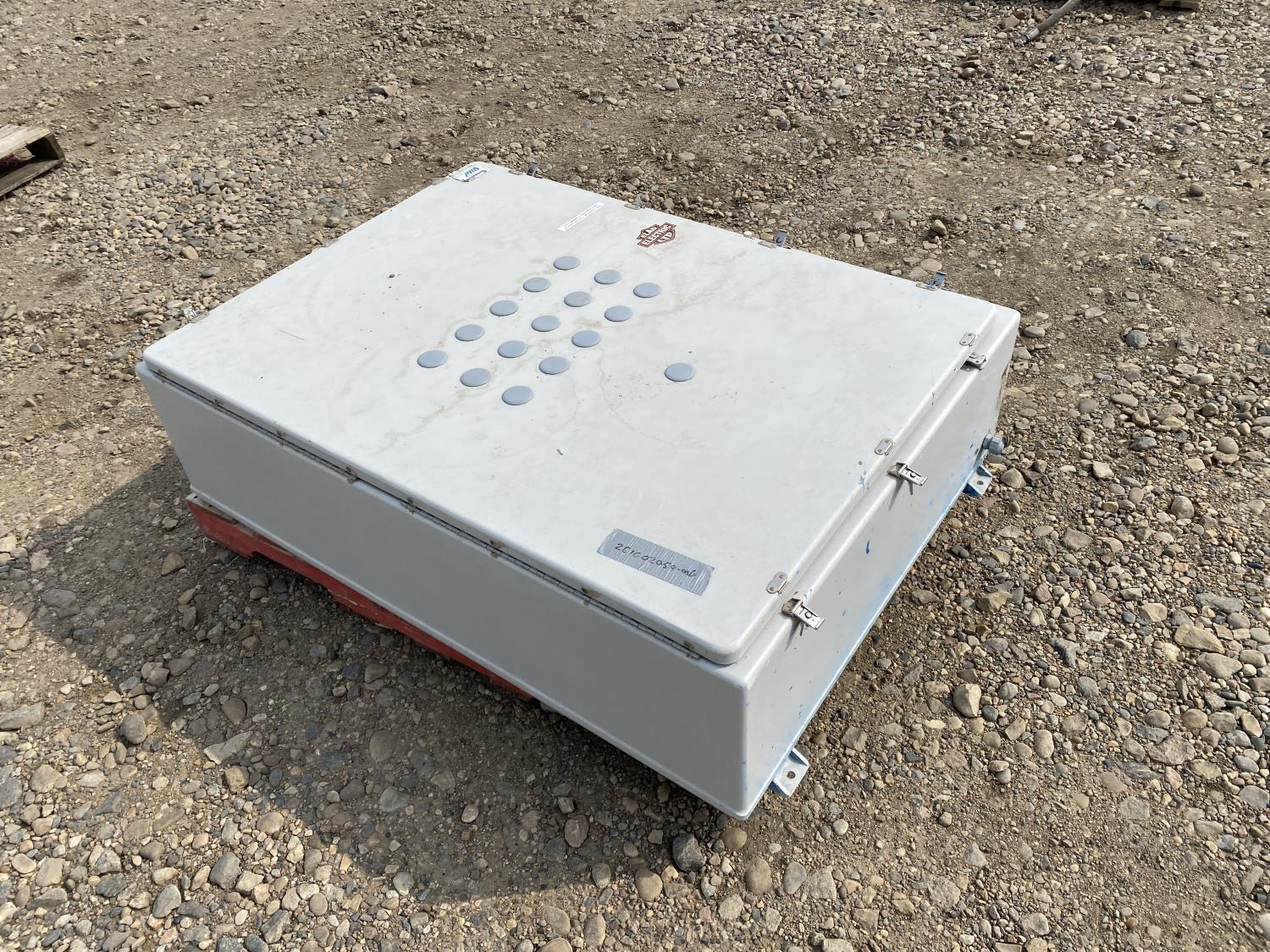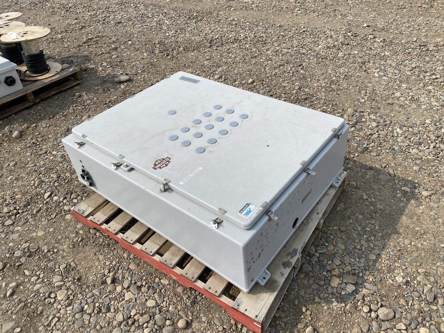 120v single phase ac, 24v DC input. Measures 3 ft L x 4 ft T x 14 inch W