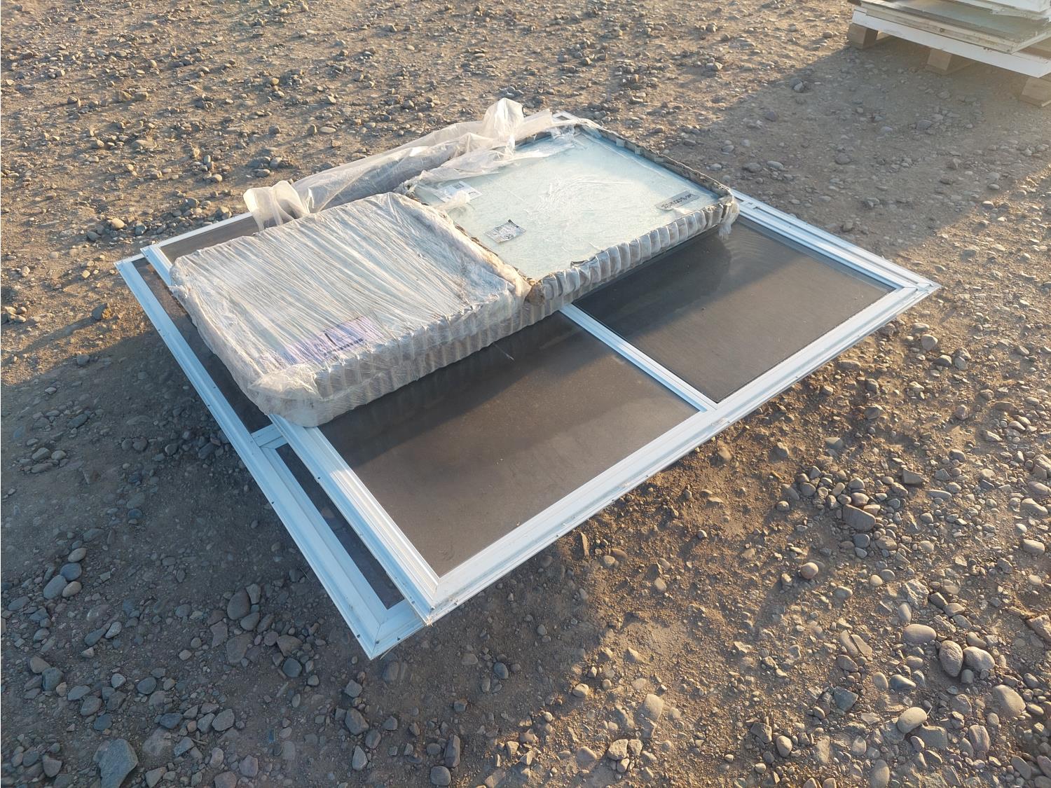 (1) 58 inch W x 61 inch T window, (1) 65 inch W x 61 inch T window, (1) 24 inch W x 48 inch T window glass, (2) 24 inch W x 25 inch T window glass, includes glass frames