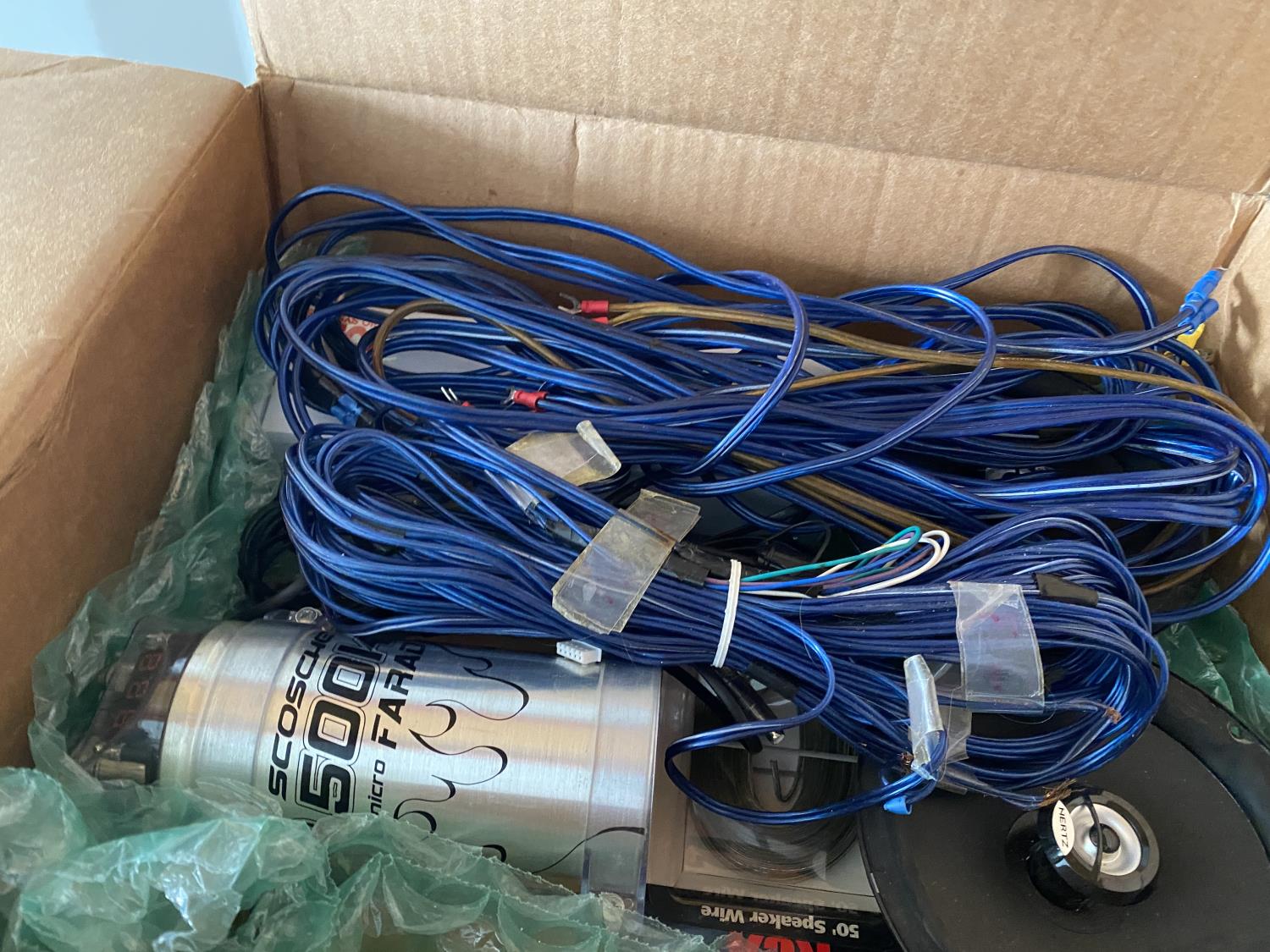 includes wiring, RCA cables, Scosche capacitor, Hertz speaker
