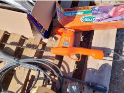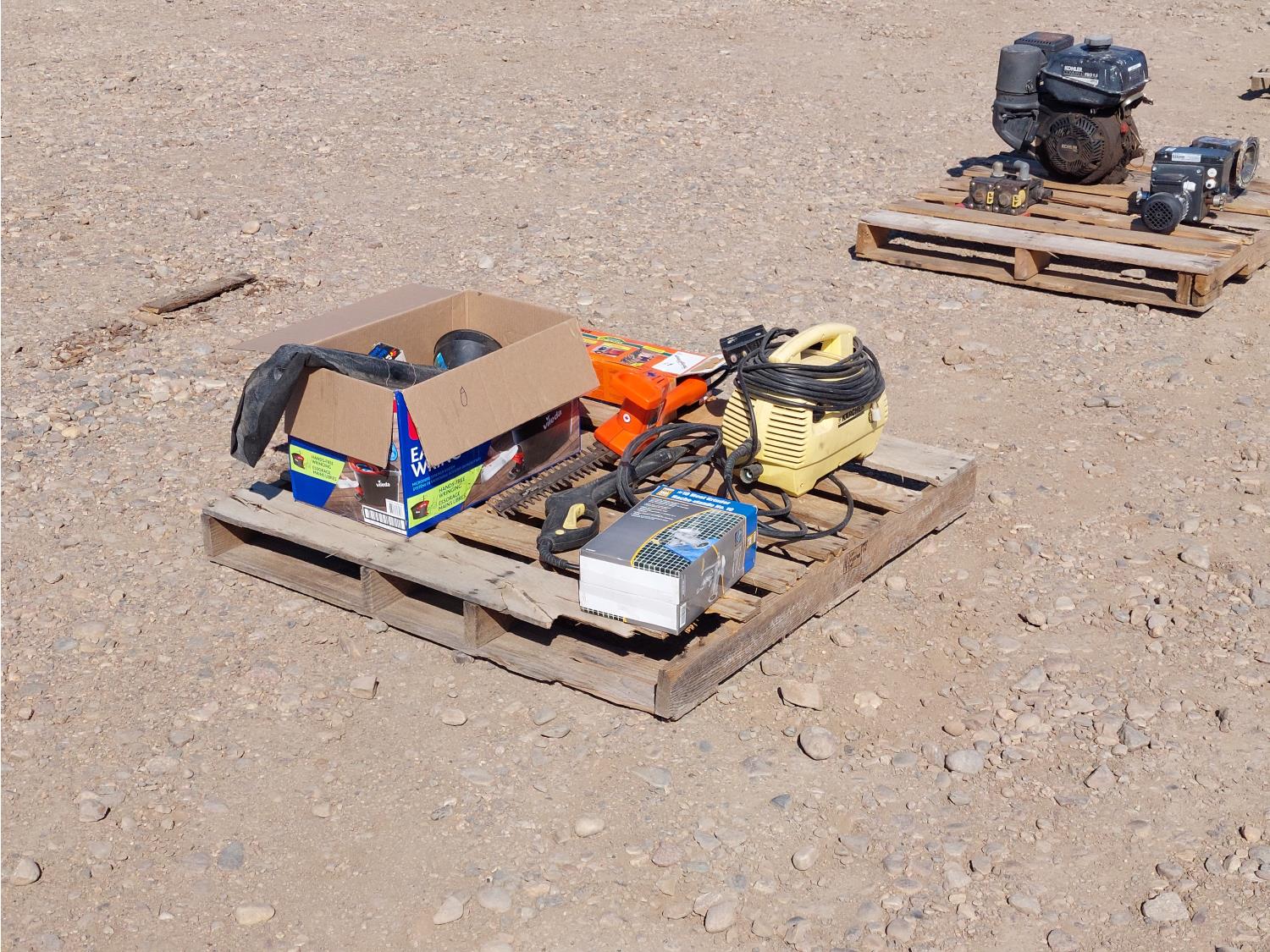 Includes: Karcher 1.3 GPM 120v pressure washer w/ wand, Black & Decker cordless hedge trimmer, Power Fist meat grinder, soldering iron