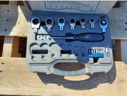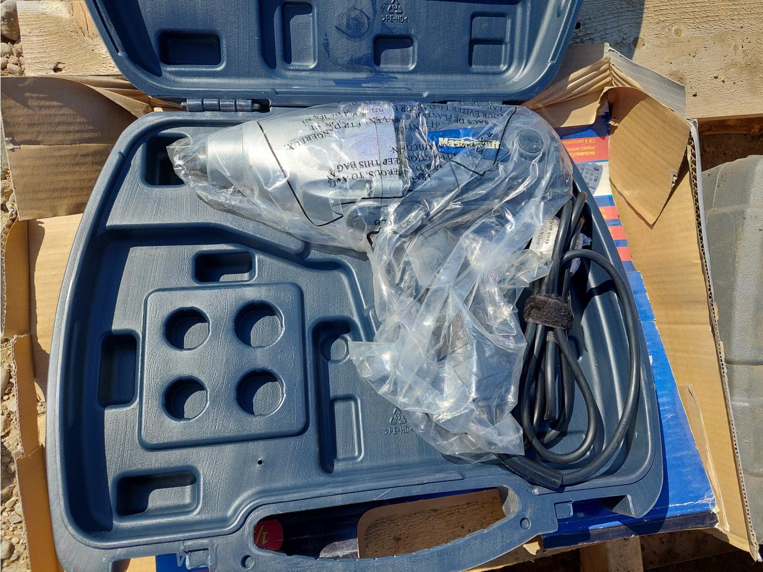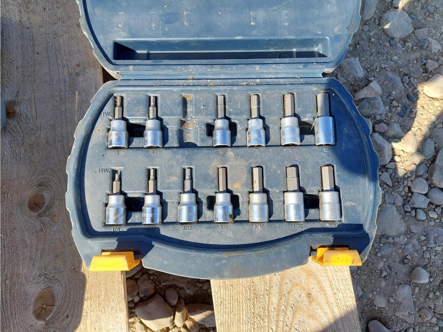 includes (2) 18V 1/2 inch impact wrench kits, 120V, 1/2 inch impact wrench kit, bit socket set, ratchet wrench set, and 120V angle grinder