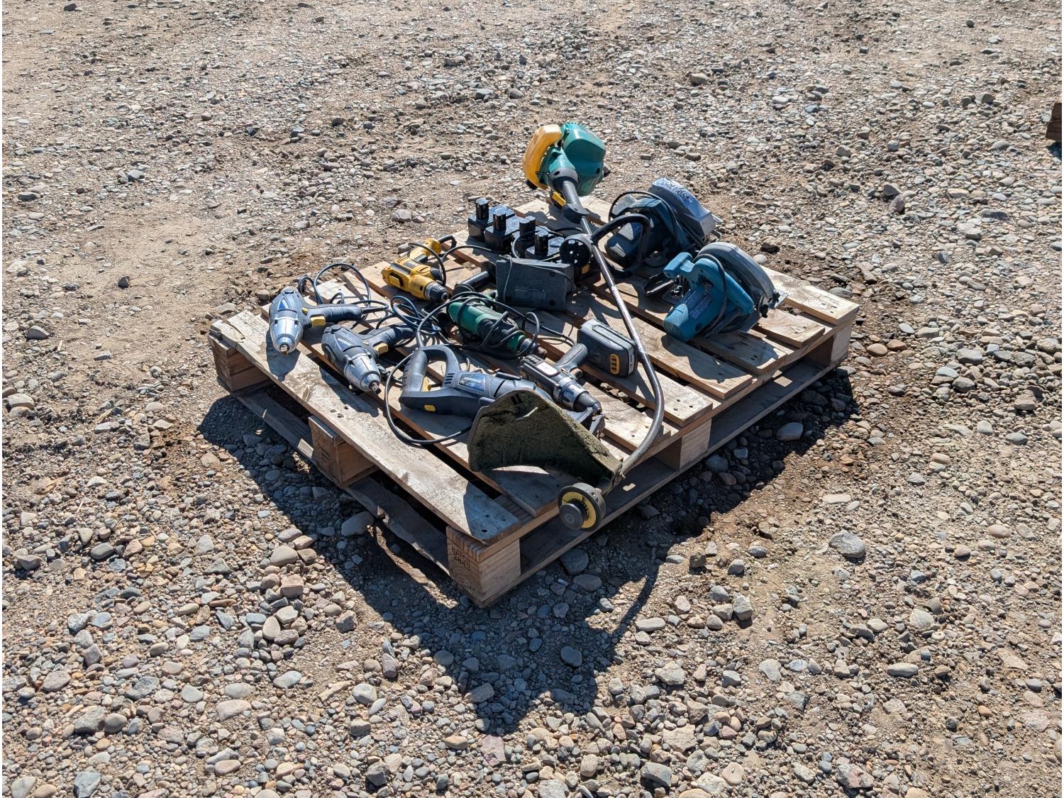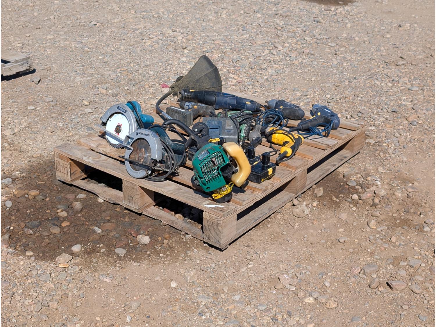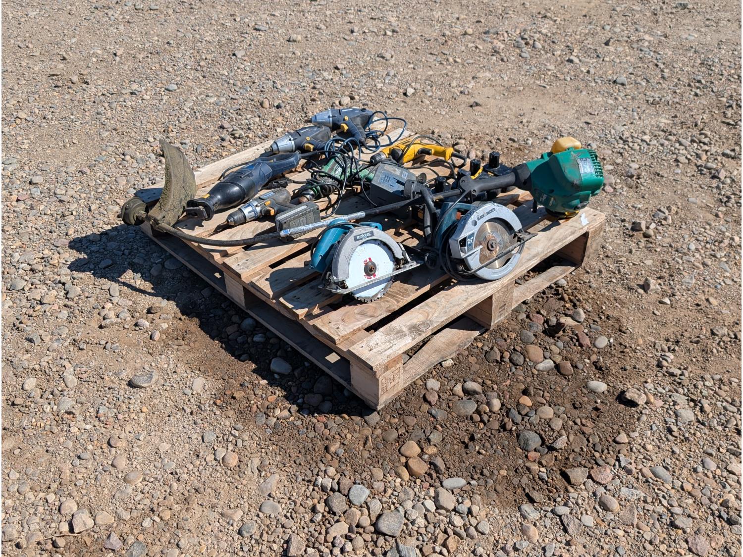 includes: (2) circular saws, (2) impact guns, (2) corded drills, (1) Cordless drill, (1) reciprocating saw, (1) gas string trimmer, (5) Craftsman 18v batteries w/ charger