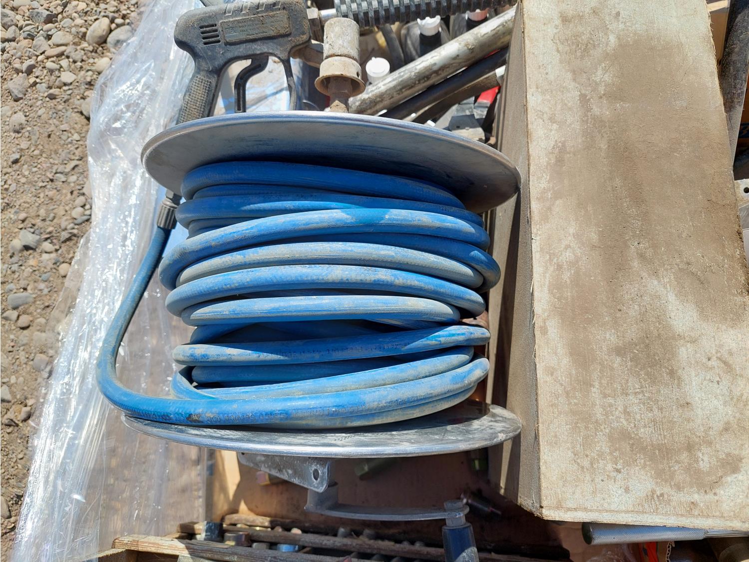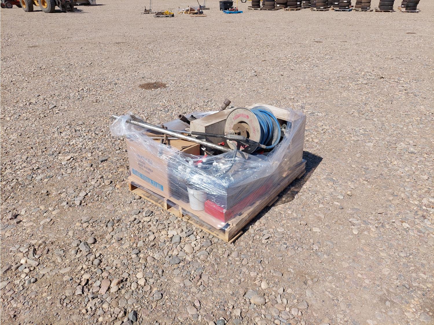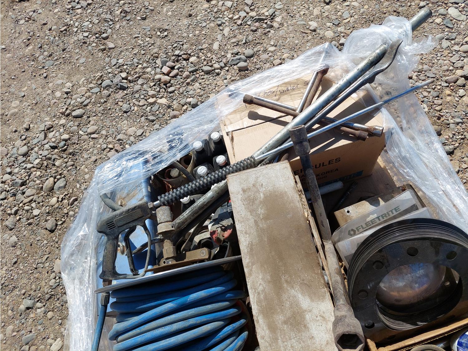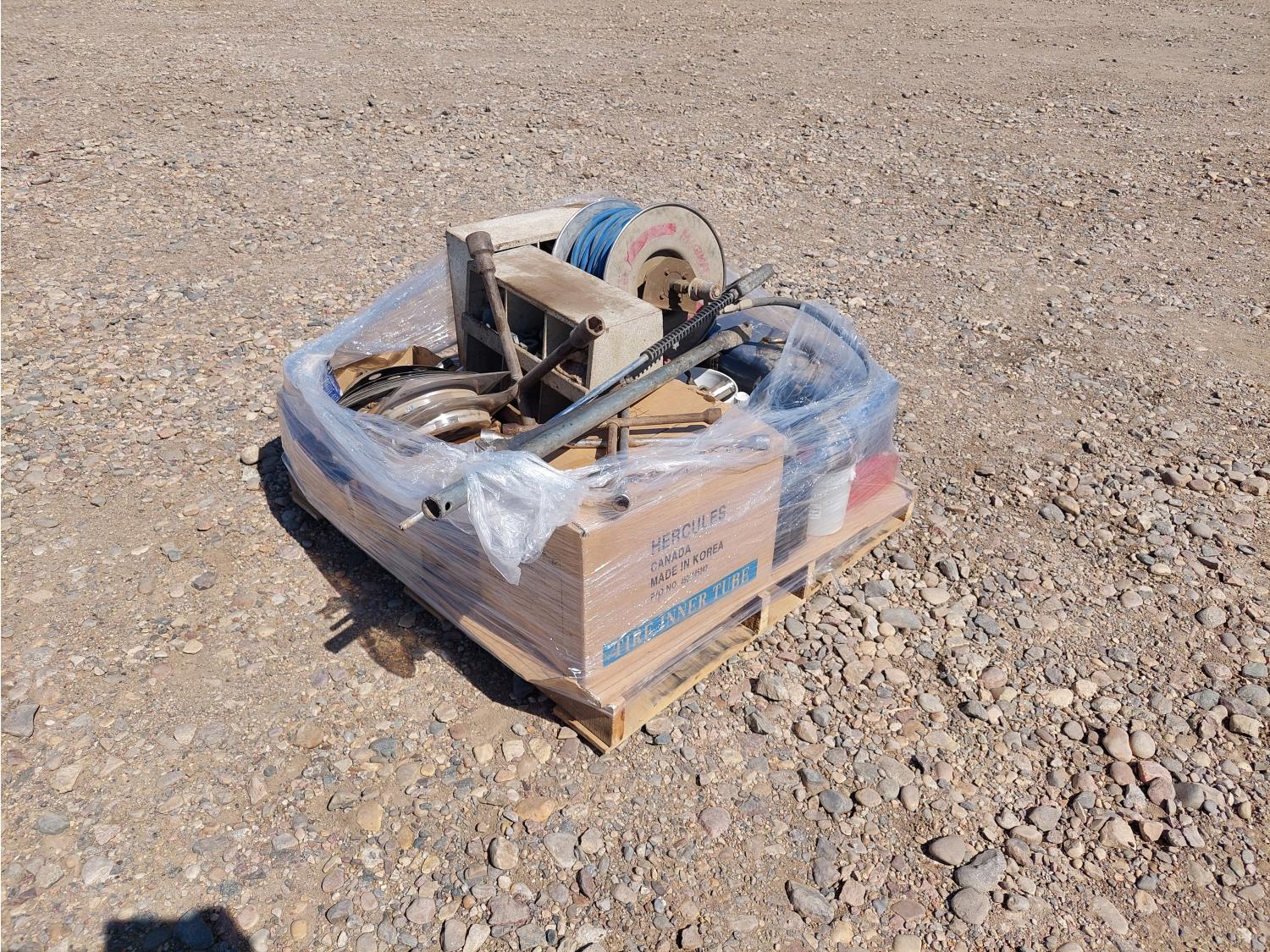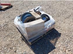 hose reel w/ 1/2 inch air hose, qty of miscellaneous sockets, tire iron, crowbar, pressure washer wand, compressor oil, miscellaneous pulley and hardware