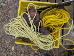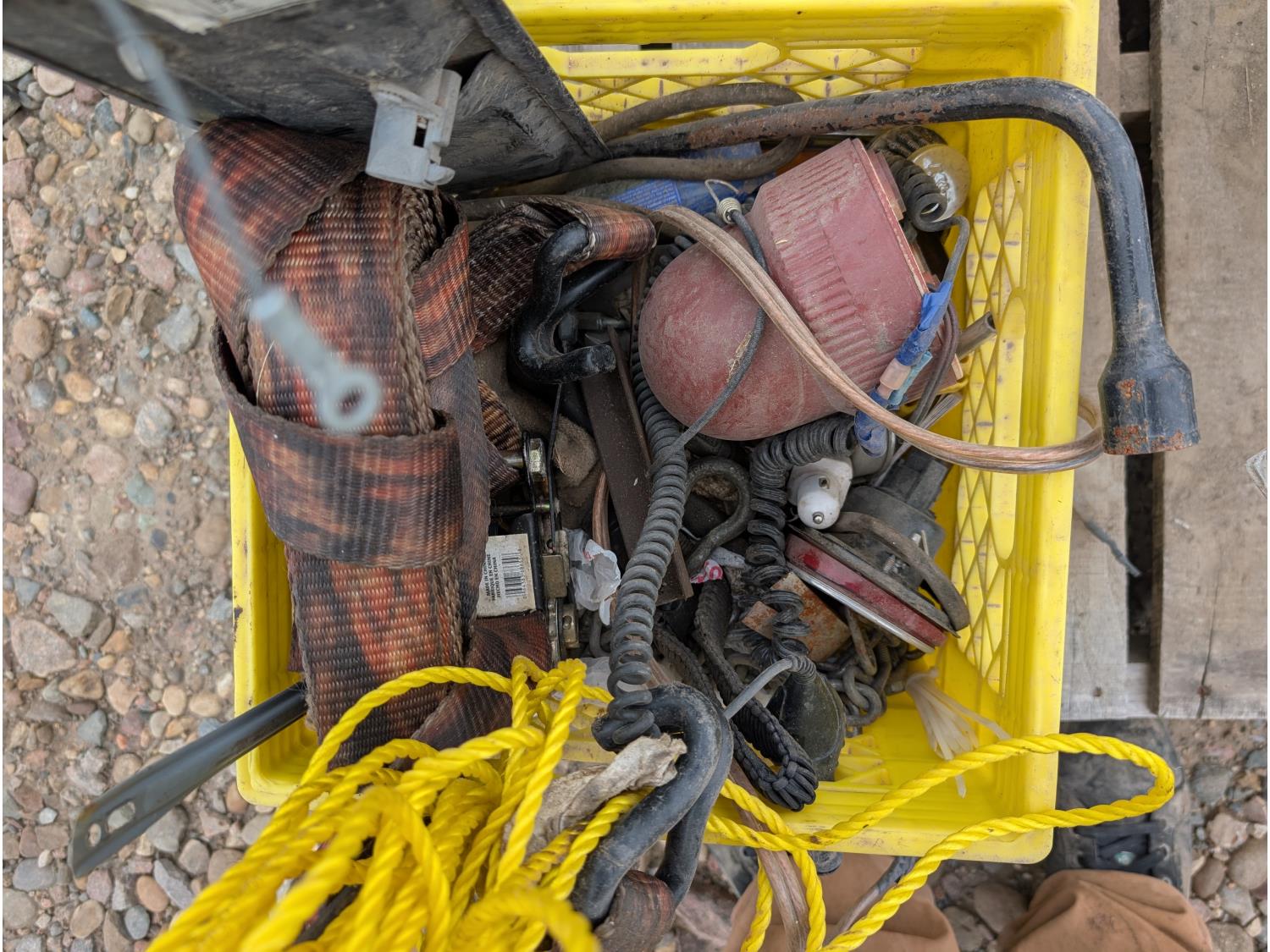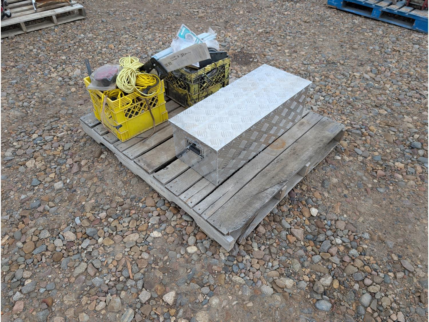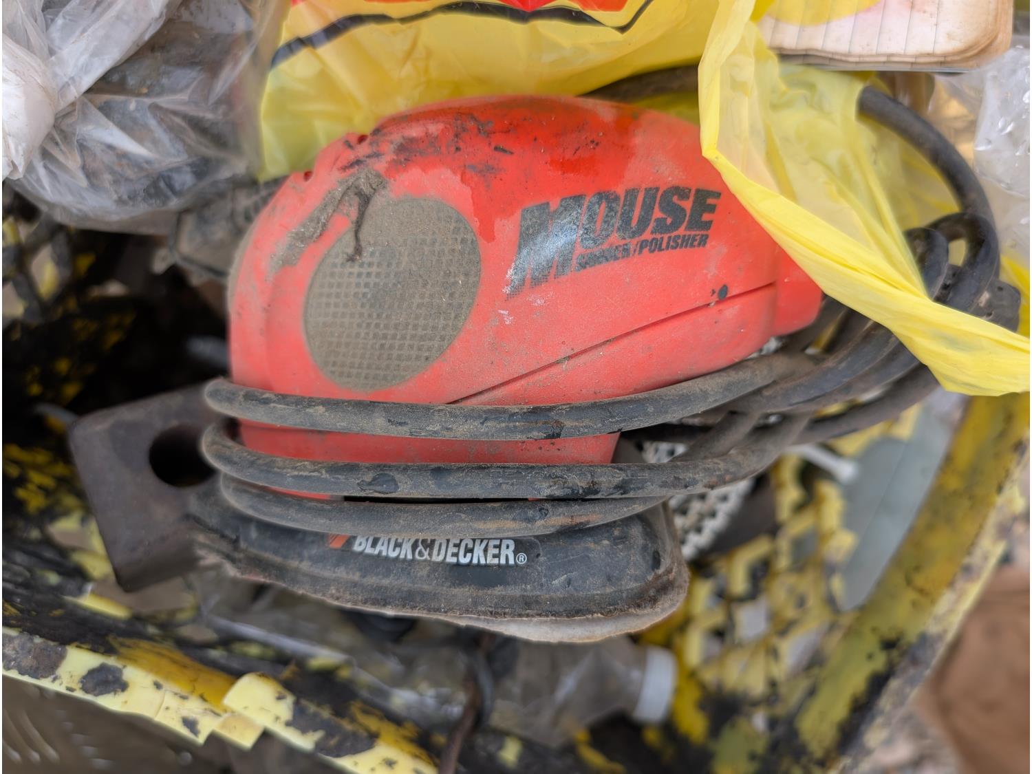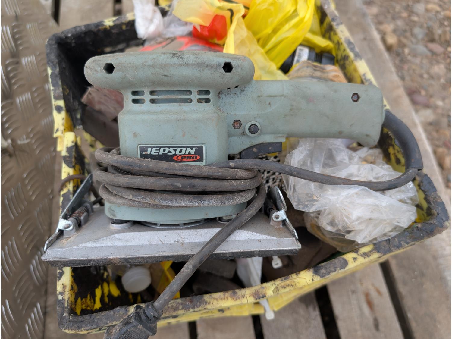 Toolbox: 31 inch L x 13 inch W x 10 inch T, includes Qty of miscellaneous rope & straps, miscellaneous electrical parts, Jepson 120v sander, Black & decker 120v sander,