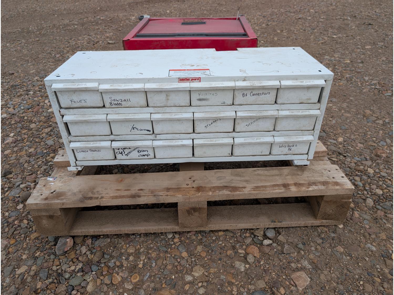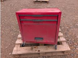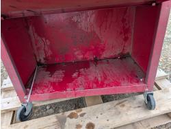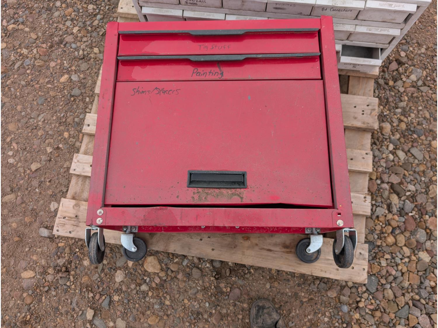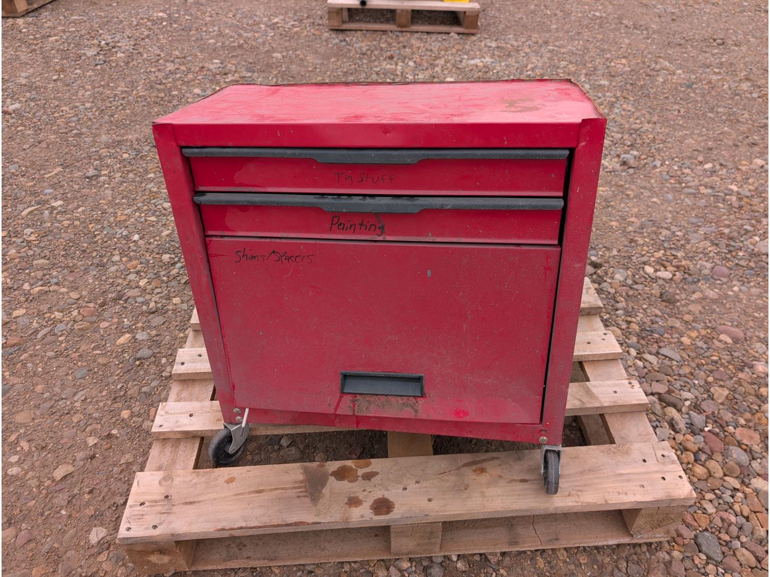 tool cart: 24 inch L x12 inch W x 22 inch H. storage cabinet: 33 inch L x 12 inch W x 13 inch H, holds 18 bins. miscellaneous welding rods.