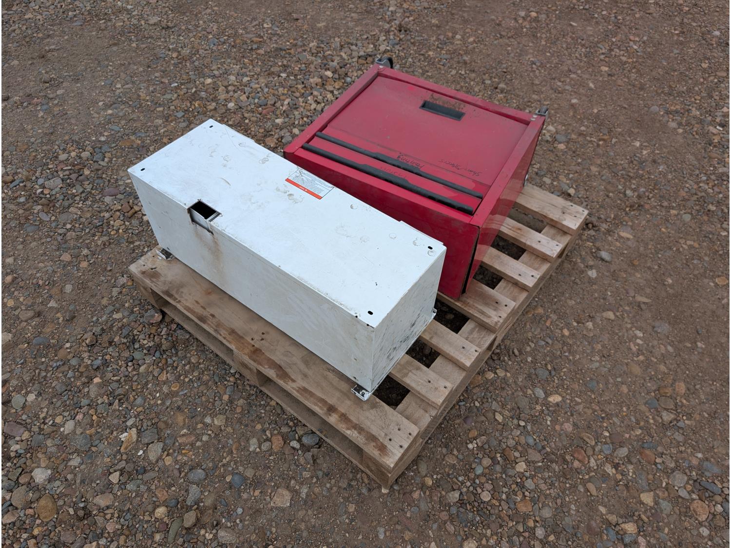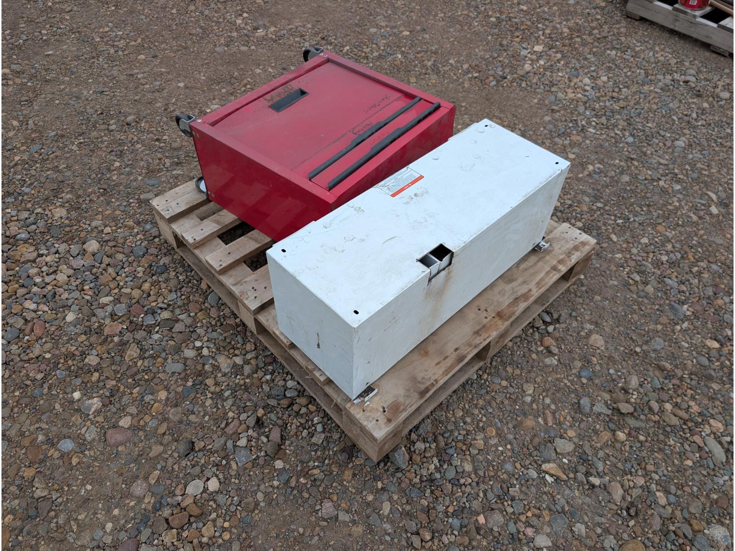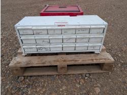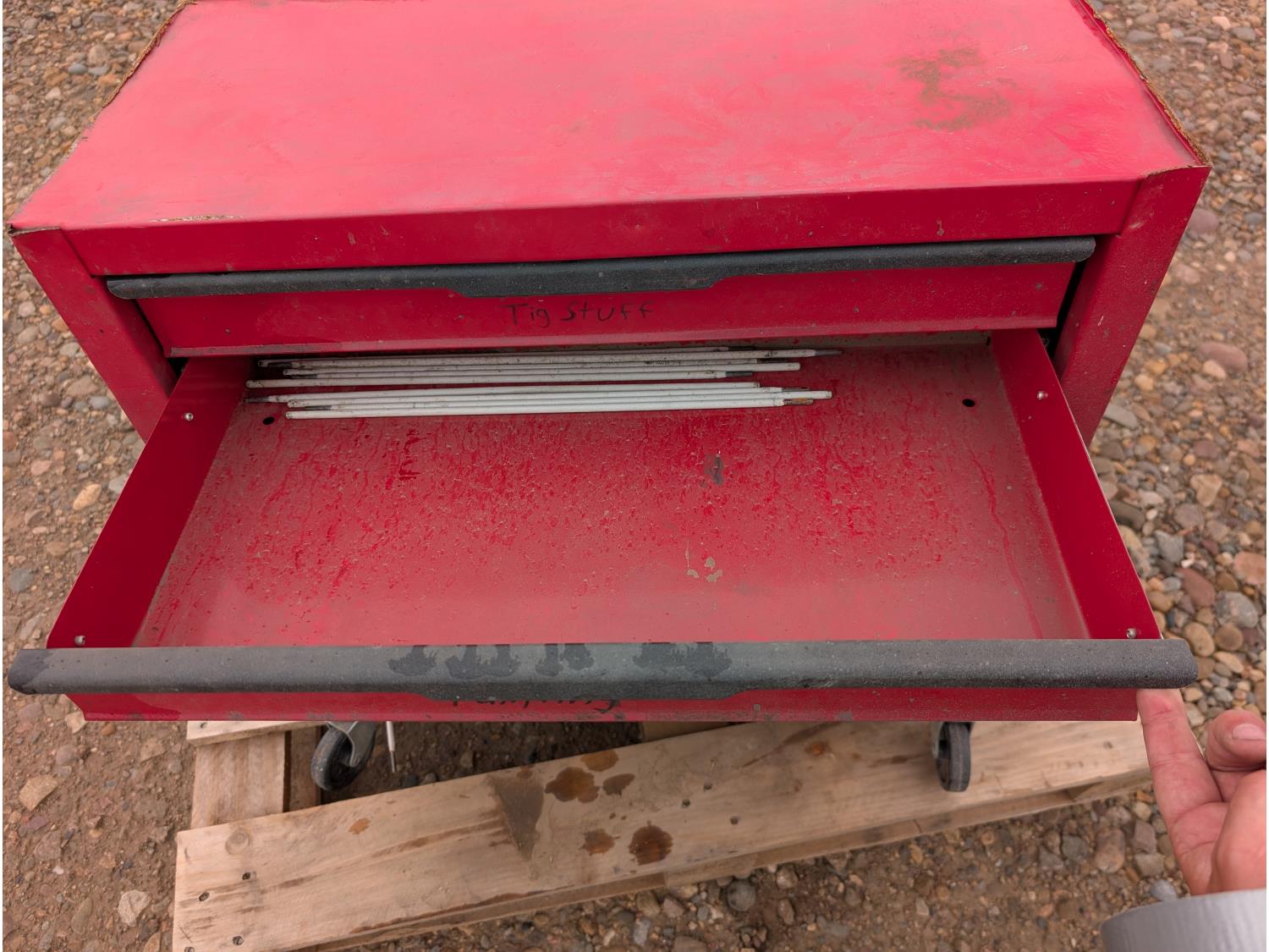 tool cart: 24 inch L x12 inch W x 22 inch H. storage cabinet: 33 inch L x 12 inch W x 13 inch H, holds 18 bins. miscellaneous welding rods.