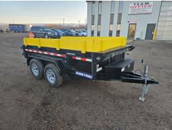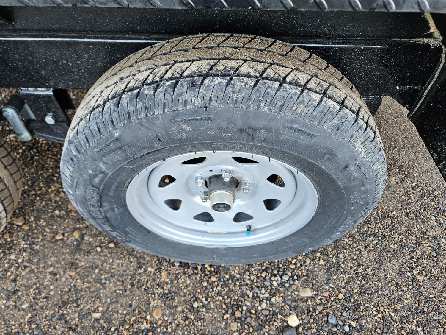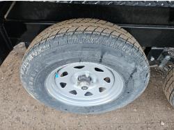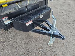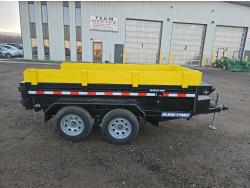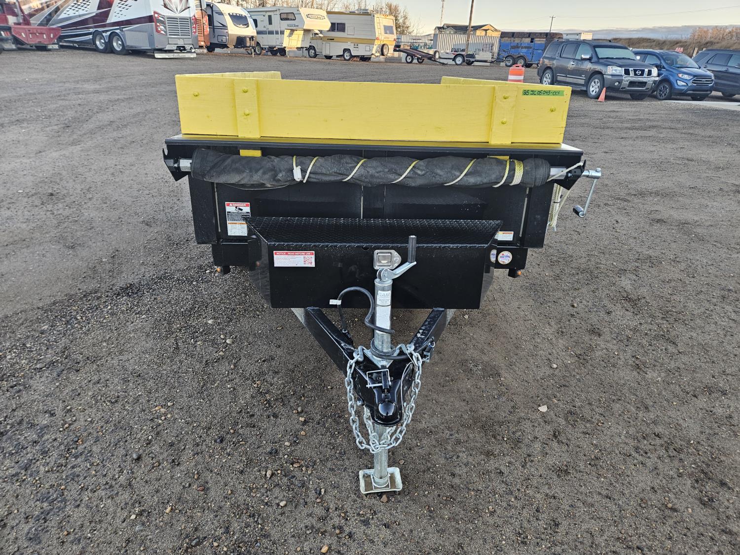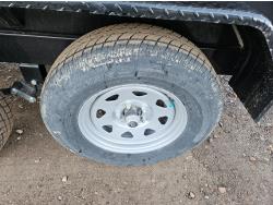 Ball hitch, 62 inch box width, 26 inch side wall height, roll tarp, corded lift remote, electric brakes, spring suspension, 3,500 lb axles, tie down d rings, 205/75R15 tires