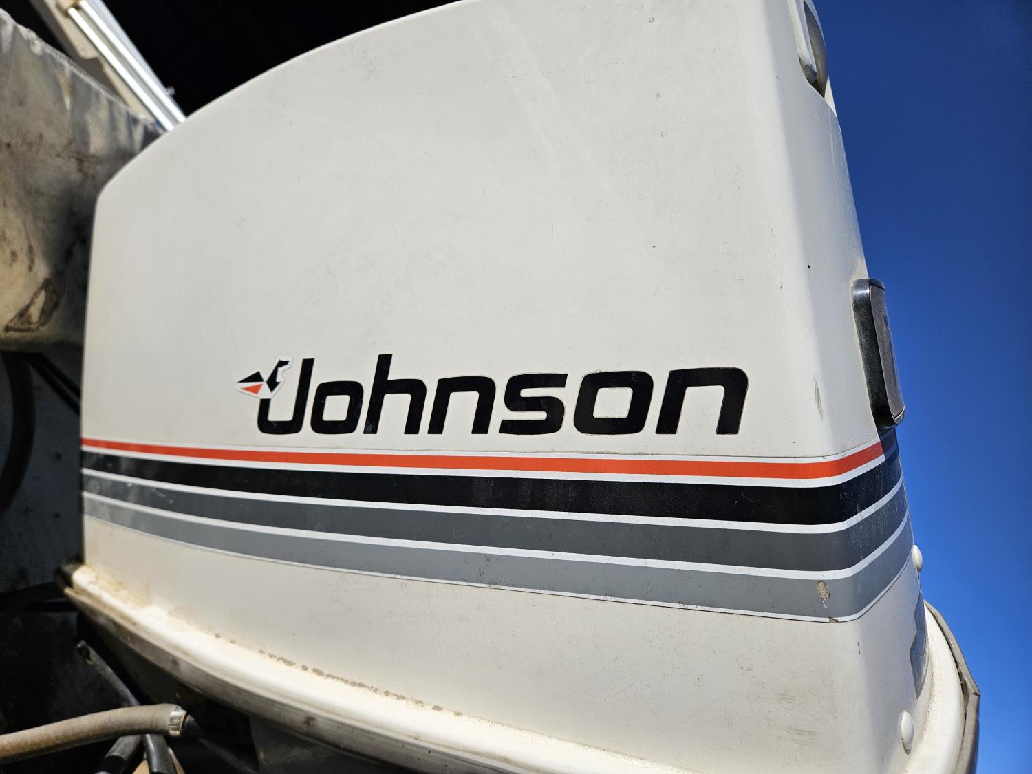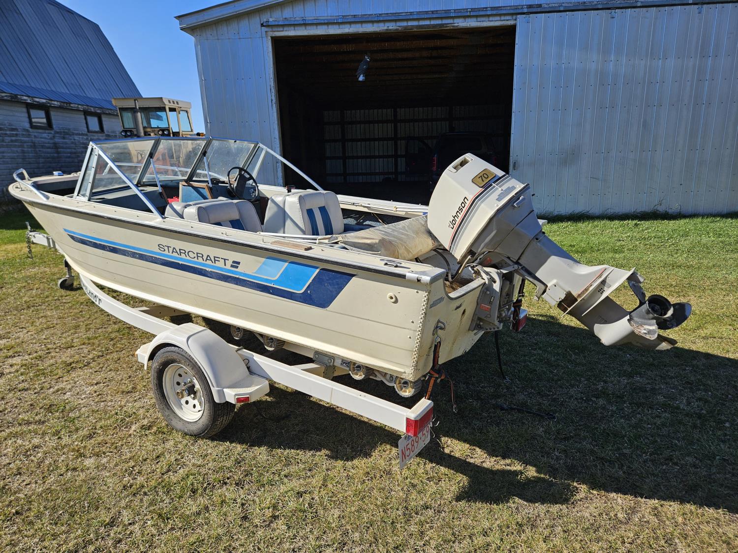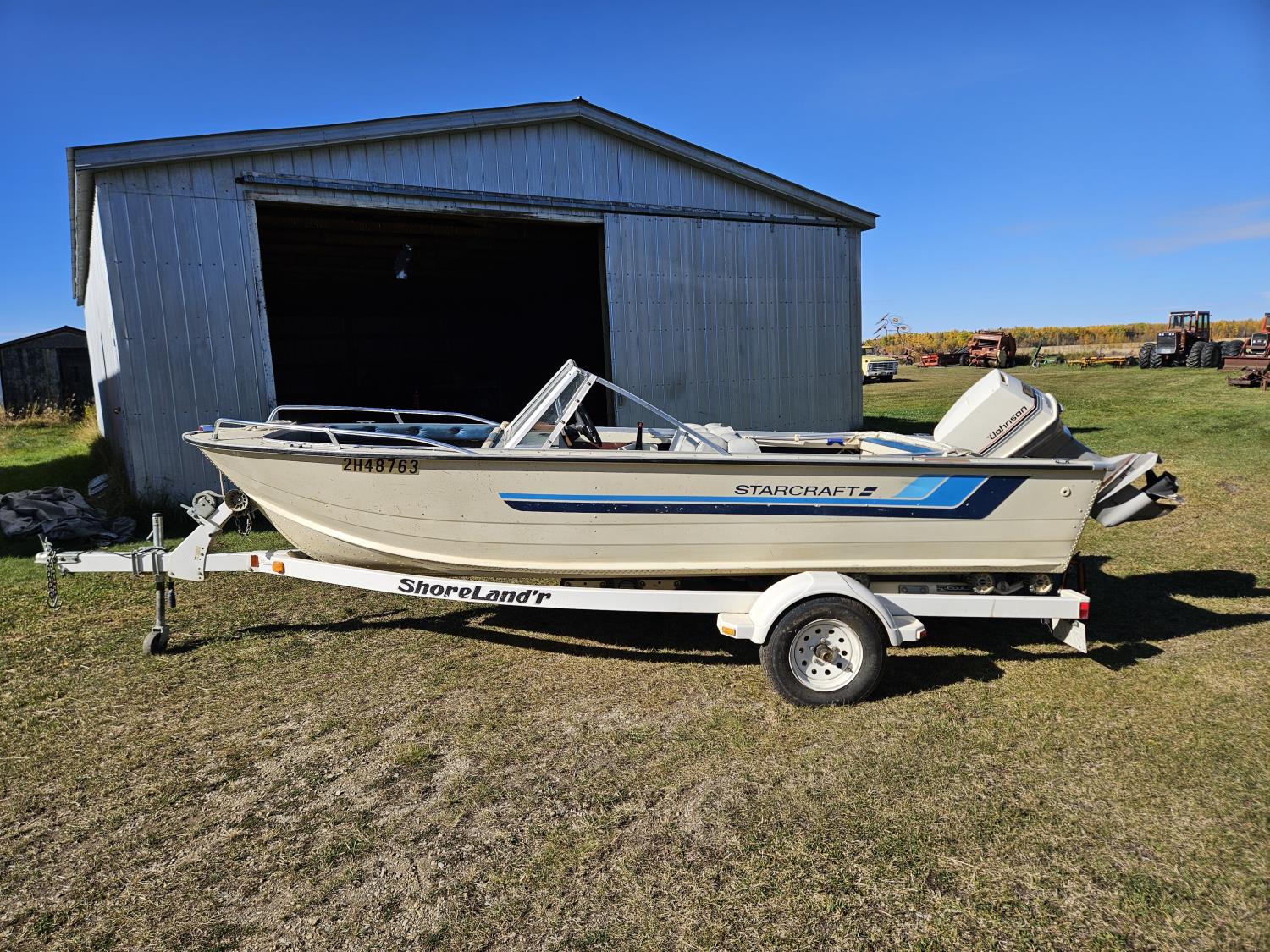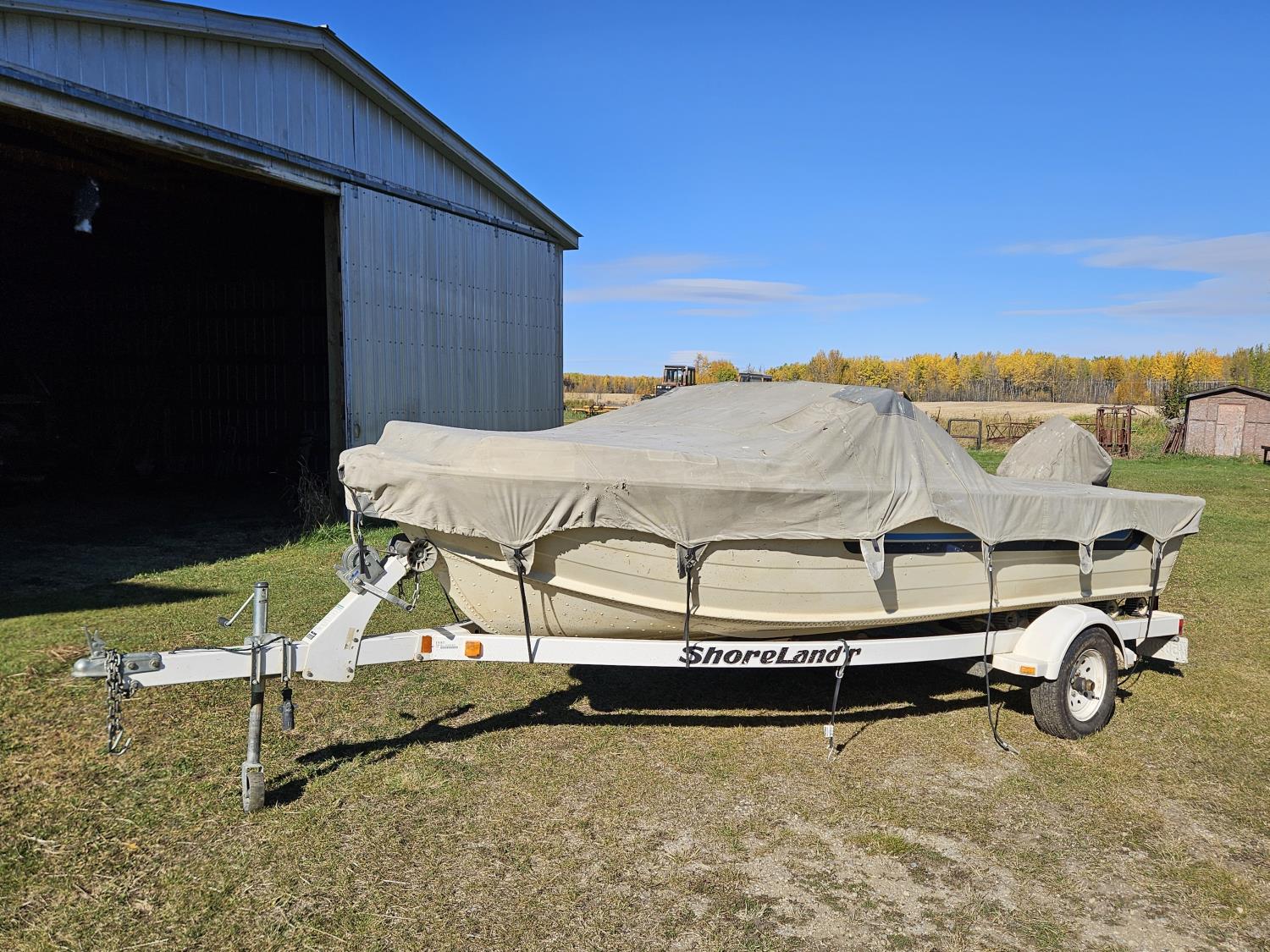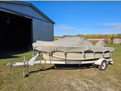 Johnson 70 HP outboard motor, seats 6, life jackets, 2 steel fuel tanks, Minn Kota trolling motor, cover, 1996 ShoreLand'r S/A trailer, 175/80R13 tires, stored indoors, ran when parked