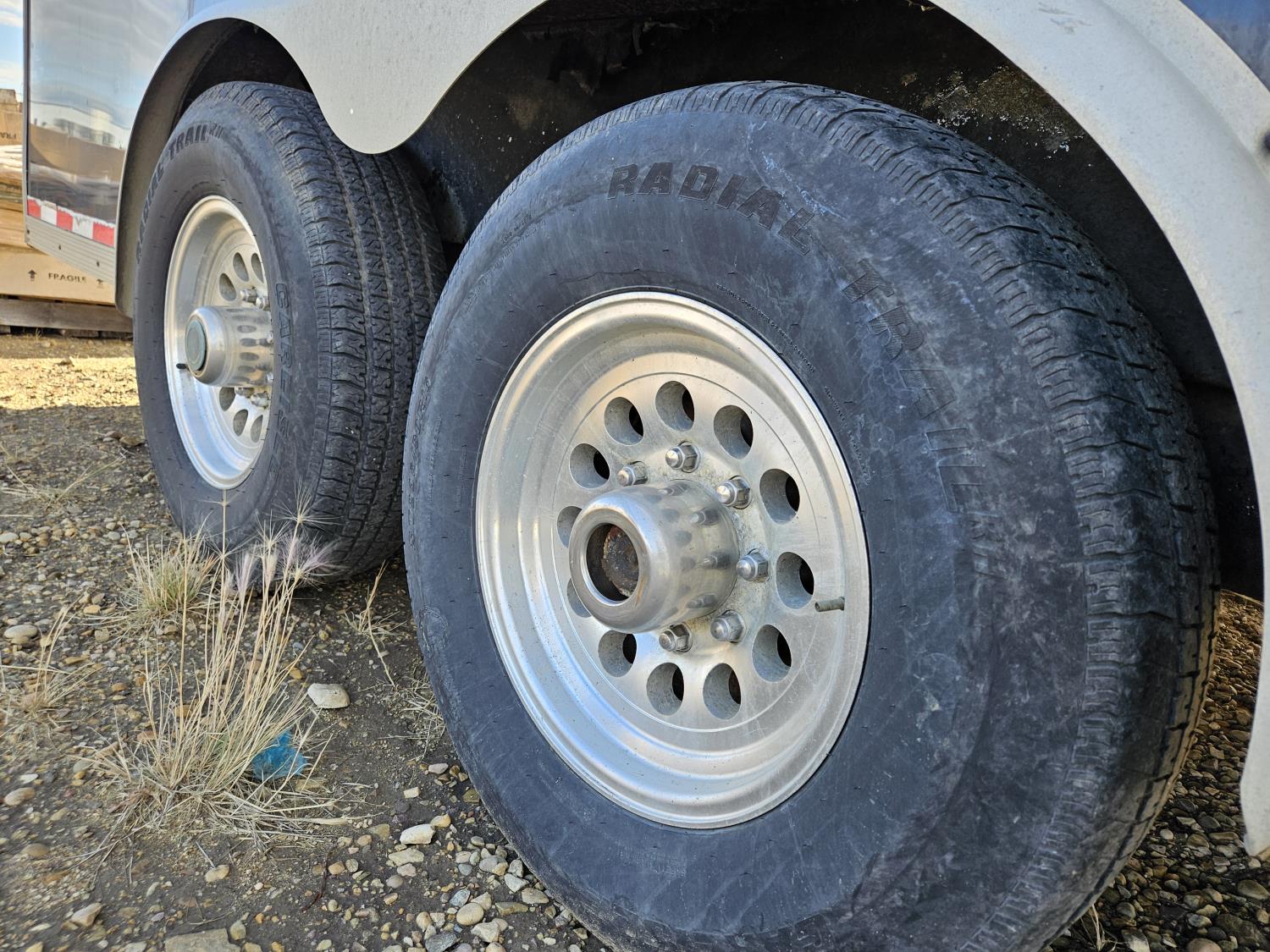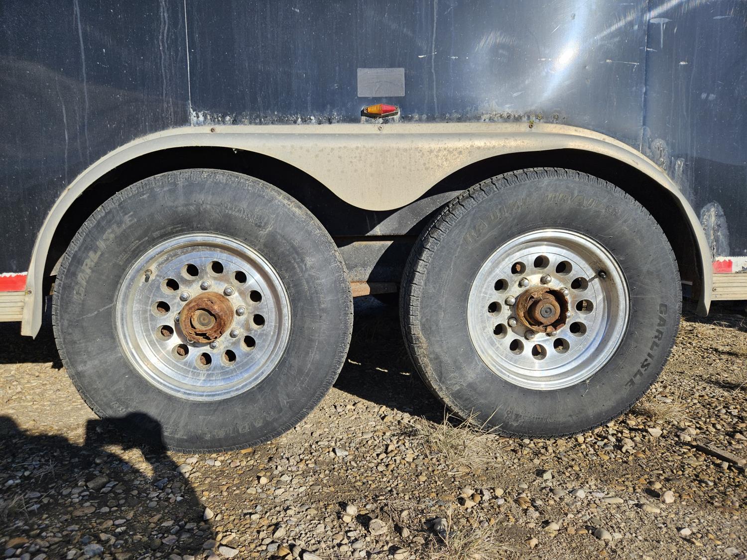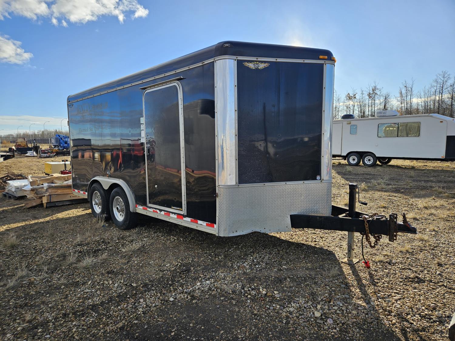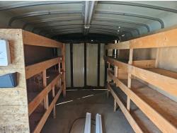 7 inch interior width, ball hitch, side door, fold down door, electric brakes, spring suspension, shelving, LED interior lighting, electric space heater, 7000 lb axles, 235/80R16 tires