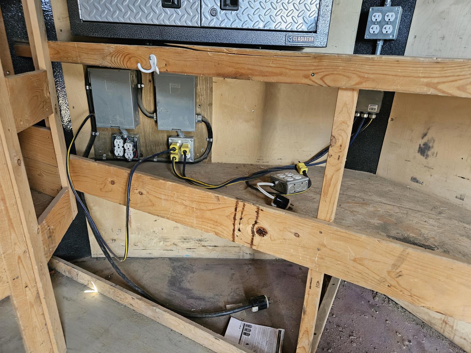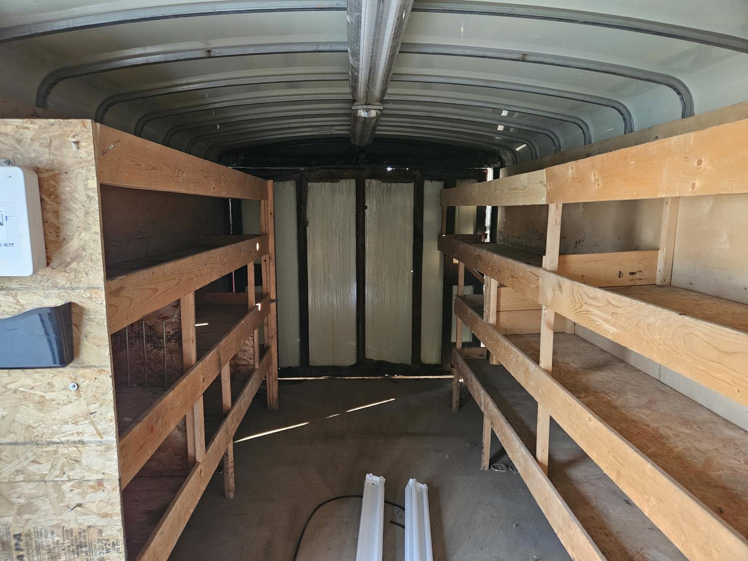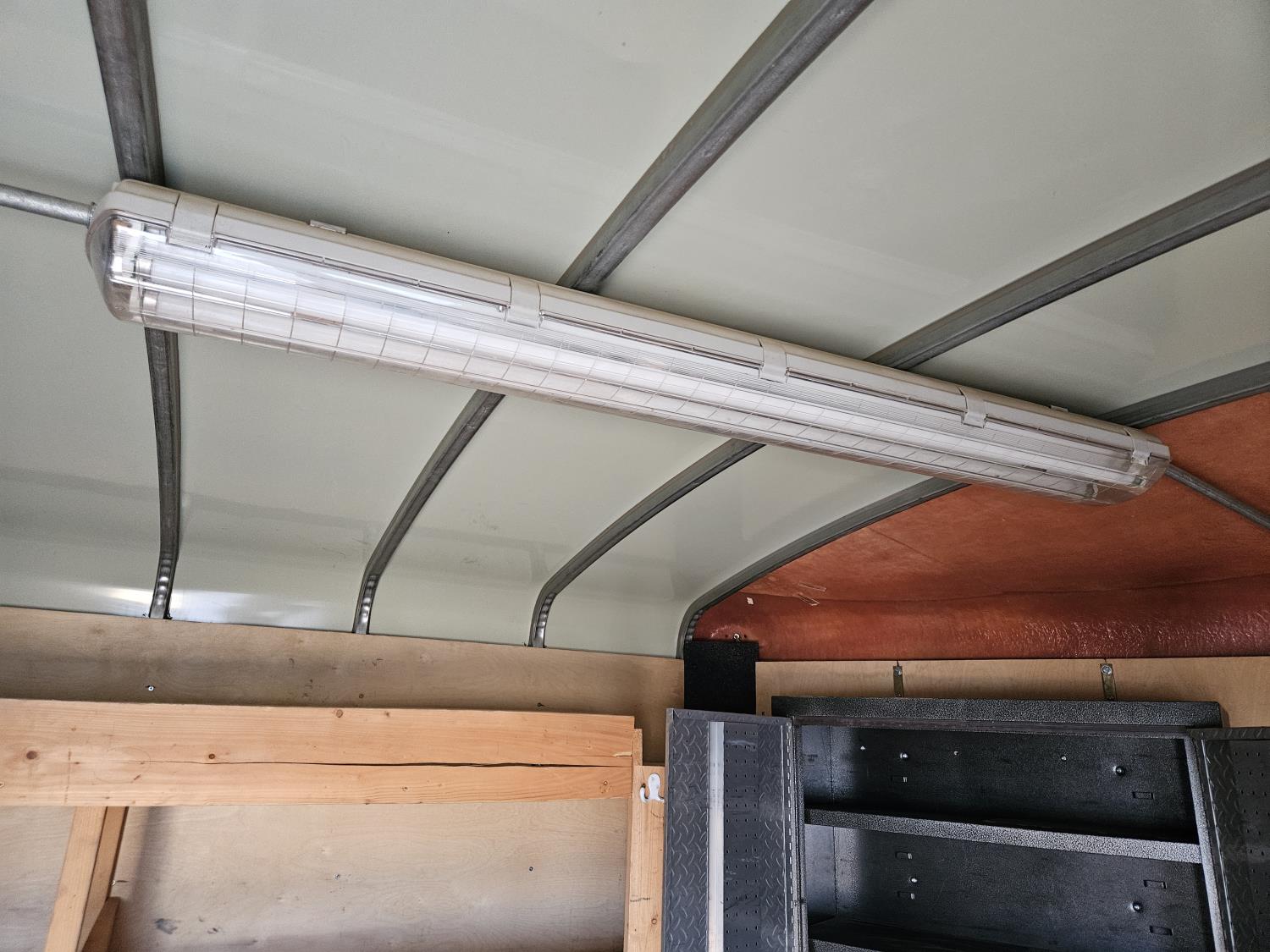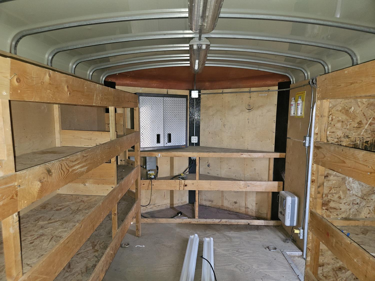7 inch interior width, ball hitch, side door, fold down door, electric brakes, spring suspension, shelving, LED interior lighting, electric space heater, 7000 lb axles, 235/80R16 tires