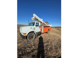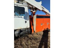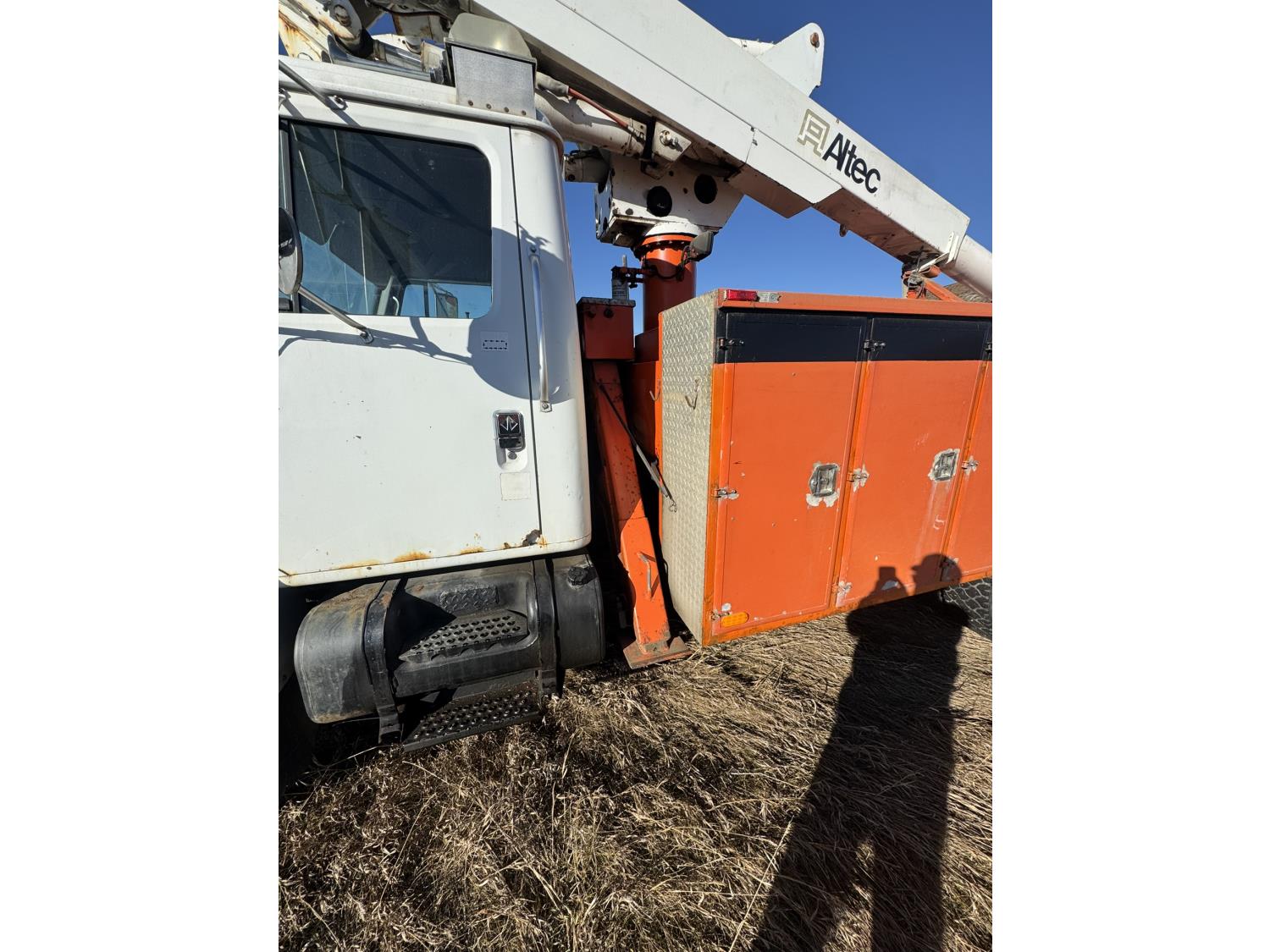 466 cu in diesel engine, Eaton Fuller 8 speed manual transmission, air ride driver seat, radio, stereo, Altec straight boom crane, new alternator, 37 ft reach man basket, last inspection 2022, winter bypass for oil heat in cold weather, winter cover for man lift, 850 lb winch on jib, renewed rotor motor on pedestal, renewed interior boom hydraulic ribbon lines (all main lines replaced), 22.5 tires