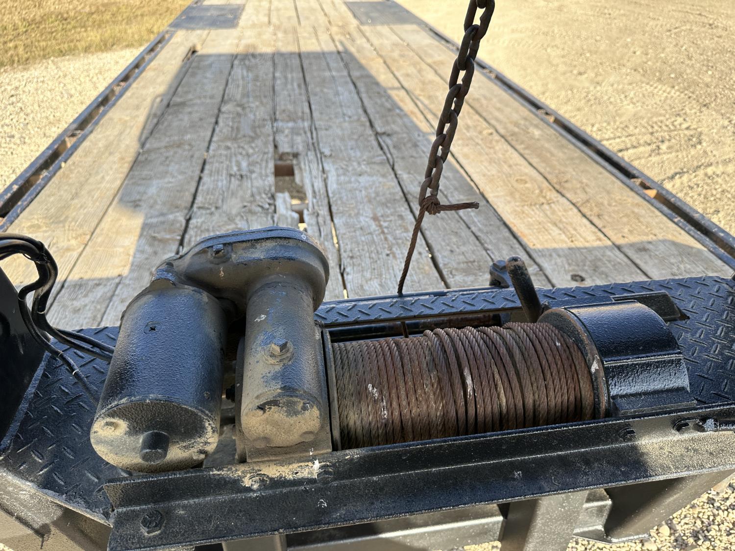 100 inch wide deck, 60 inch beaver tails, wood deck, flip over ramps, electric brakes, torsion suspension, rub rails, stake pockets, 9,000lbs winch, spare tire, 235/85R16 duals, 10000 lb axles