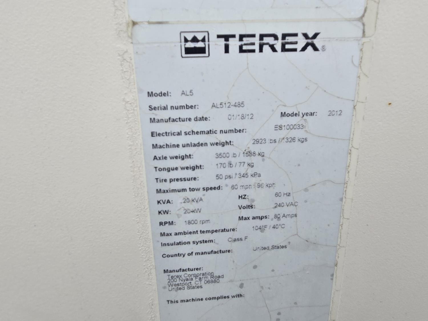 100 2012 Terex 20 Kw Towable Light Tower