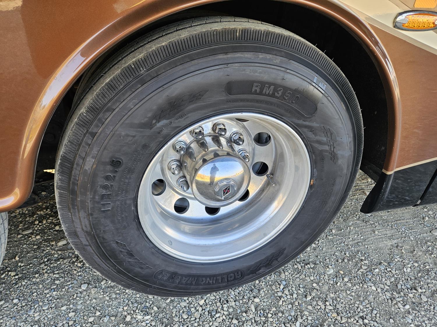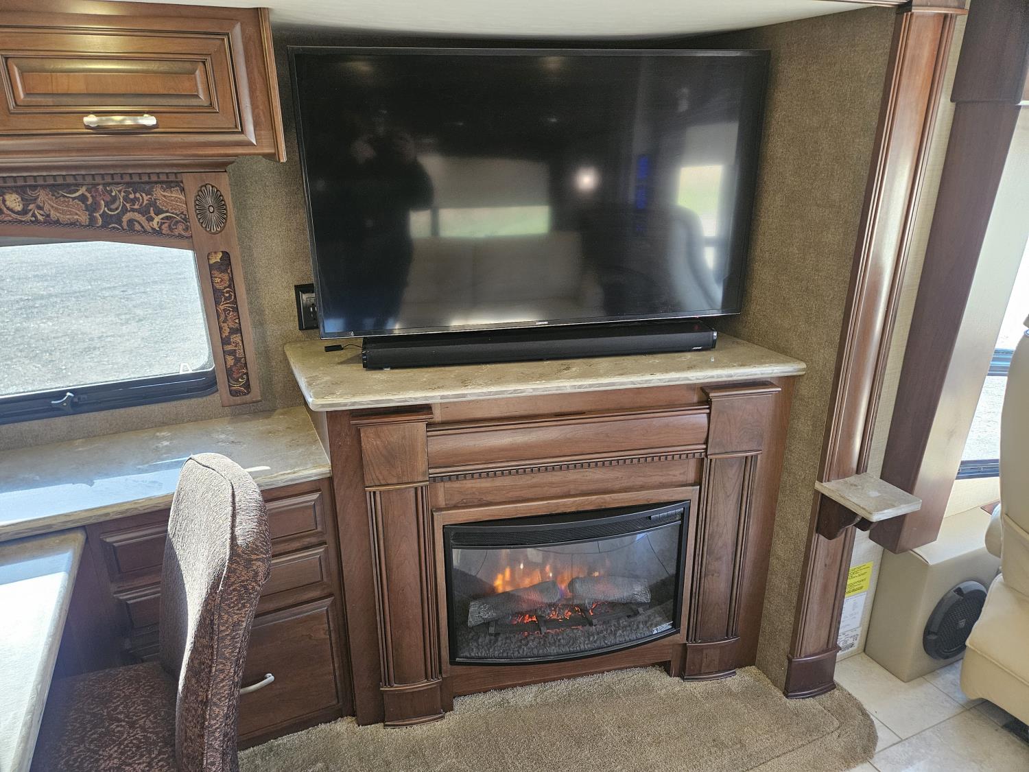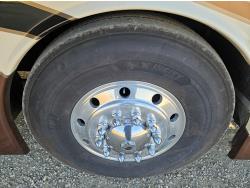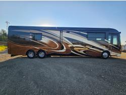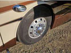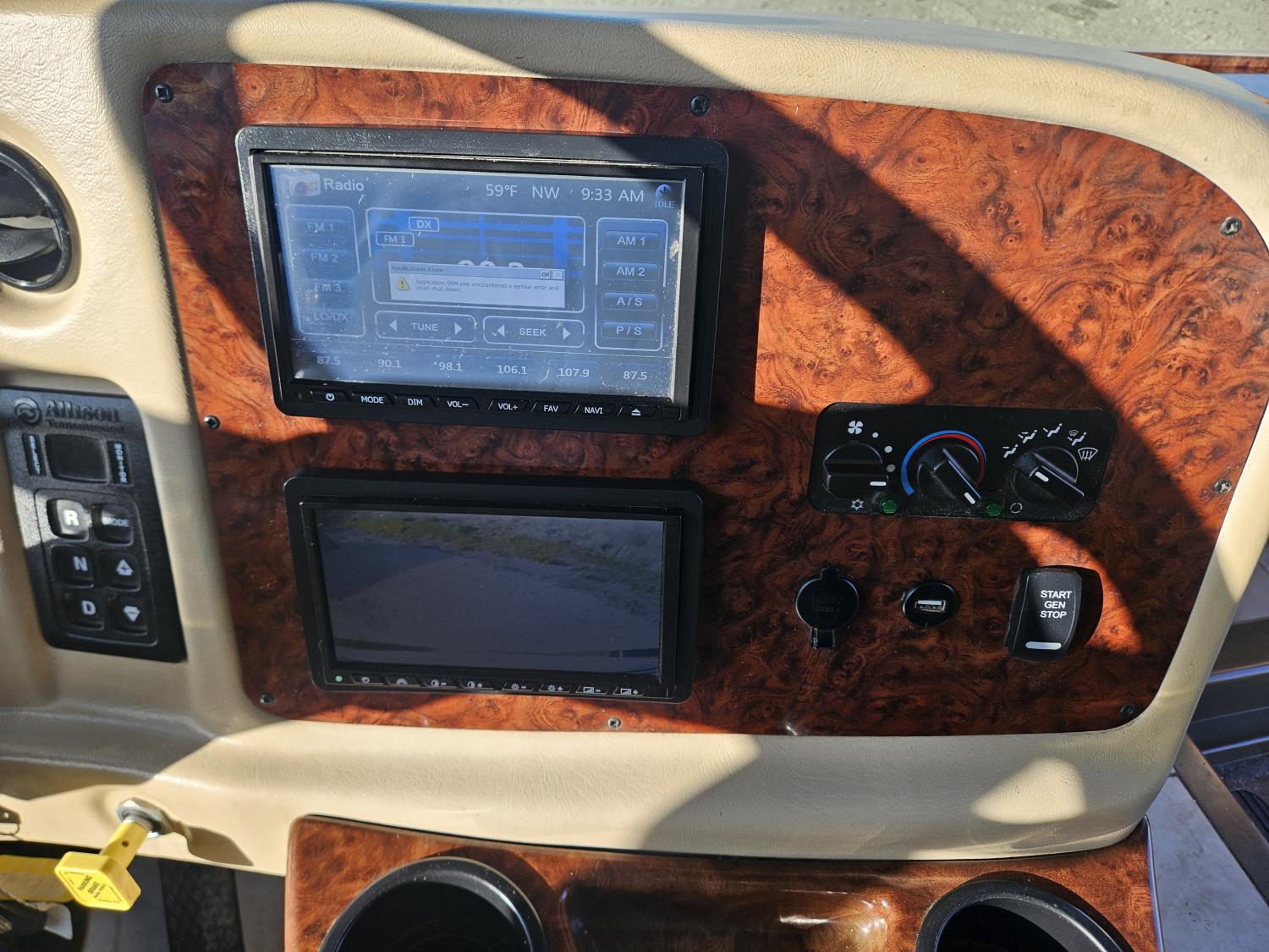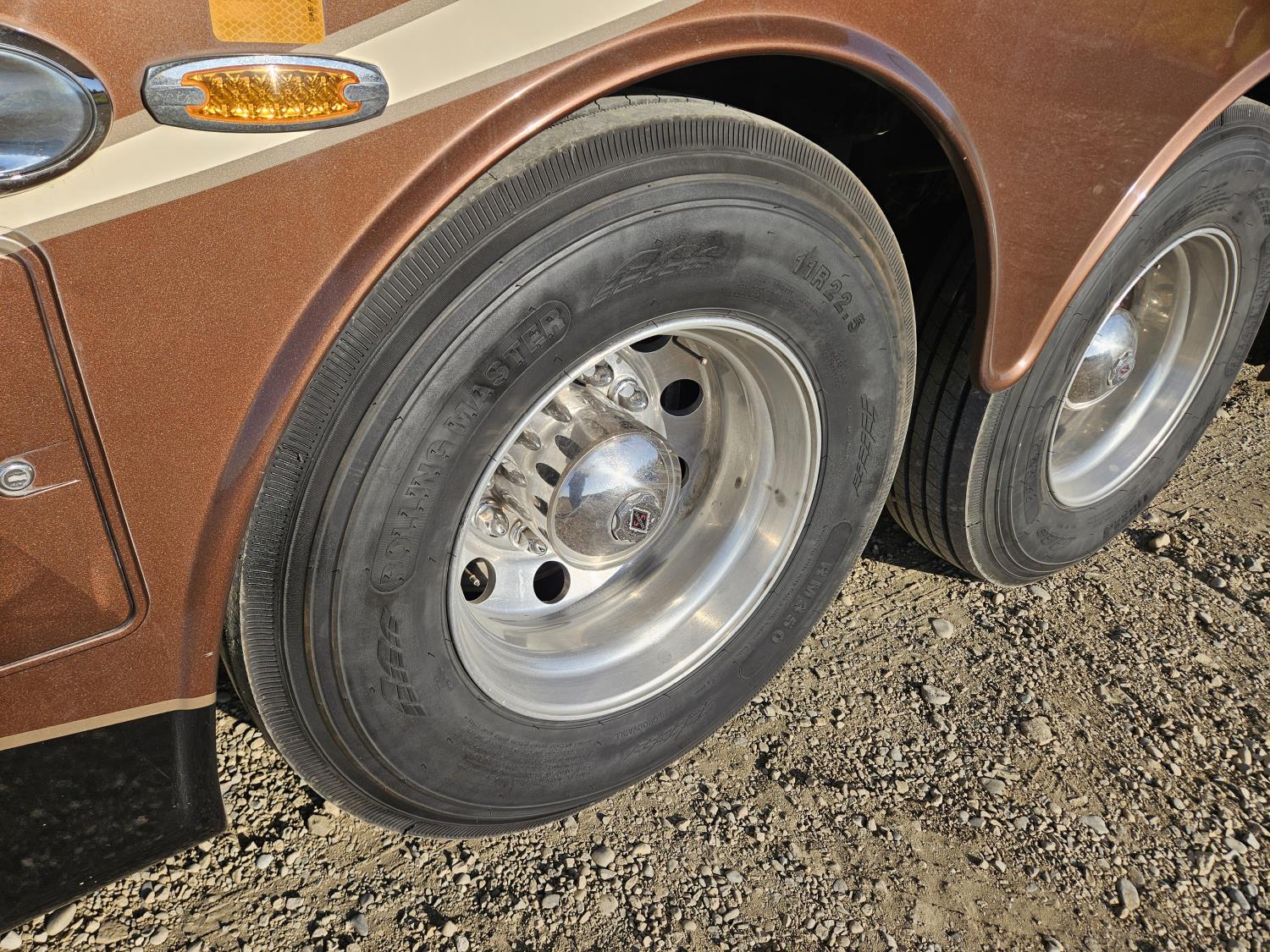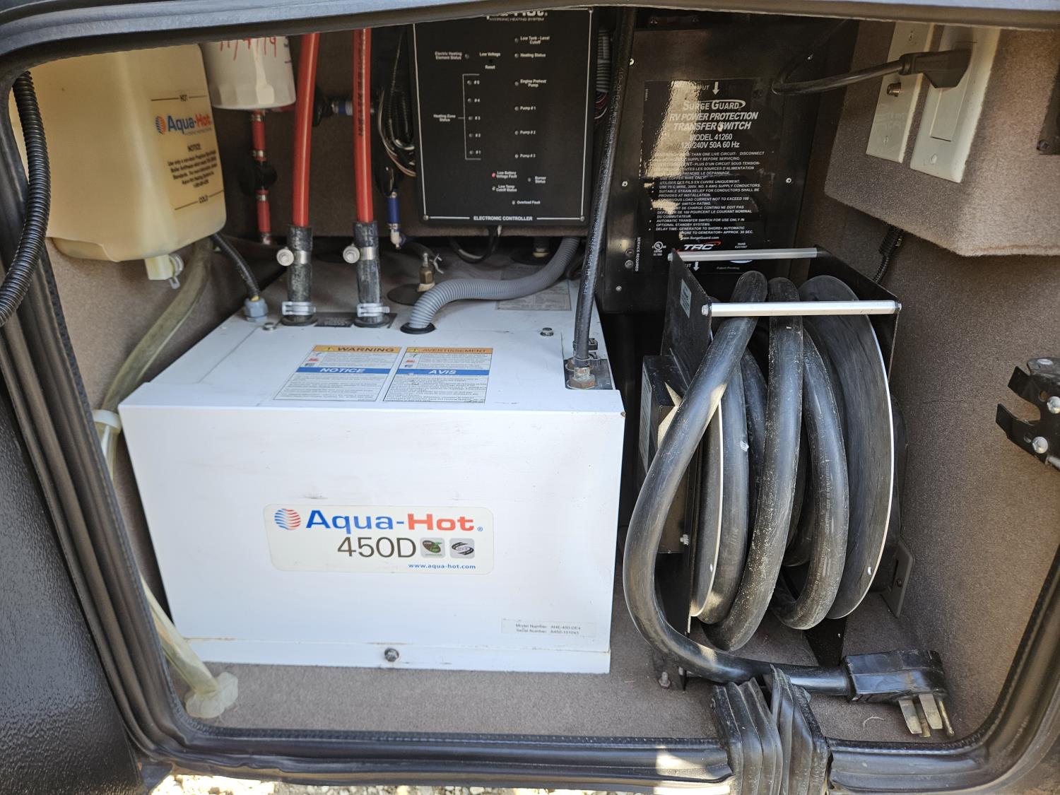 Cummins ISL 450 HP diesel engine, Allison 6-speed automatic, 4 power slide outs, Onan 12,500W diesel generator, Aqua-Hot hydronic heating, tile floors, premium leather seating, LED multiplex lighting, HD TVs, electric fireplace, Residential refrigerator, induction cooktop, convection microwave, solid-surface counters, King bed, wardrobe, stacked washer/dryer, full rear bath with tiled shower + mid-coach half bath, Heated/enclosed exterior storage bays, 315/80R22.5 front tires, 11R22.5 rear tires