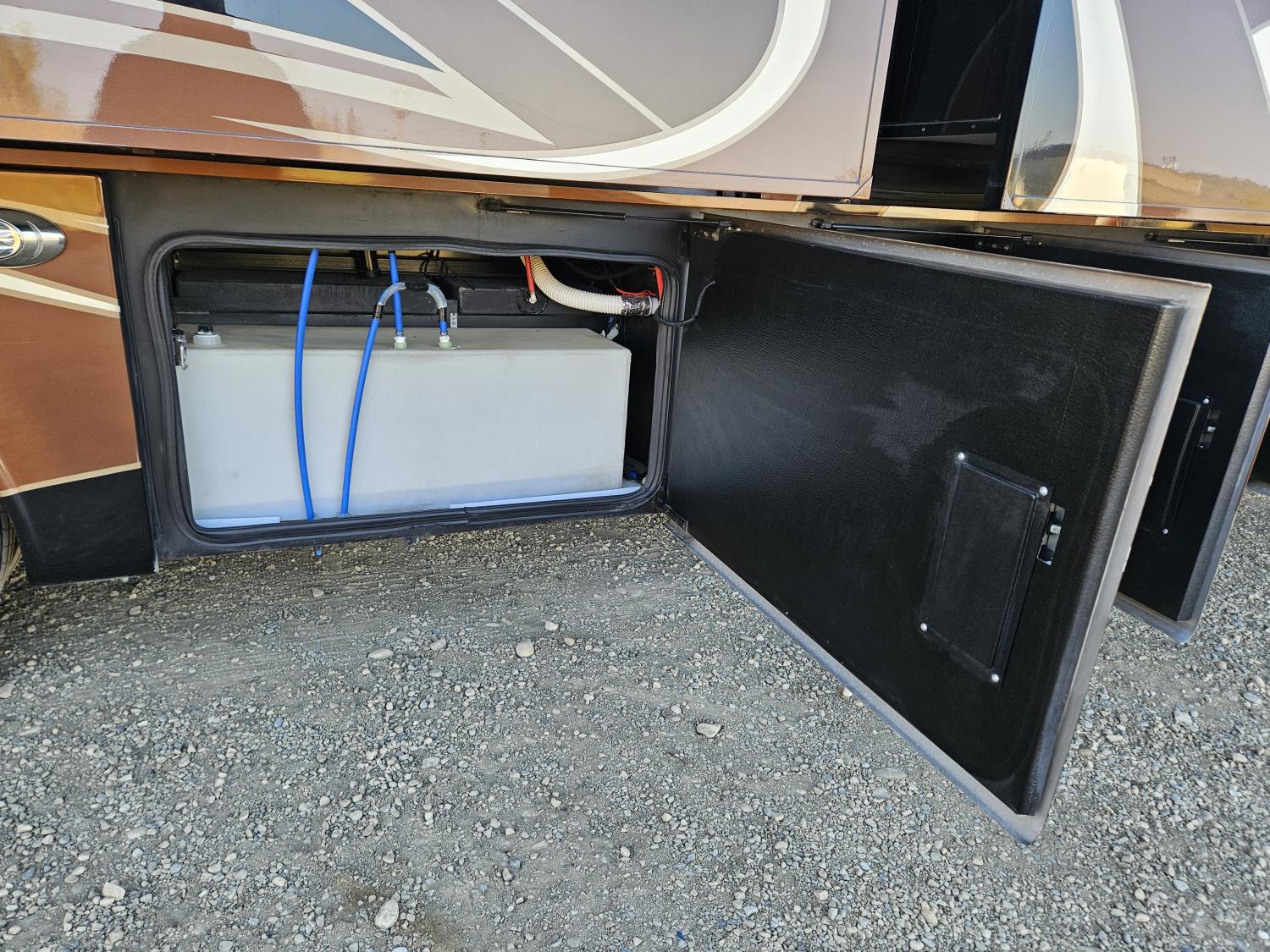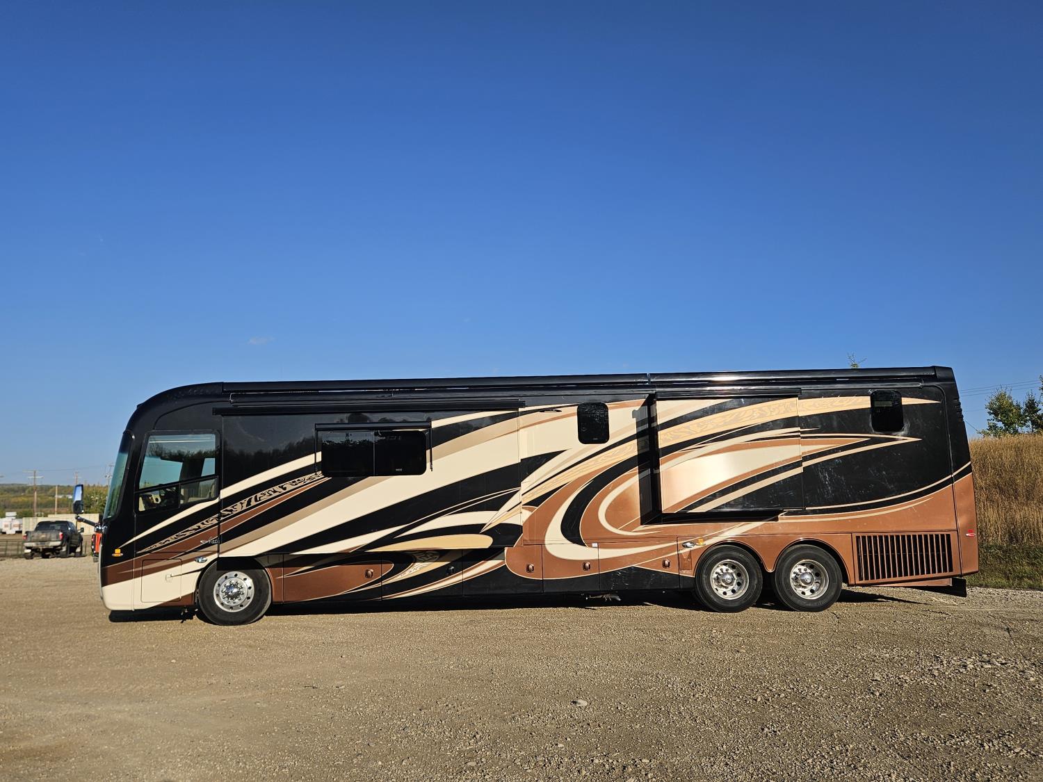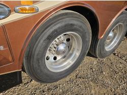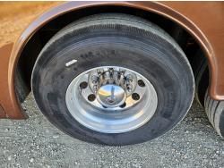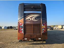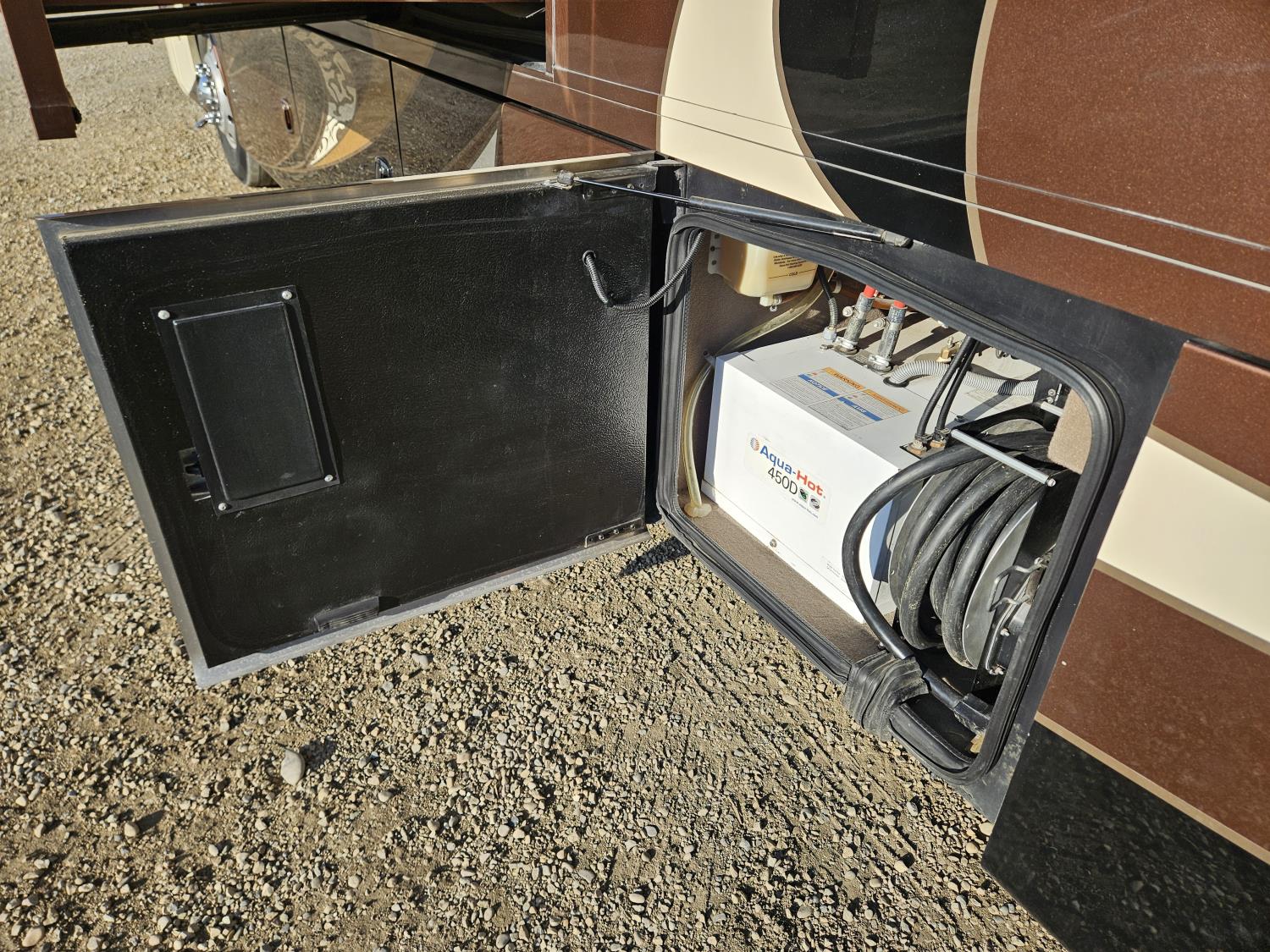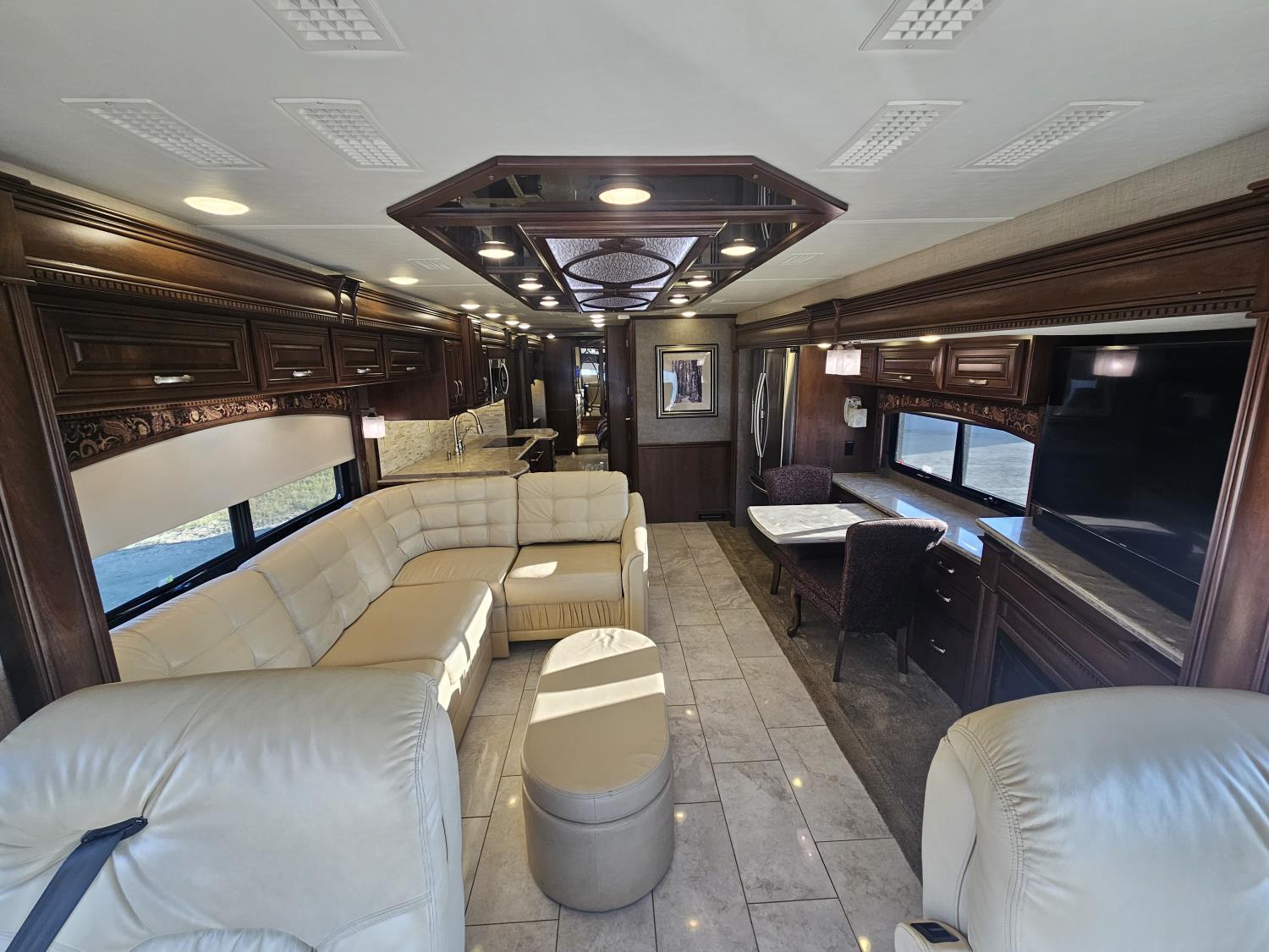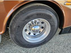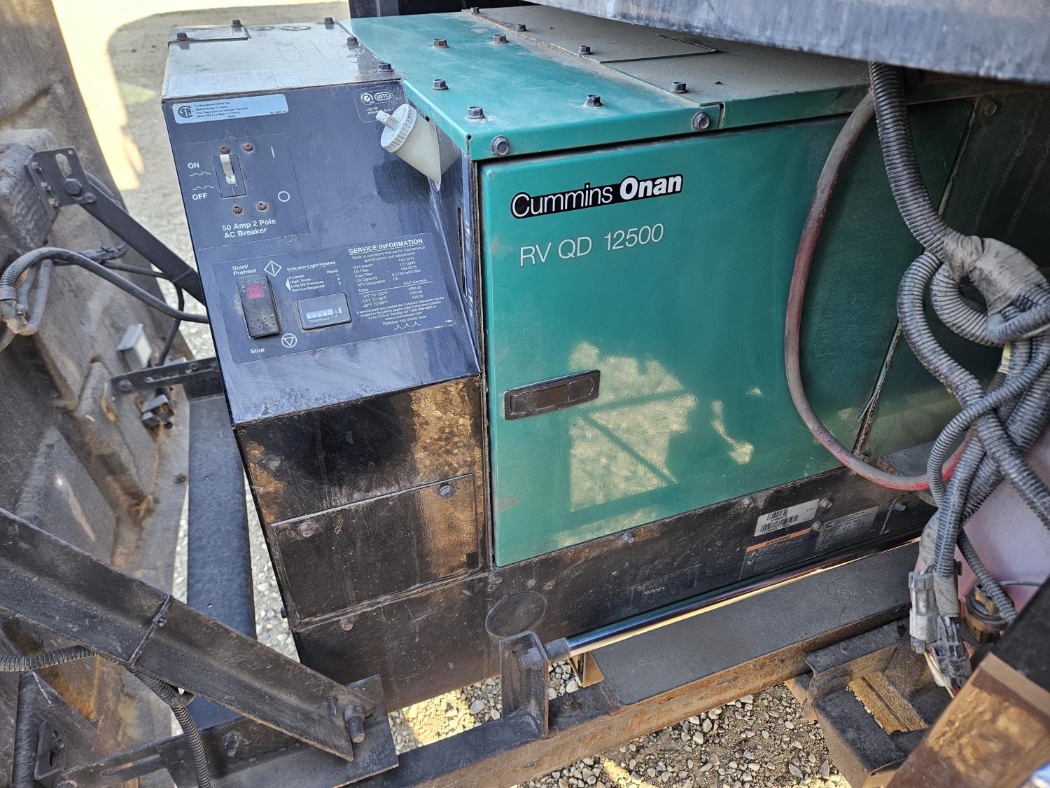 Cummins ISL 450 HP diesel engine, Allison 6-speed automatic, 4 power slide outs, Onan 12,500W diesel generator, Aqua-Hot hydronic heating, tile floors, premium leather seating, LED multiplex lighting, HD TVs, electric fireplace, Residential refrigerator, induction cooktop, convection microwave, solid-surface counters, King bed, wardrobe, stacked washer/dryer, full rear bath with tiled shower + mid-coach half bath, Heated/enclosed exterior storage bays, 315/80R22.5 front tires, 11R22.5 rear tires