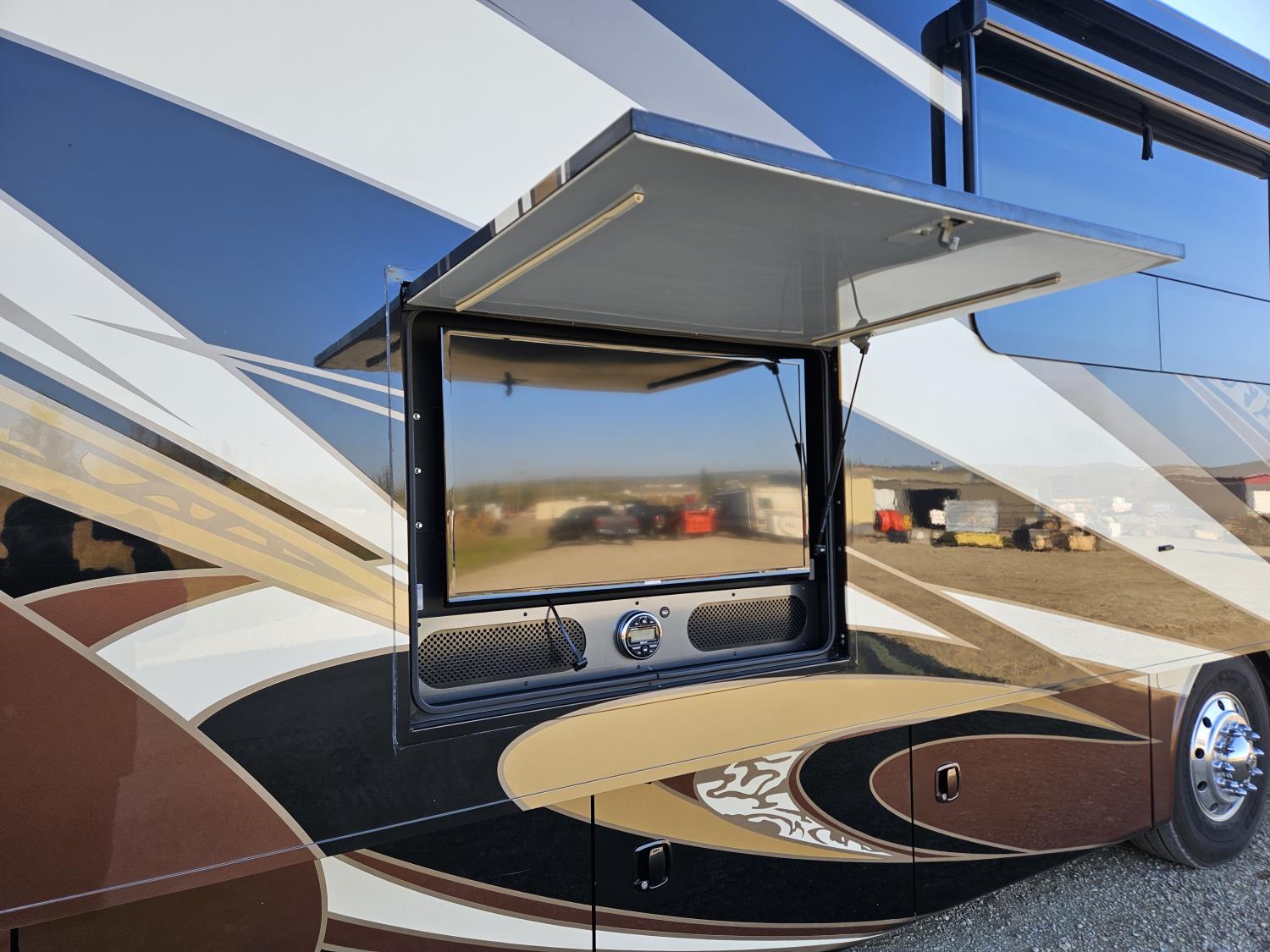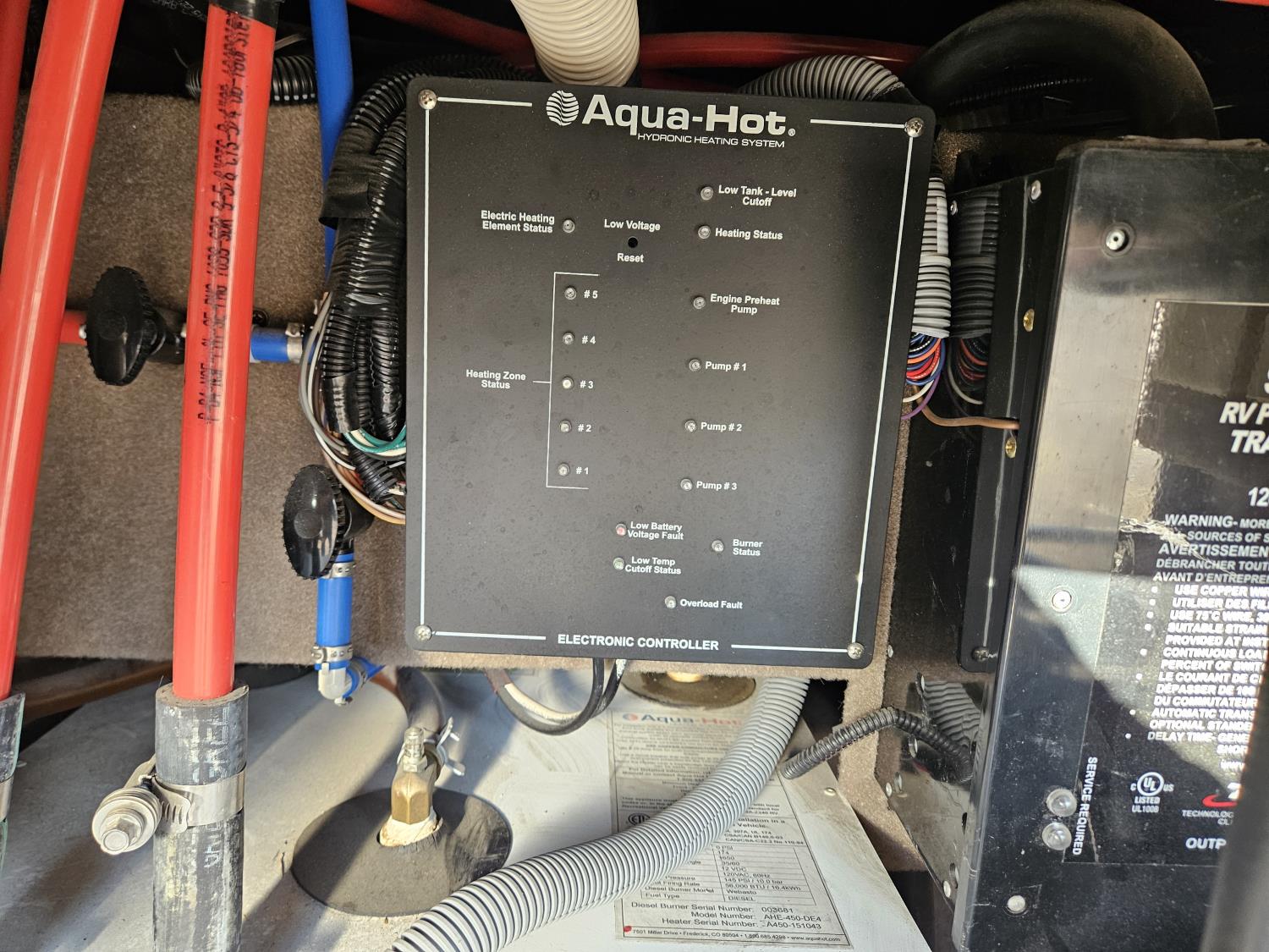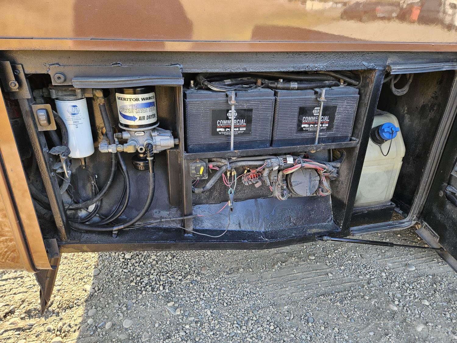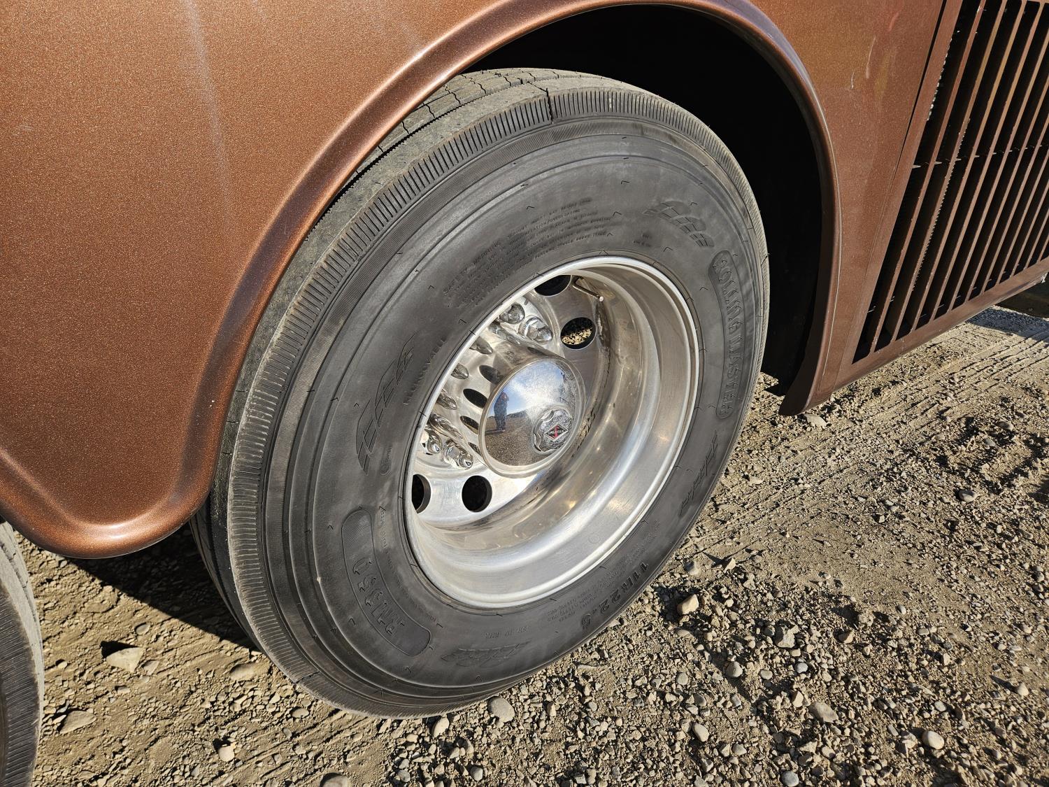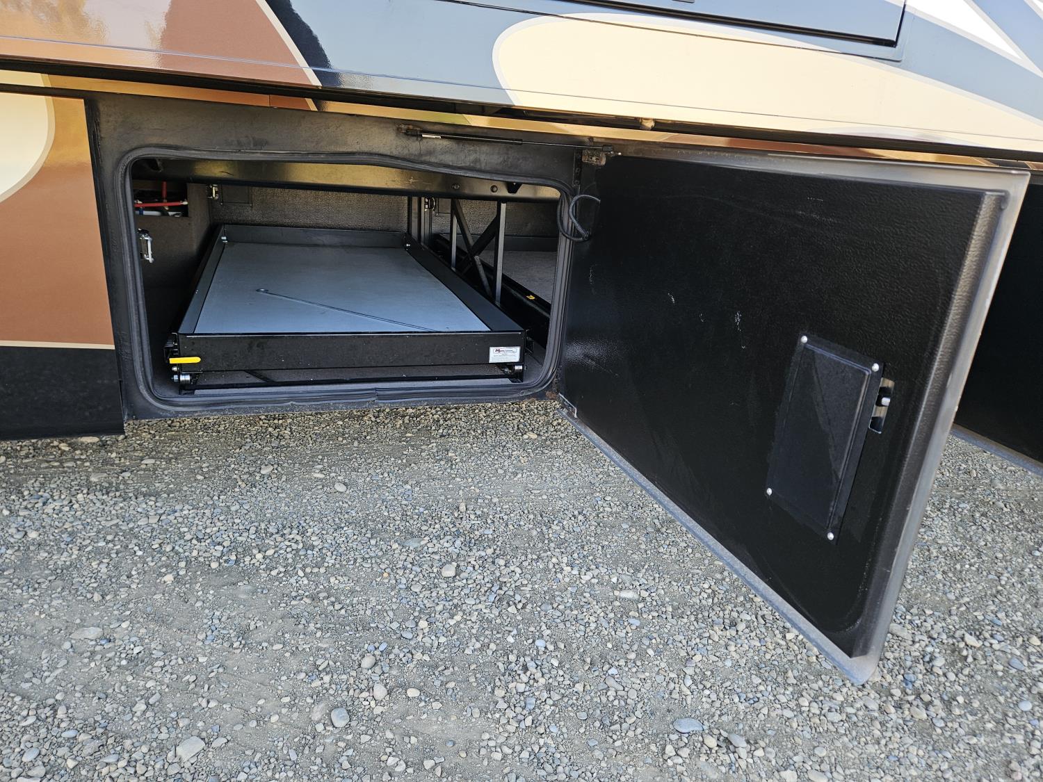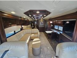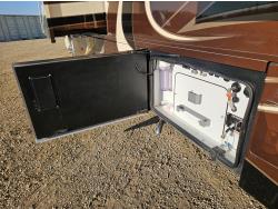 Cummins ISL 450 HP diesel engine, Allison 6-speed automatic, 4 power slide outs, Onan 12,500W diesel generator, Aqua-Hot hydronic heating, tile floors, premium leather seating, LED multiplex lighting, HD TVs, electric fireplace, Residential refrigerator, induction cooktop, convection microwave, solid-surface counters, King bed, wardrobe, stacked washer/dryer, full rear bath with tiled shower + mid-coach half bath, Heated/enclosed exterior storage bays, 315/80R22.5 front tires, 11R22.5 rear tires