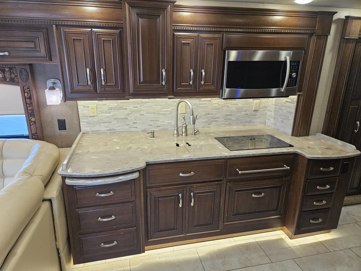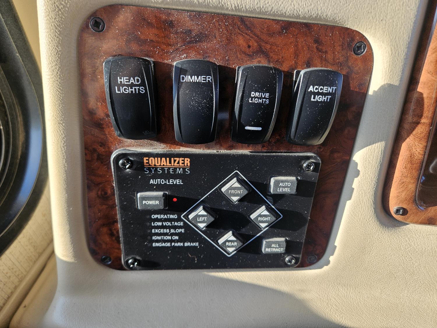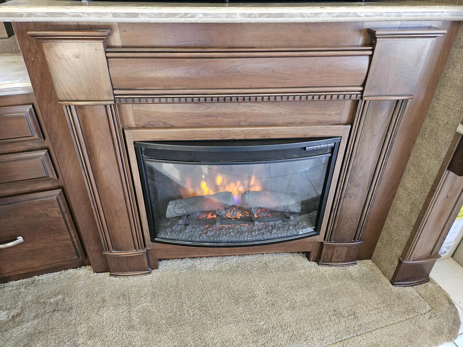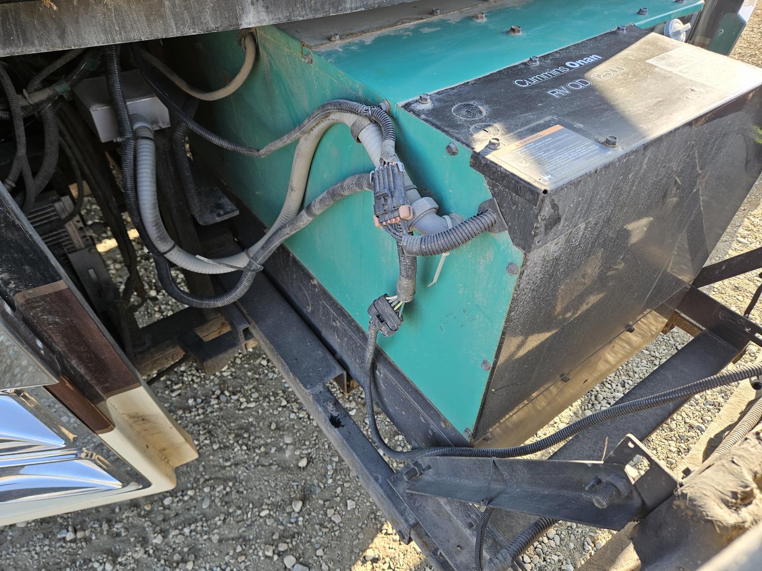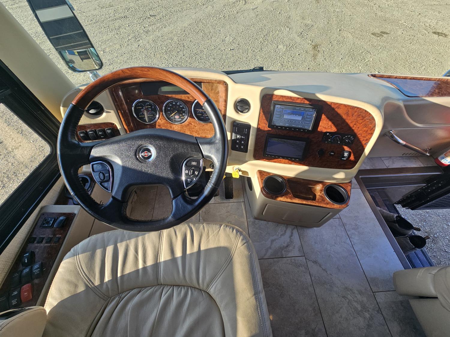 Cummins ISL 450 HP diesel engine, Allison 6-speed automatic, 4 power slide outs, Onan 12,500W diesel generator, Aqua-Hot hydronic heating, tile floors, premium leather seating, LED multiplex lighting, HD TVs, electric fireplace, Residential refrigerator, induction cooktop, convection microwave, solid-surface counters, King bed, wardrobe, stacked washer/dryer, full rear bath with tiled shower + mid-coach half bath, Heated/enclosed exterior storage bays, 315/80R22.5 front tires, 11R22.5 rear tires