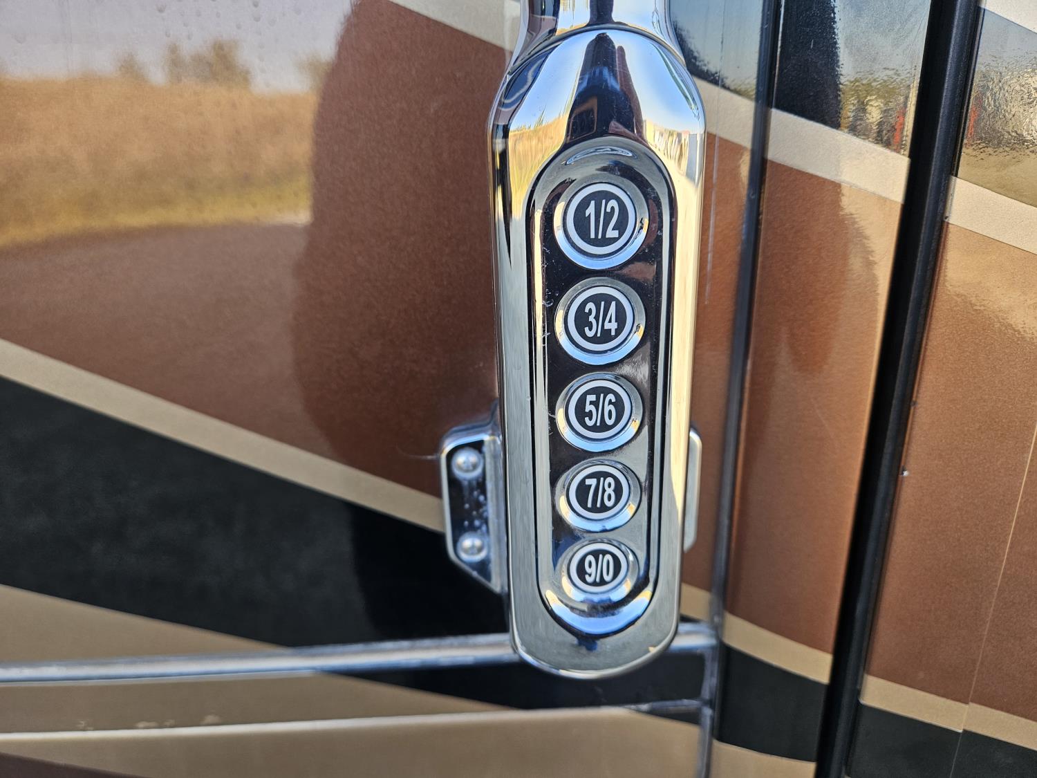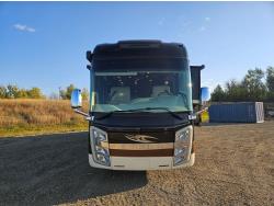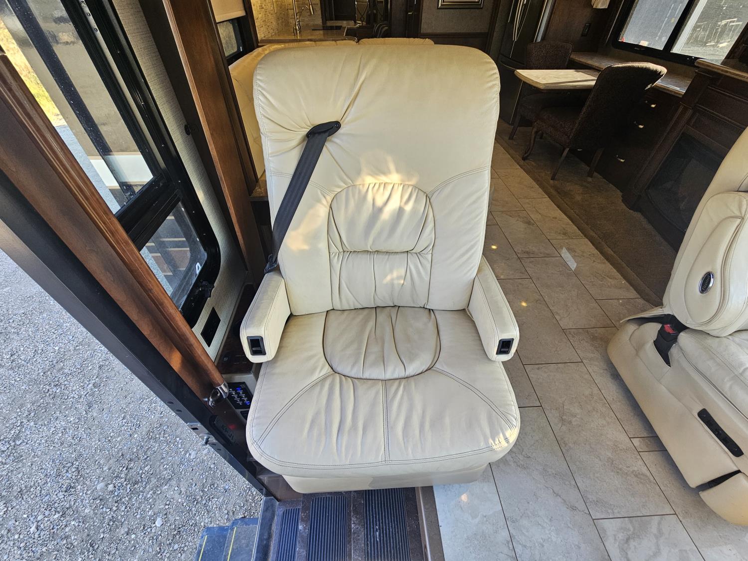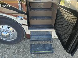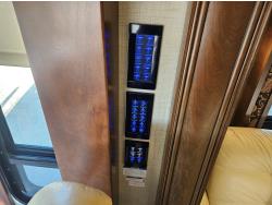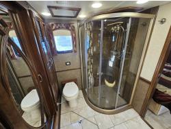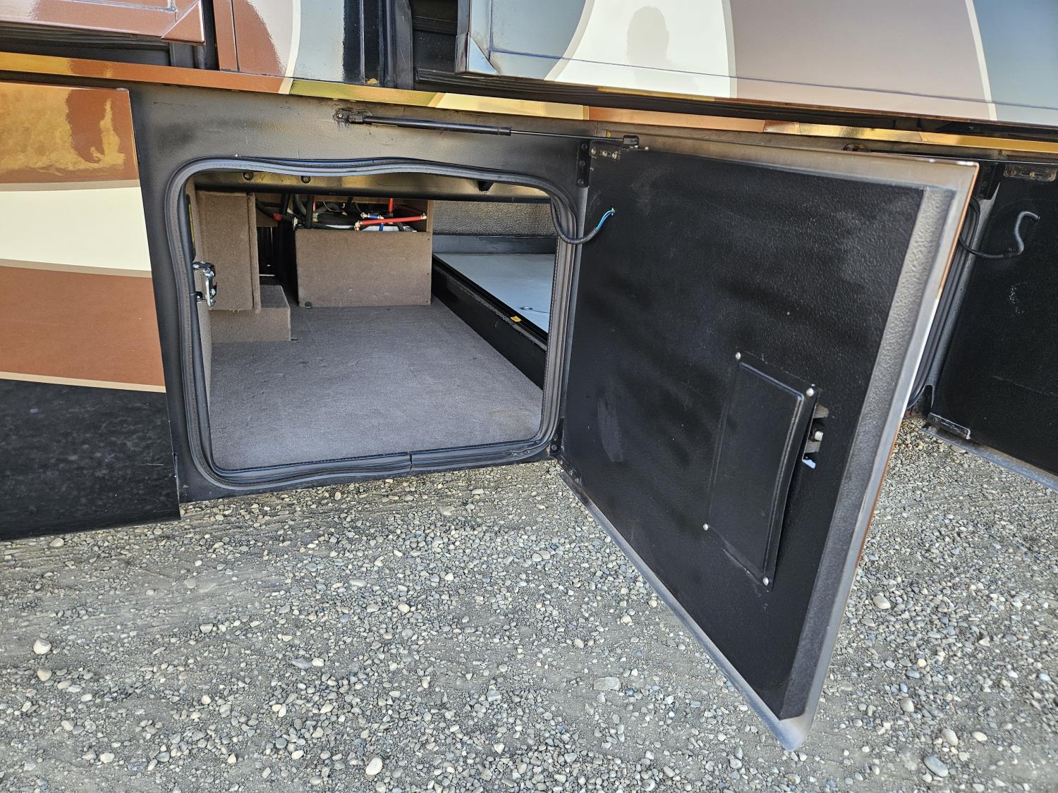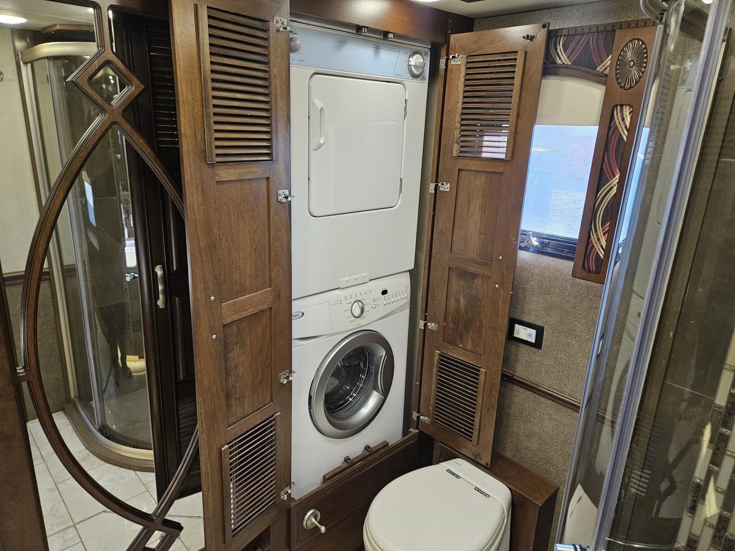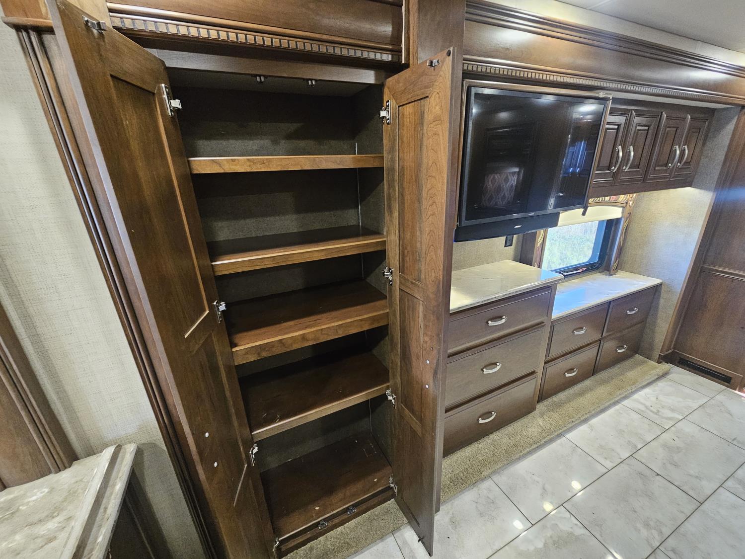 Cummins ISL 450 HP diesel engine, Allison 6-speed automatic, 4 power slide outs, Onan 12,500W diesel generator, Aqua-Hot hydronic heating, tile floors, premium leather seating, LED multiplex lighting, HD TVs, electric fireplace, Residential refrigerator, induction cooktop, convection microwave, solid-surface counters, King bed, wardrobe, stacked washer/dryer, full rear bath with tiled shower + mid-coach half bath, Heated/enclosed exterior storage bays, 315/80R22.5 front tires, 11R22.5 rear tires
