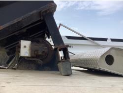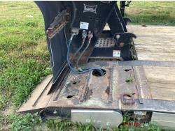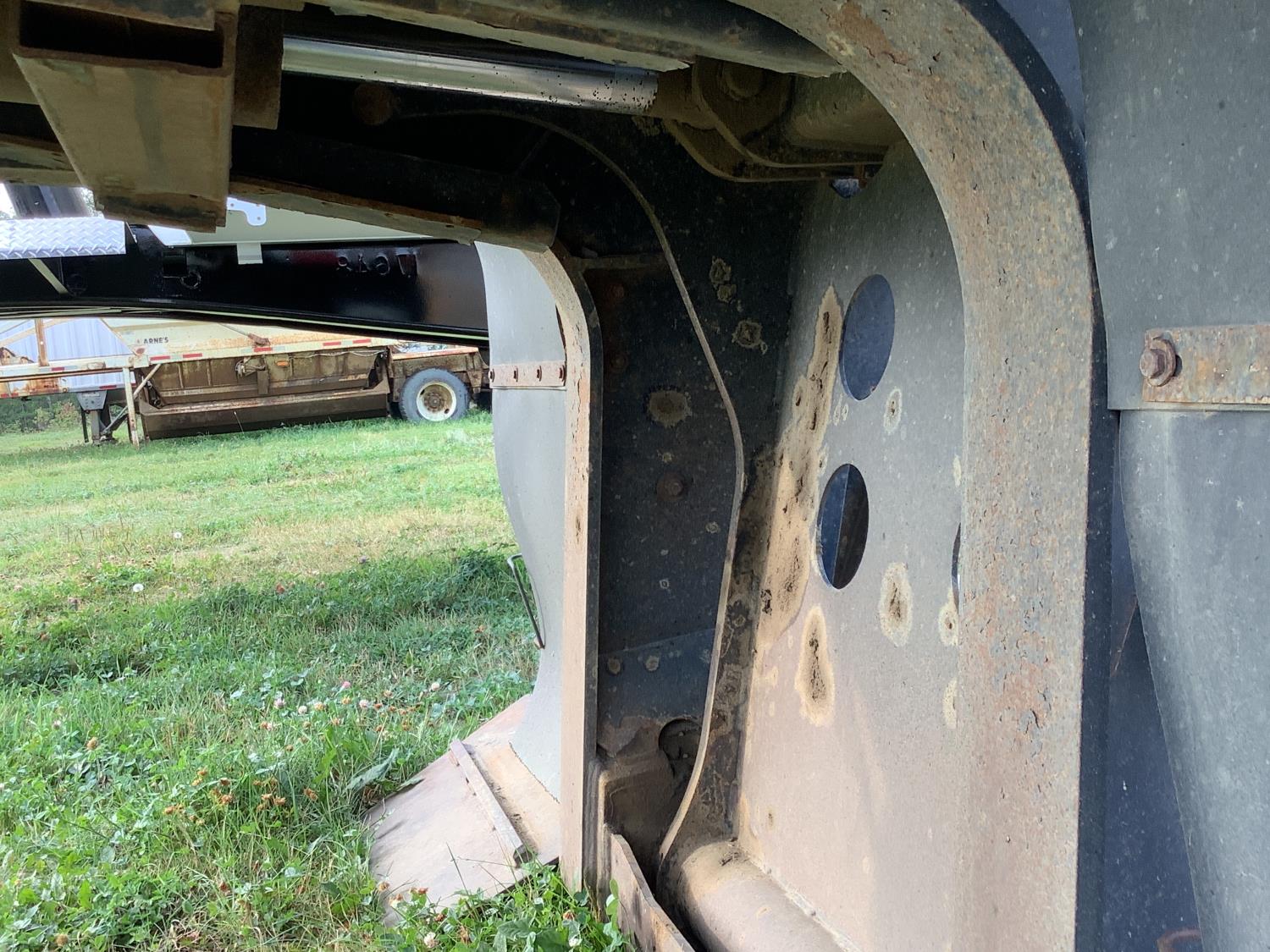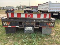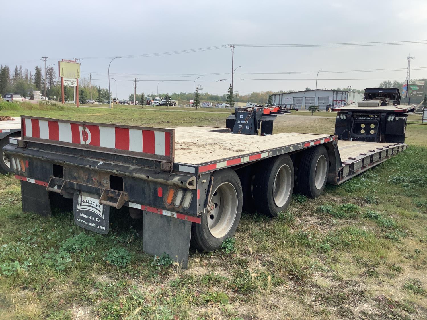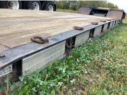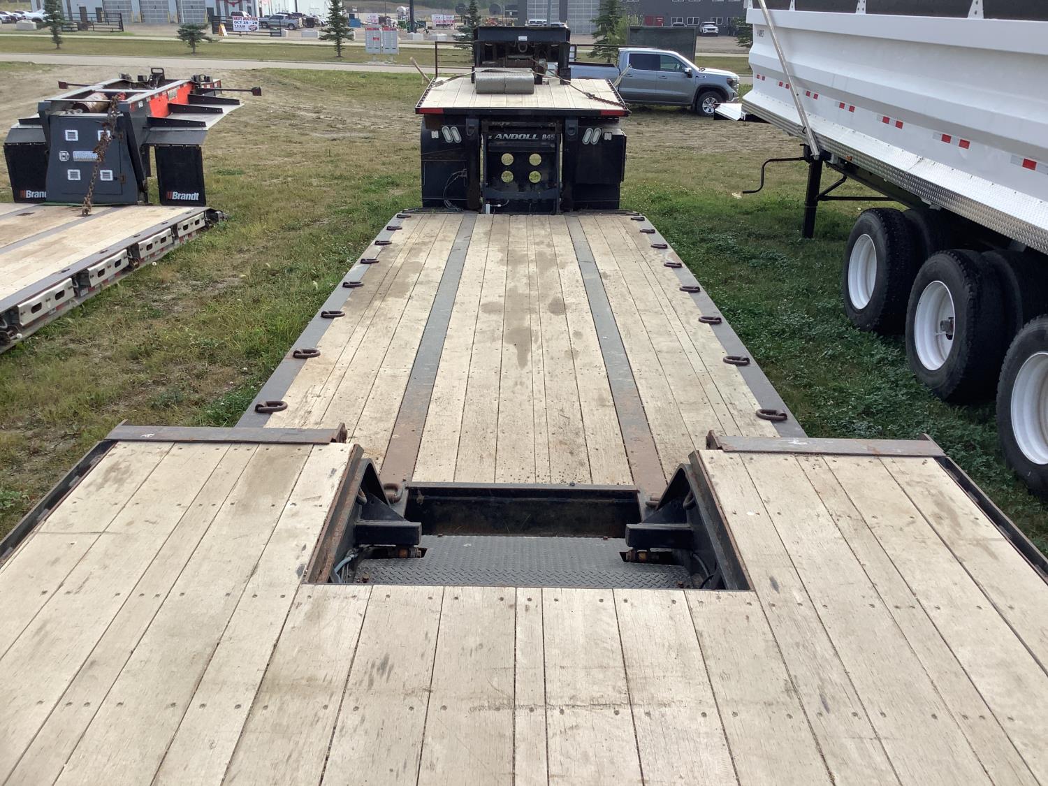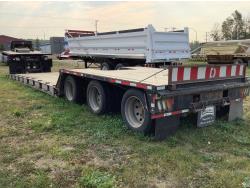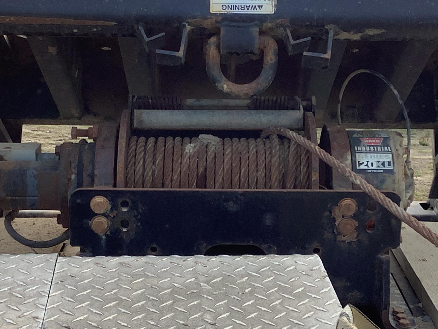 10 ft wide, 9 ft top deck, 26 ft main deck, with aluminum pull out extension to 15 ft, 13 ft rear deck, air ride suspension, wide load and rear strobe lights, removable aluminum ramps for rear deck loading, flip neck extension for tandem jeep, front mount Warn 20XL hydraulic winch, D ring tie downs, hydraulic neck stinger arm, all aluminum rims, 255/70R22.5 tires