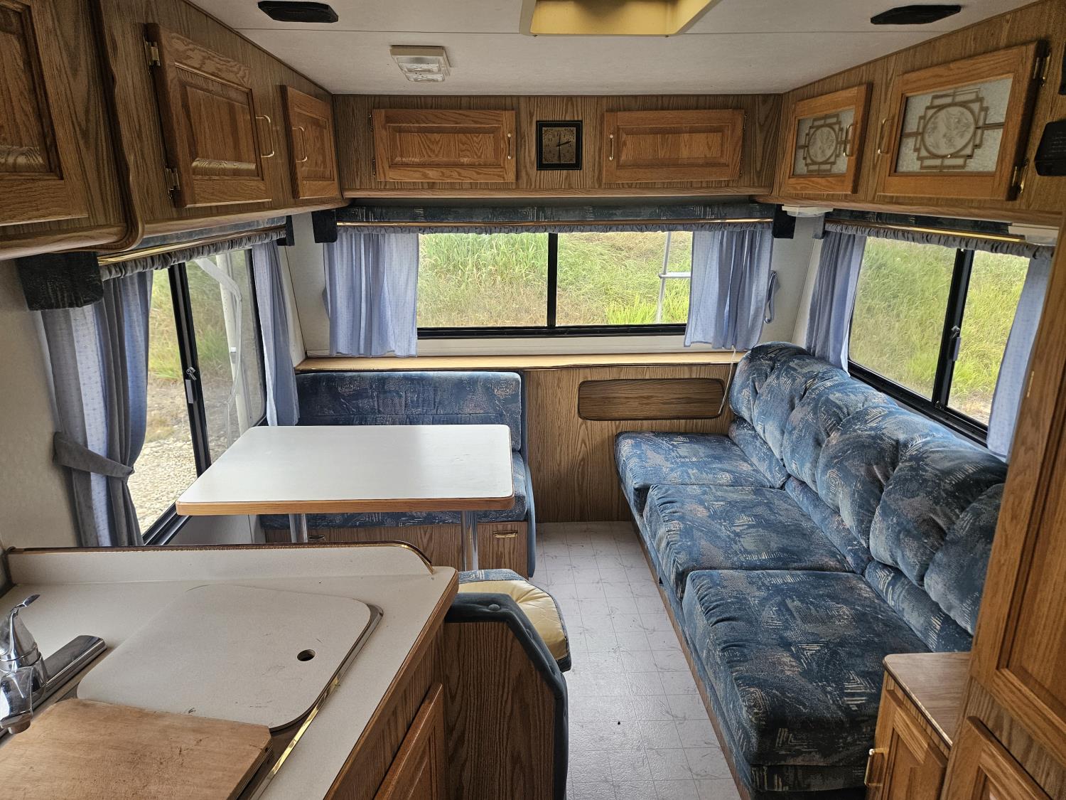 stove, fridge, full bath, outdoor shower, manual awning, spring suspension, cracked window, had water leak but was repaired, 205/75R15 tires