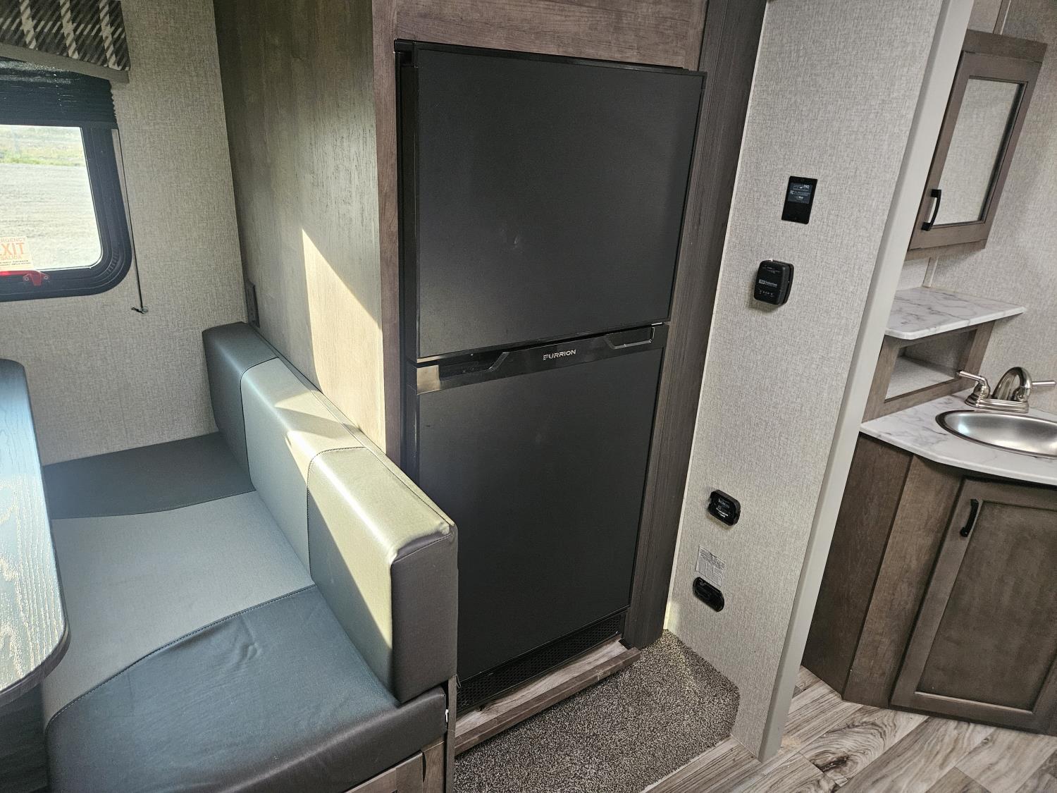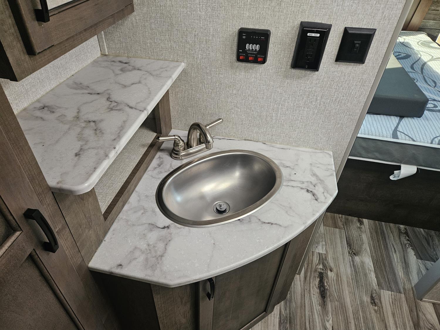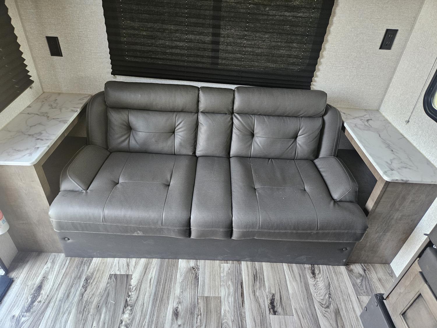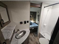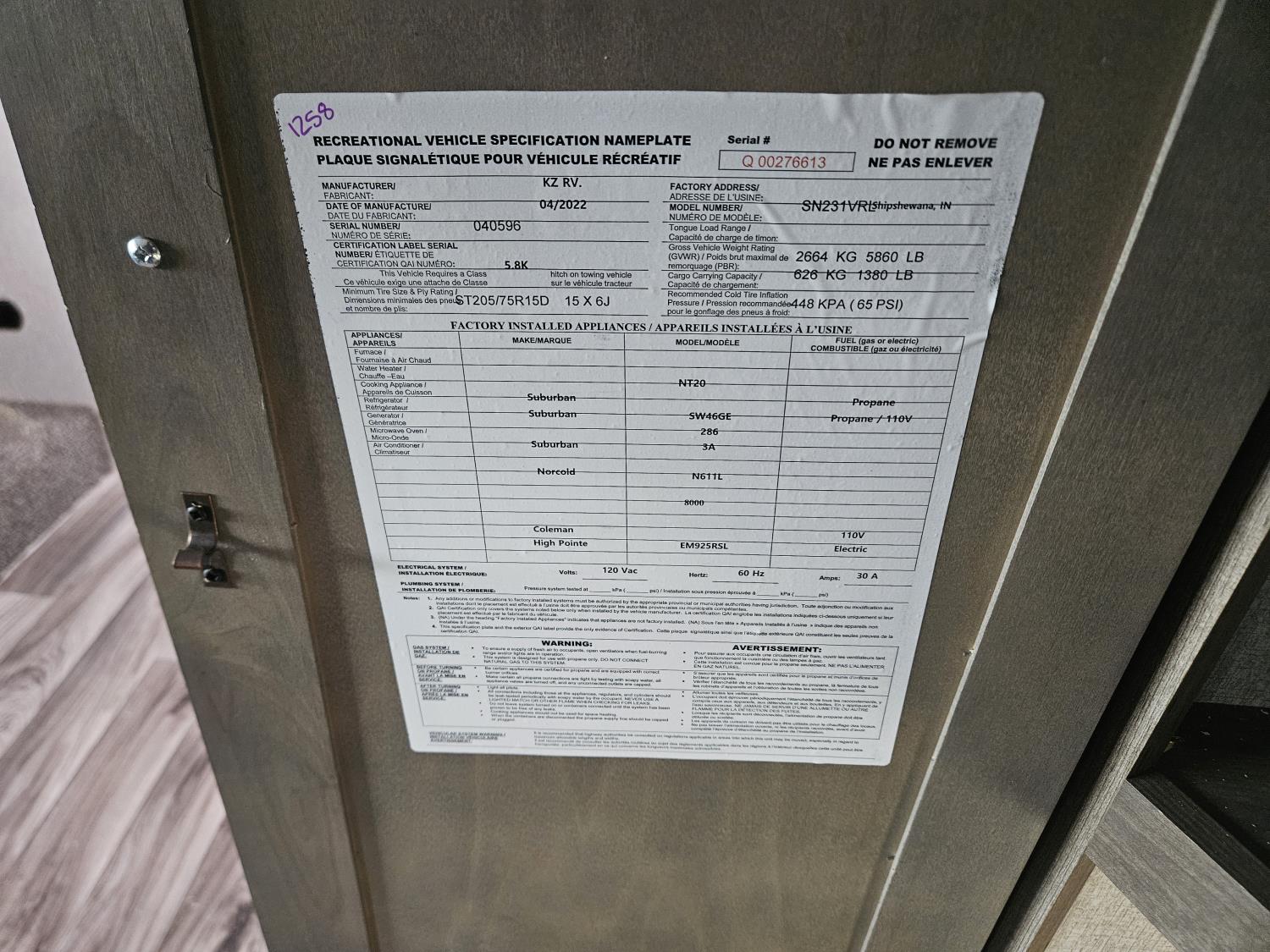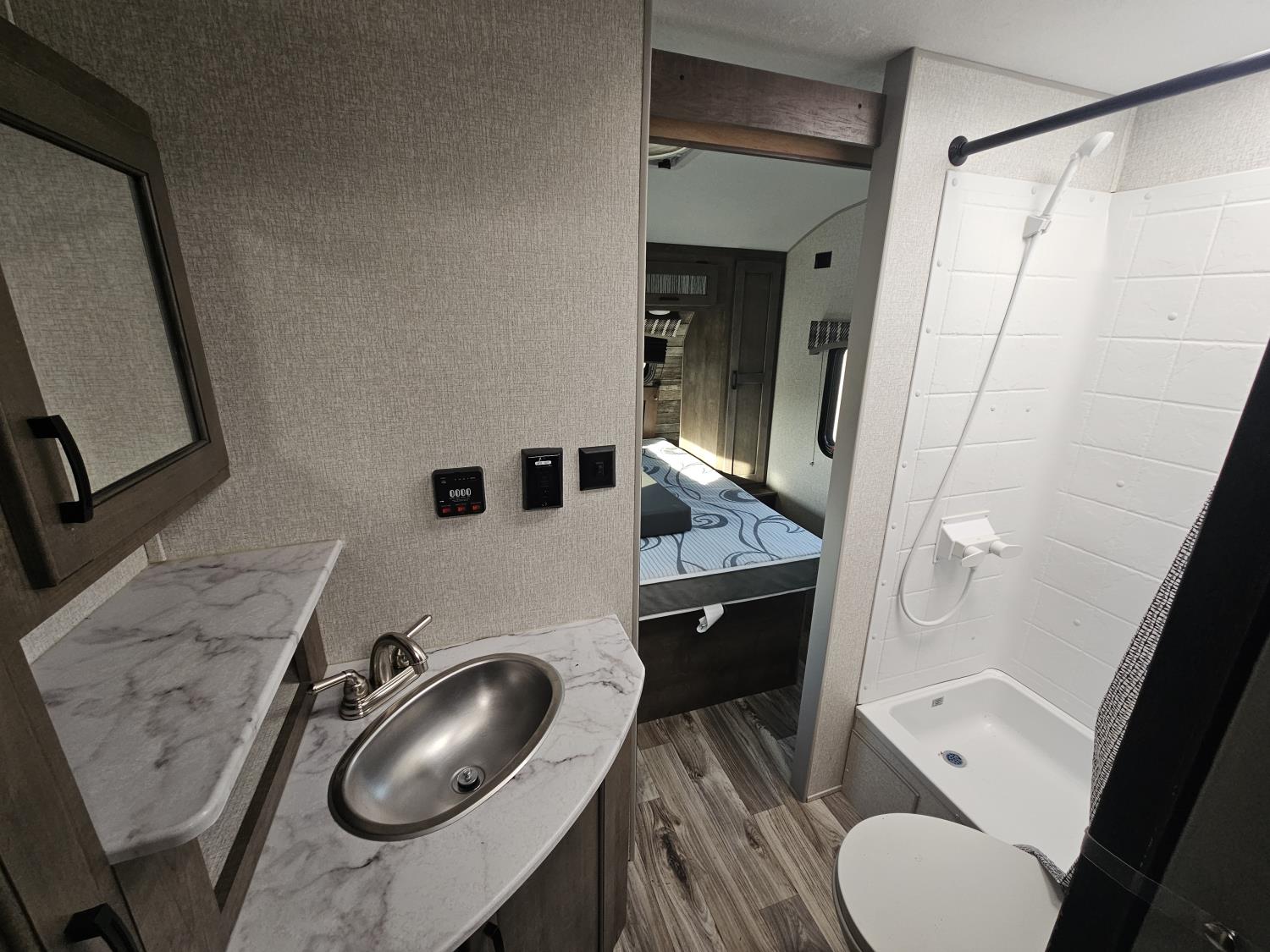 Sleeps 6, stove, fridge, microwave, full bath, master bedroom, A/C, outdoor shower, 1 slide, power awning, spring suspension, 205/75R15 tires