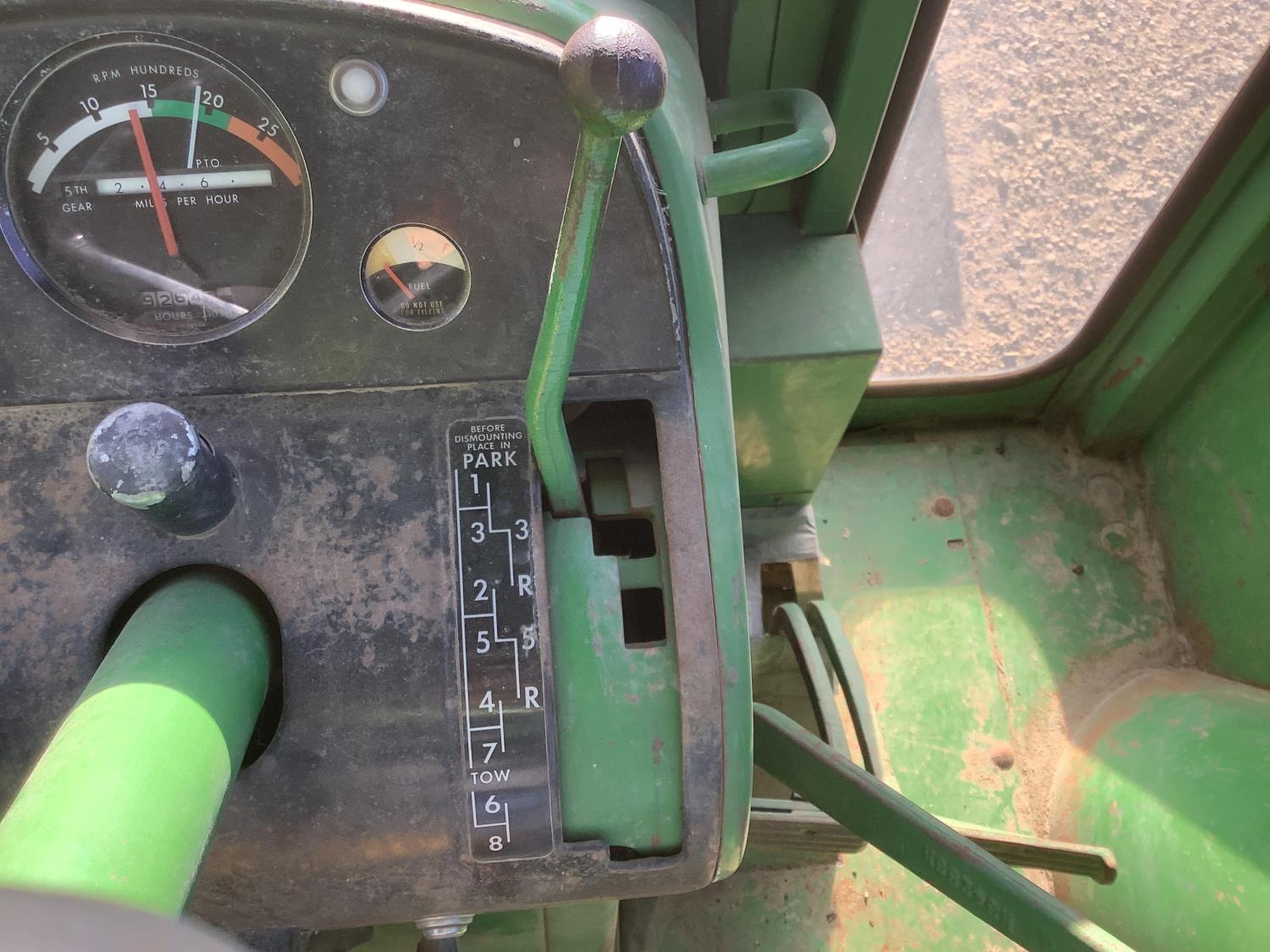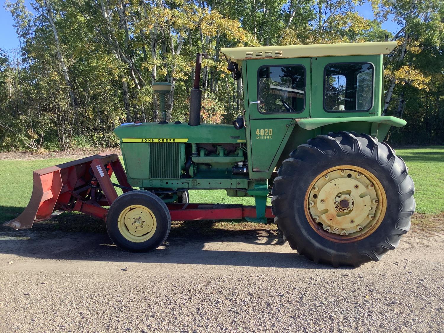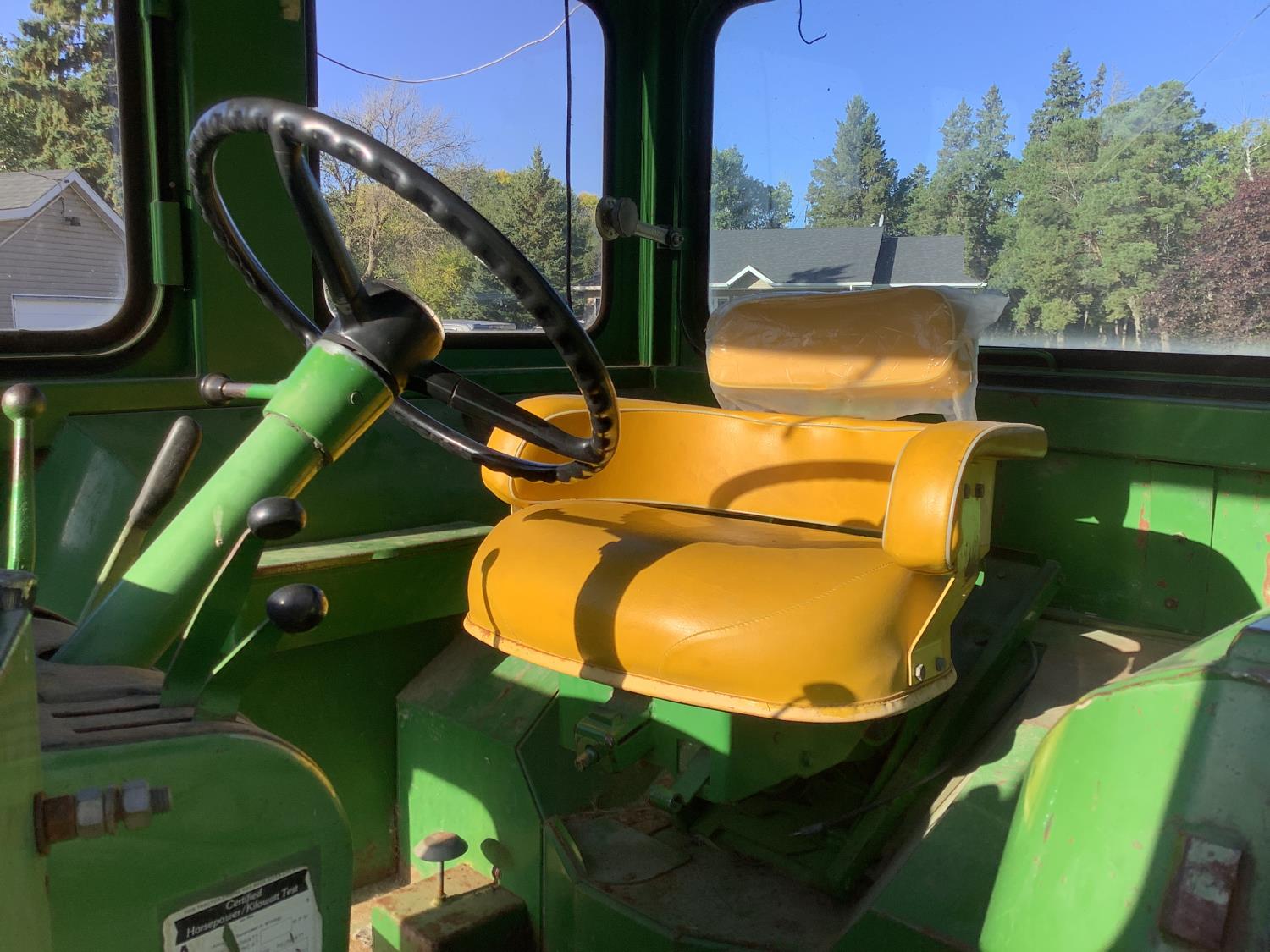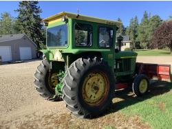 John Deere 6.6 L 6 cylinder engine, 95 PTO HP, 8 speed partial synchro transmission, block and oil pan heater, new engine and transmission oils, rear differential lock, factory cab, Leon dozer blade, 540/1000 PTO, 2 rear hydraulic outlets, rear wheel weights, 184X34 rear tires