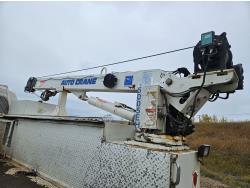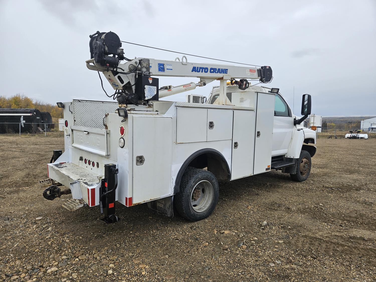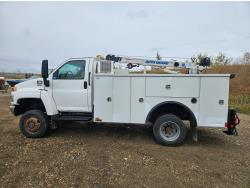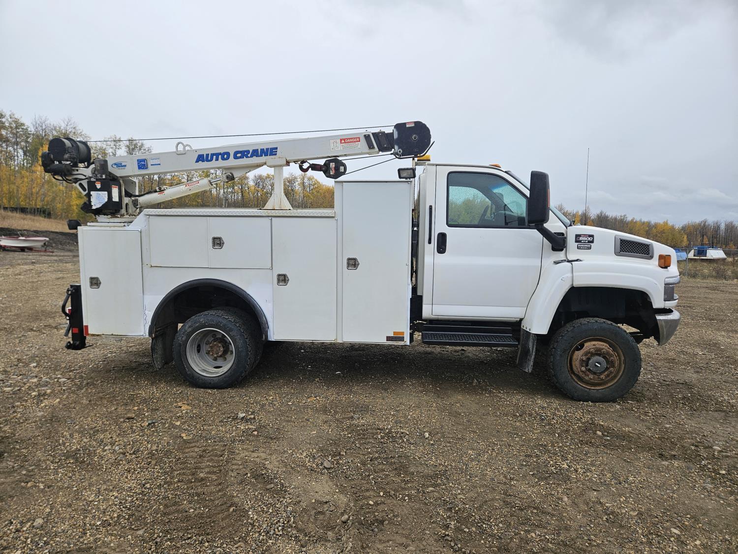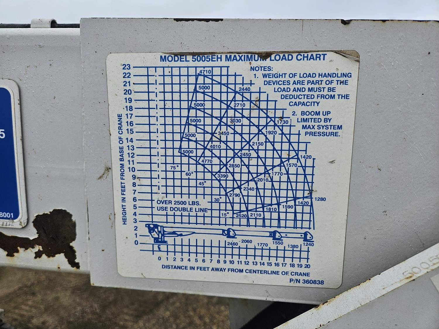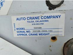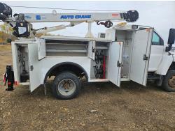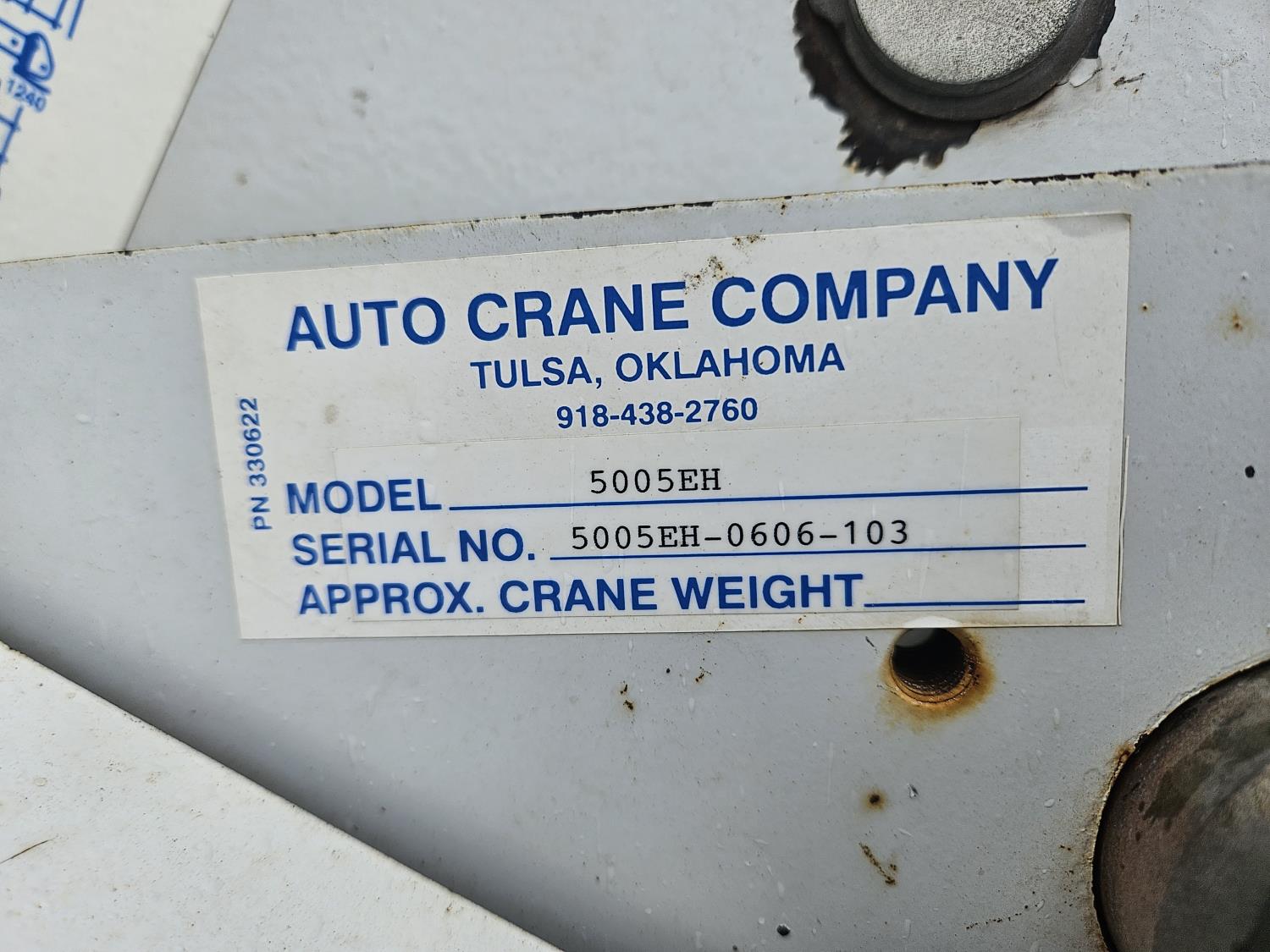 Duramax 6.6 L V8 diesel engine, engine brake, automatic transmission, A/C, P/W, P/L, cruise control, radio, steel tool boxes, beacons, Auto Crane 5005EH 2 section 20 ft straight boom crane, spring suspension, 8,000 lb front axle, 13,500 lb rear axles, 245/70R19.5 tires