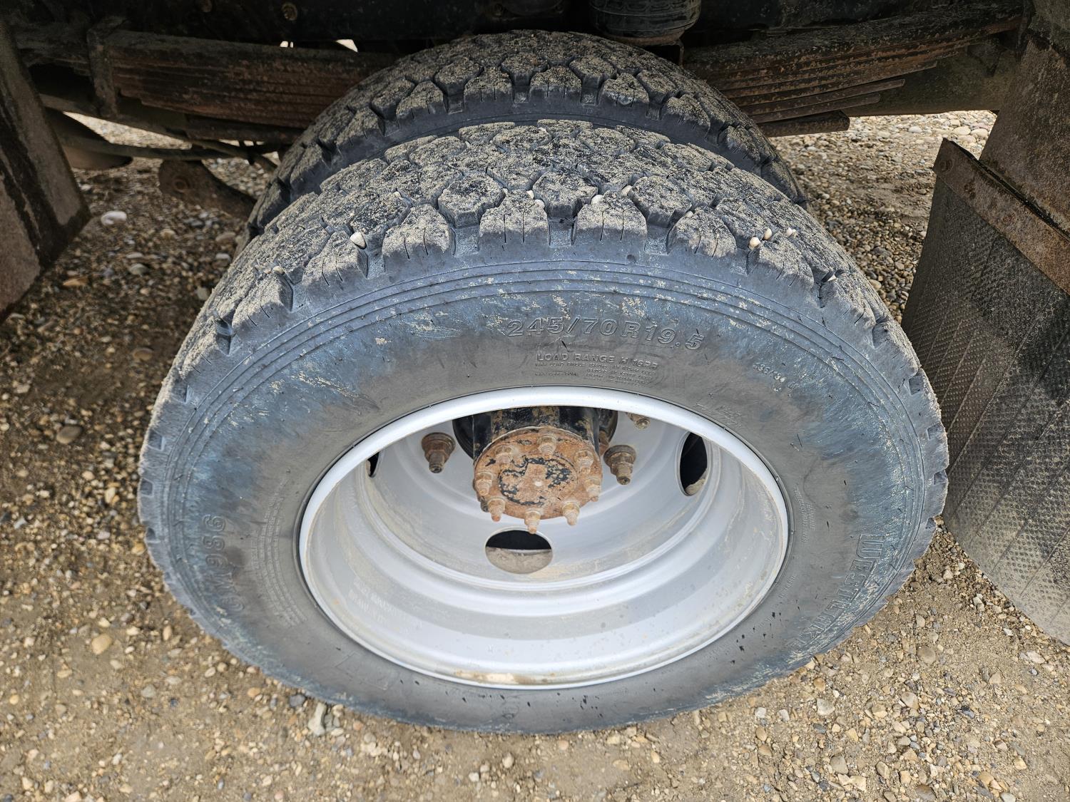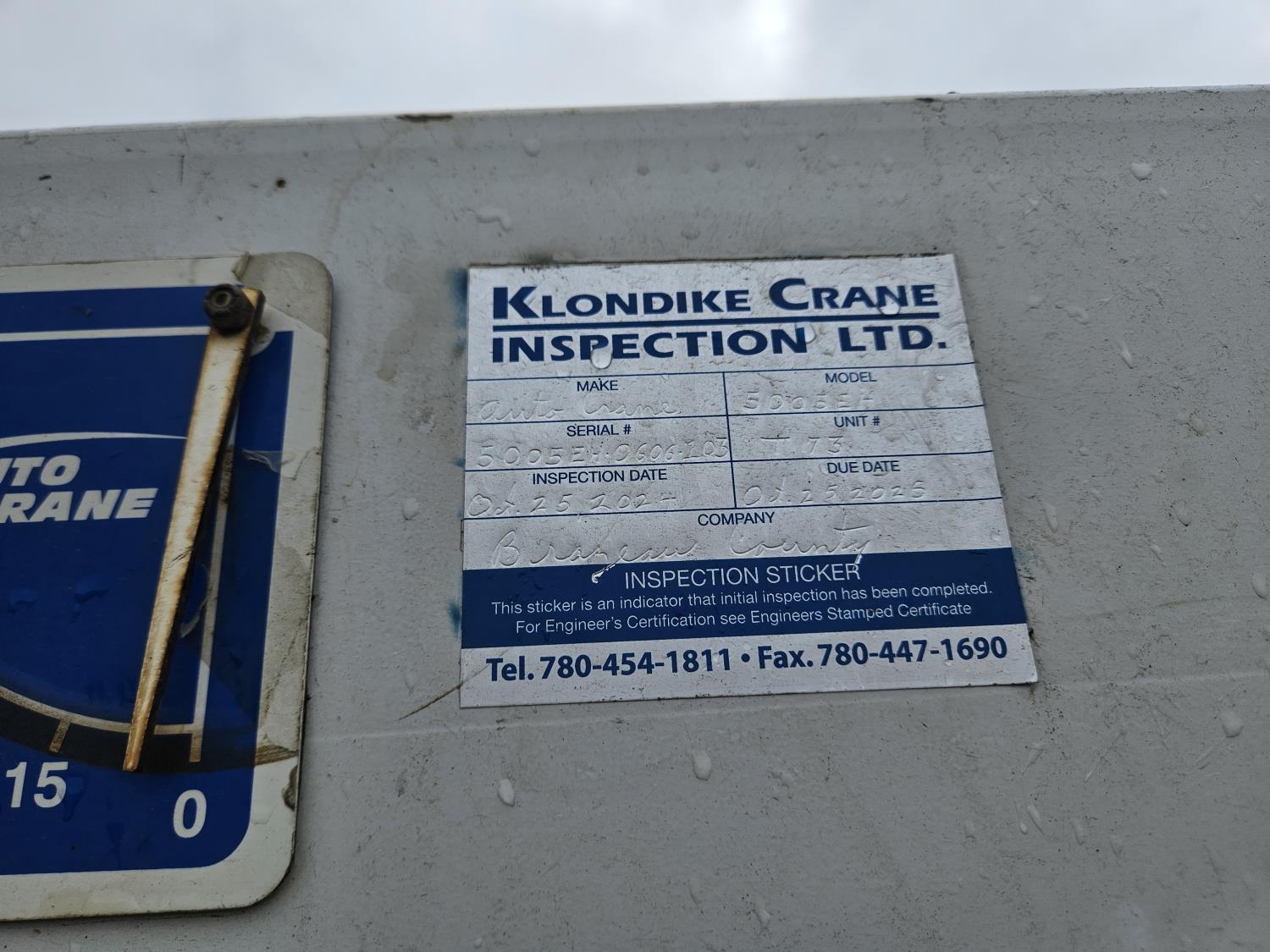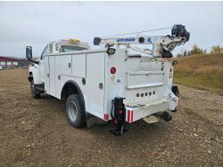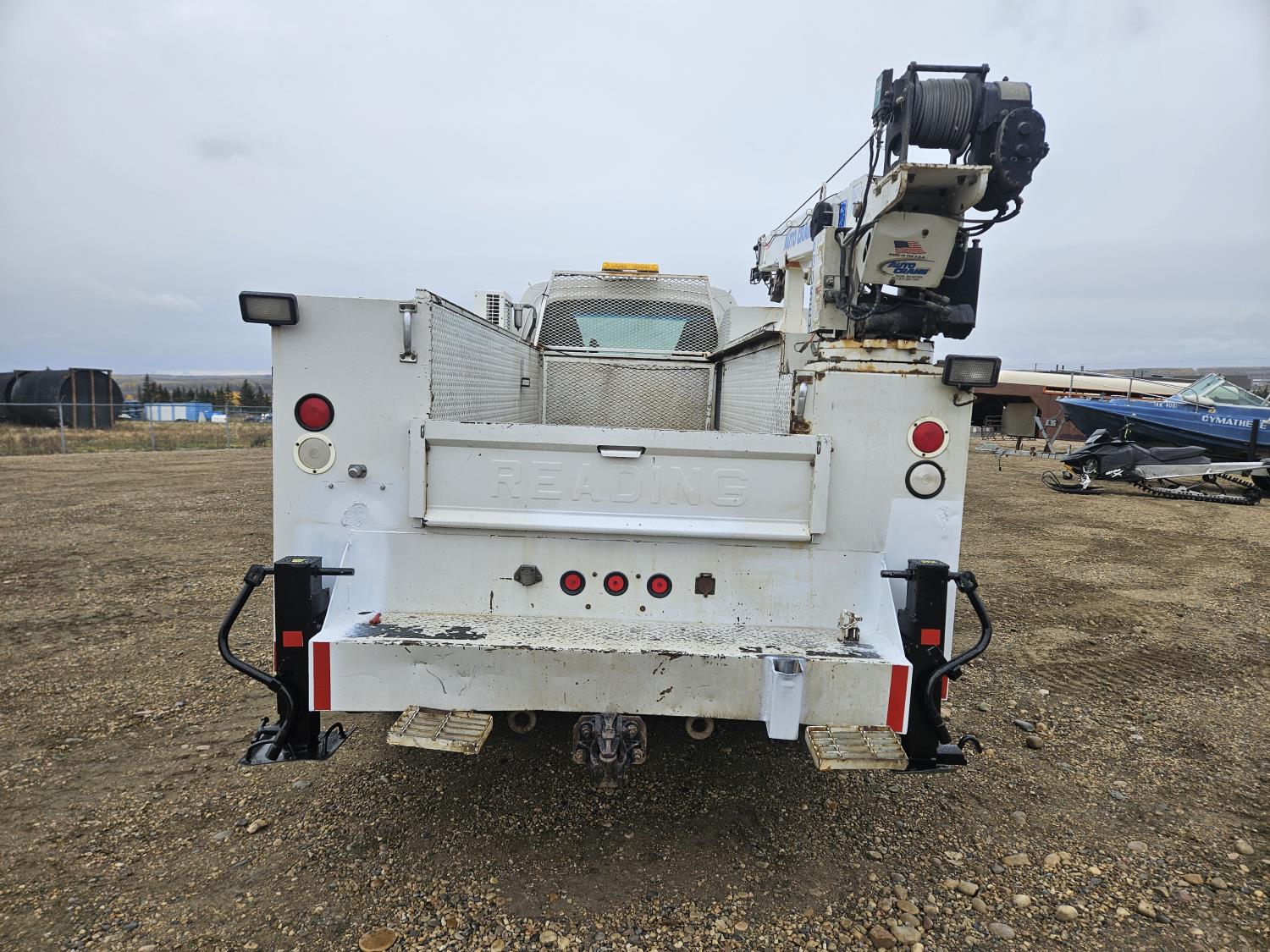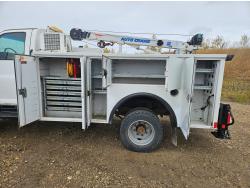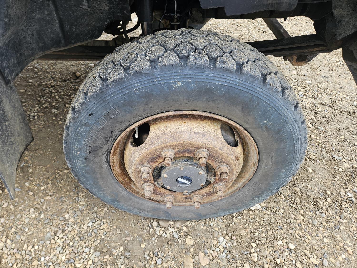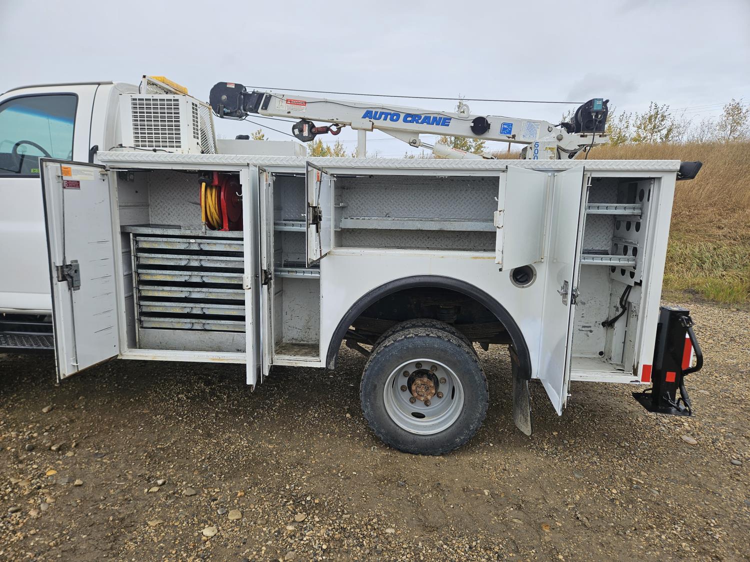 Duramax 6.6 L V8 diesel engine, engine brake, automatic transmission, A/C, P/W, P/L, cruise control, radio, steel tool boxes, beacons, Auto Crane 5005EH 2 section 20 ft straight boom crane, spring suspension, 8,000 lb front axle, 13,500 lb rear axles, 245/70R19.5 tires