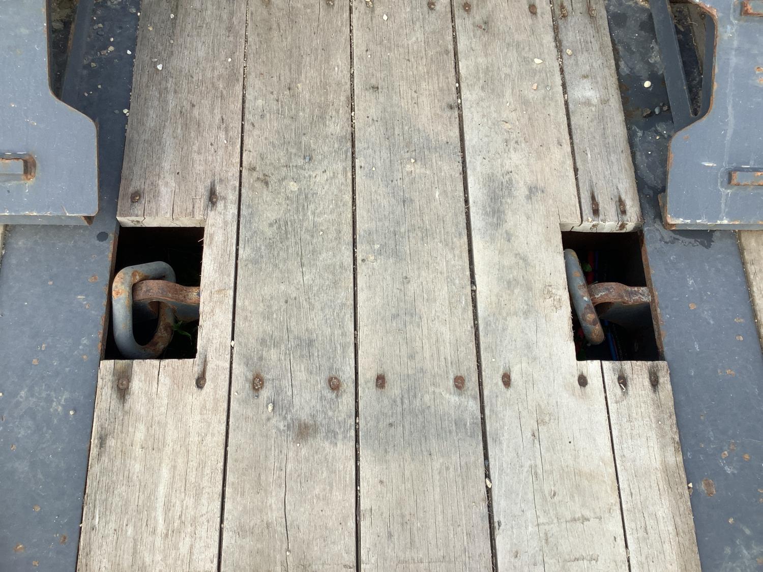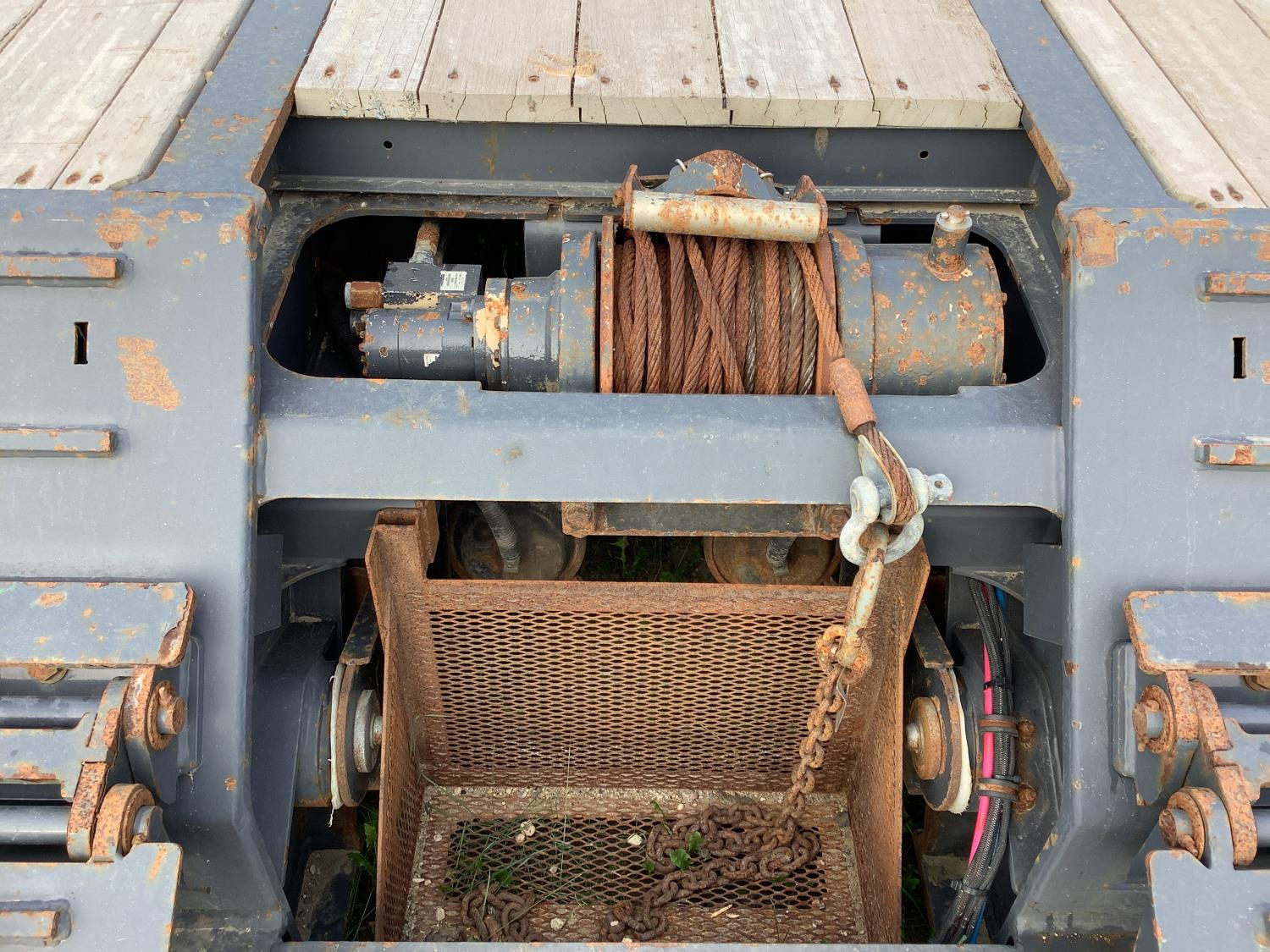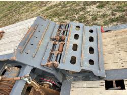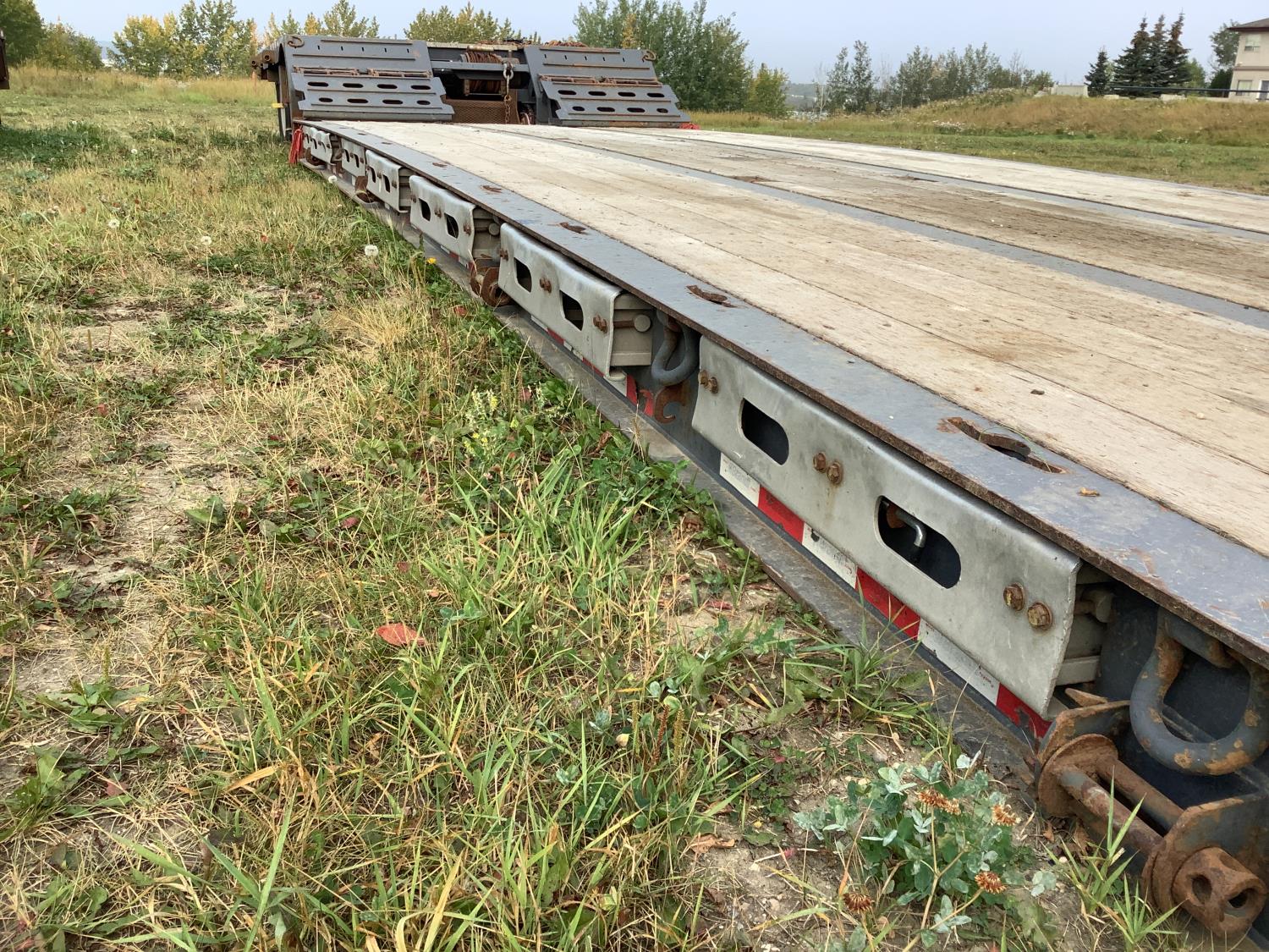 10 ft wide, aluminum pull out extensions to 15 ft wide on main deck, 30 ft long main deck and 13 ft long rear deck. wide load and rear strobe lights, flip neck extension for tandem jeep and removable pin with 3 hole location, 3 bar winch’s, in floor chain tie downs, hydraulic stinger arm on removable neck, rear mounted hydraulic winch, flip up ramps for rear deck loading, air ride, all aluminum rims, 225/70R22.5