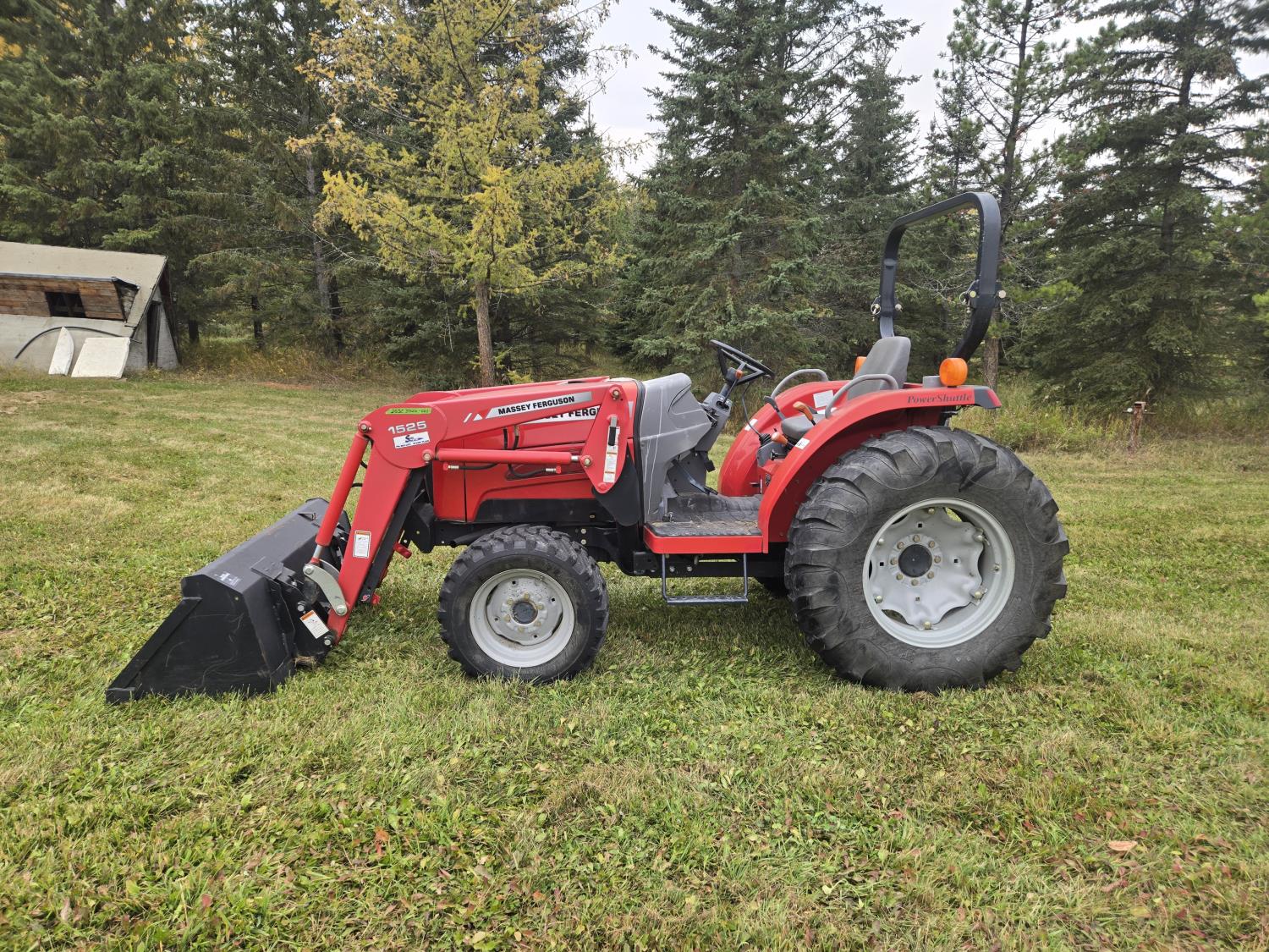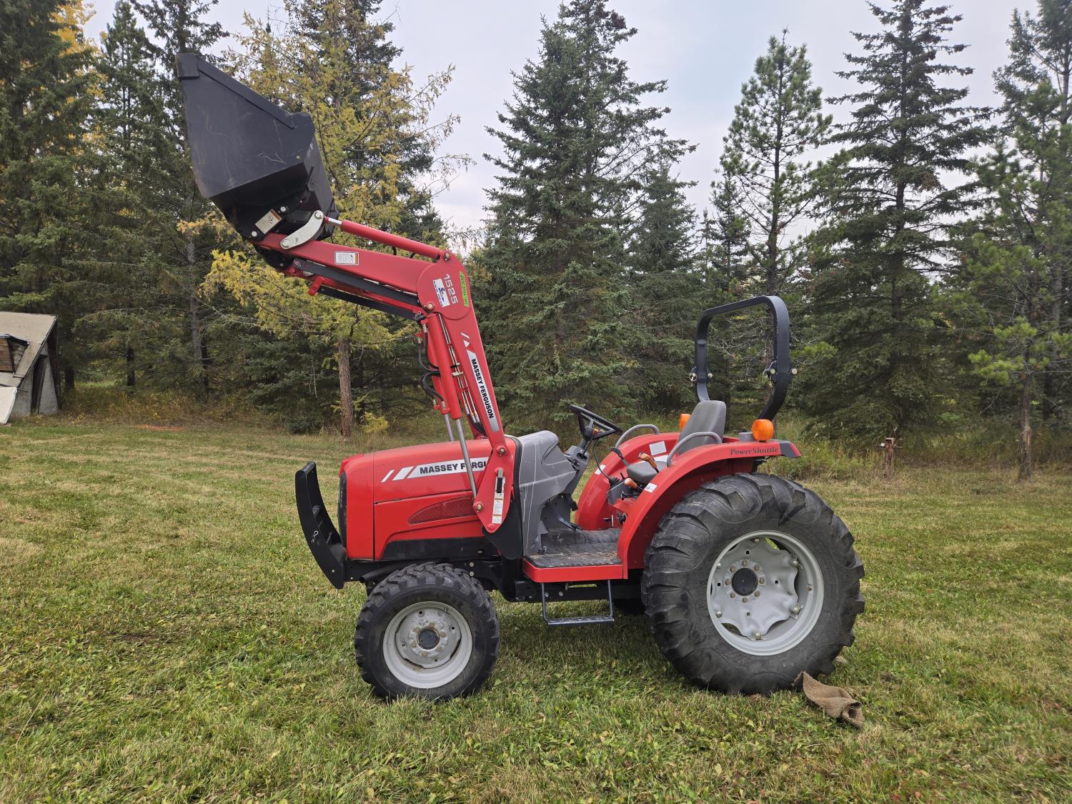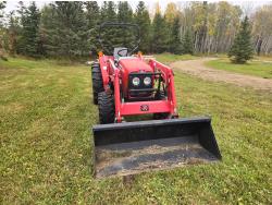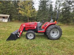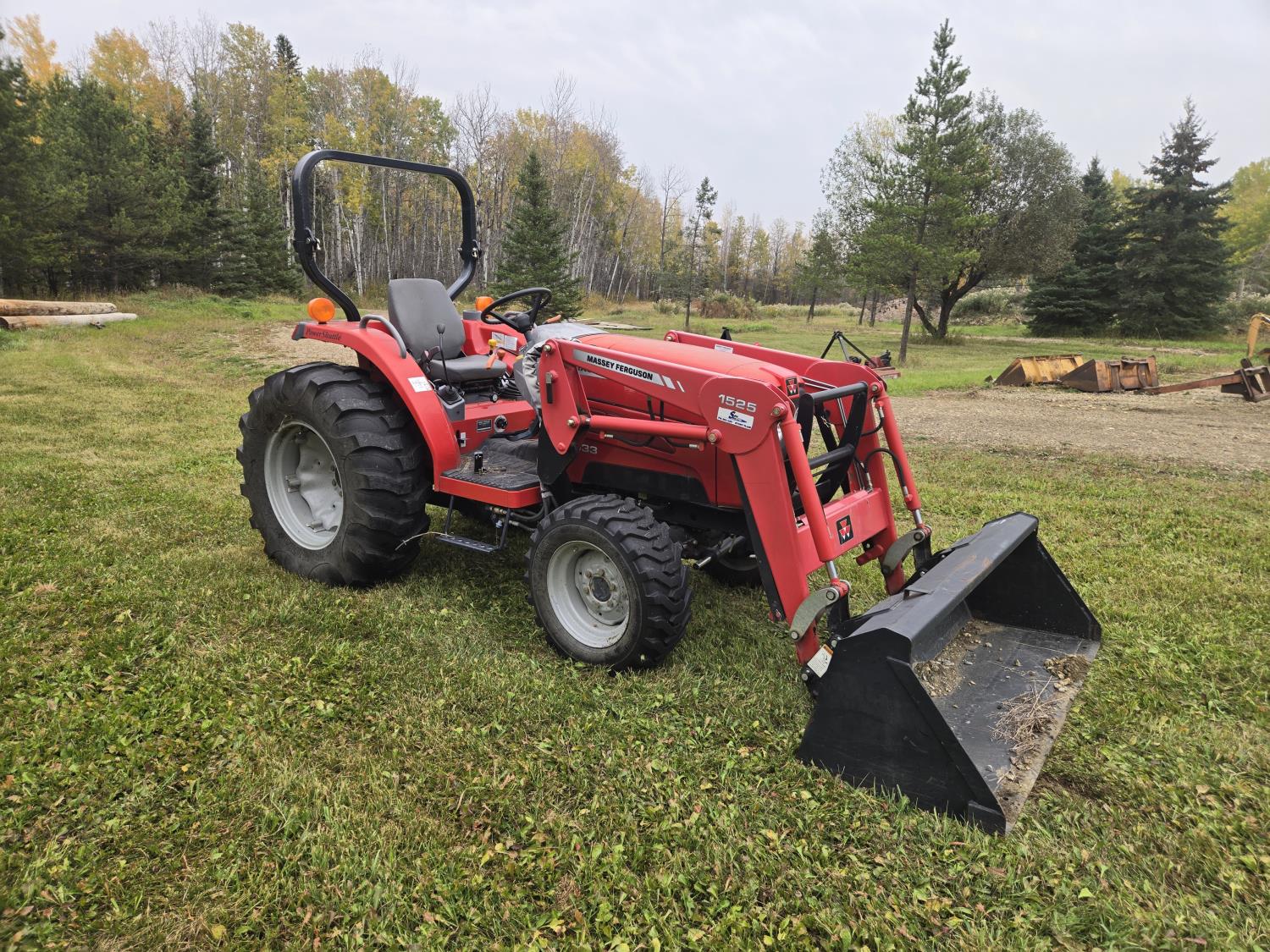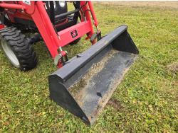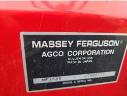 Massey Ferguson 1525 loader, Q/A, 66 inch bucket, Iseki 1.5 L 3 cylinder 33 HP, engine, 26 PTO HP, 12 speed manual transmission, shuttle shift, rear differential lock, joystick, 540 PTO, 3 point hitch, 10-16.5 front tires, 14.9-24 rear tires