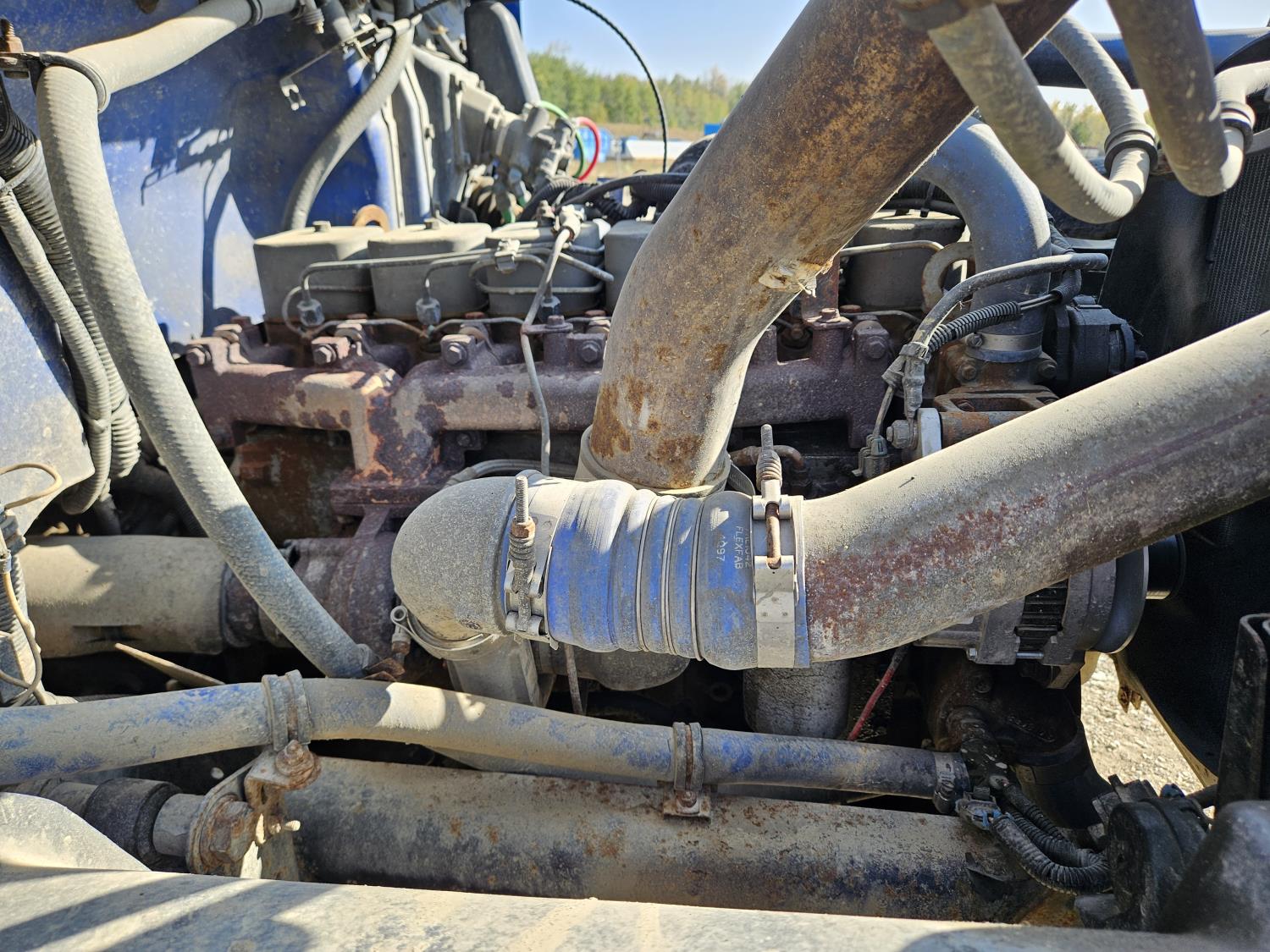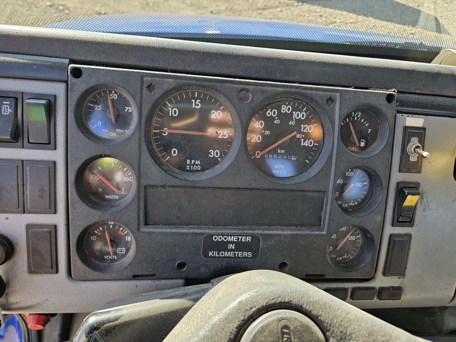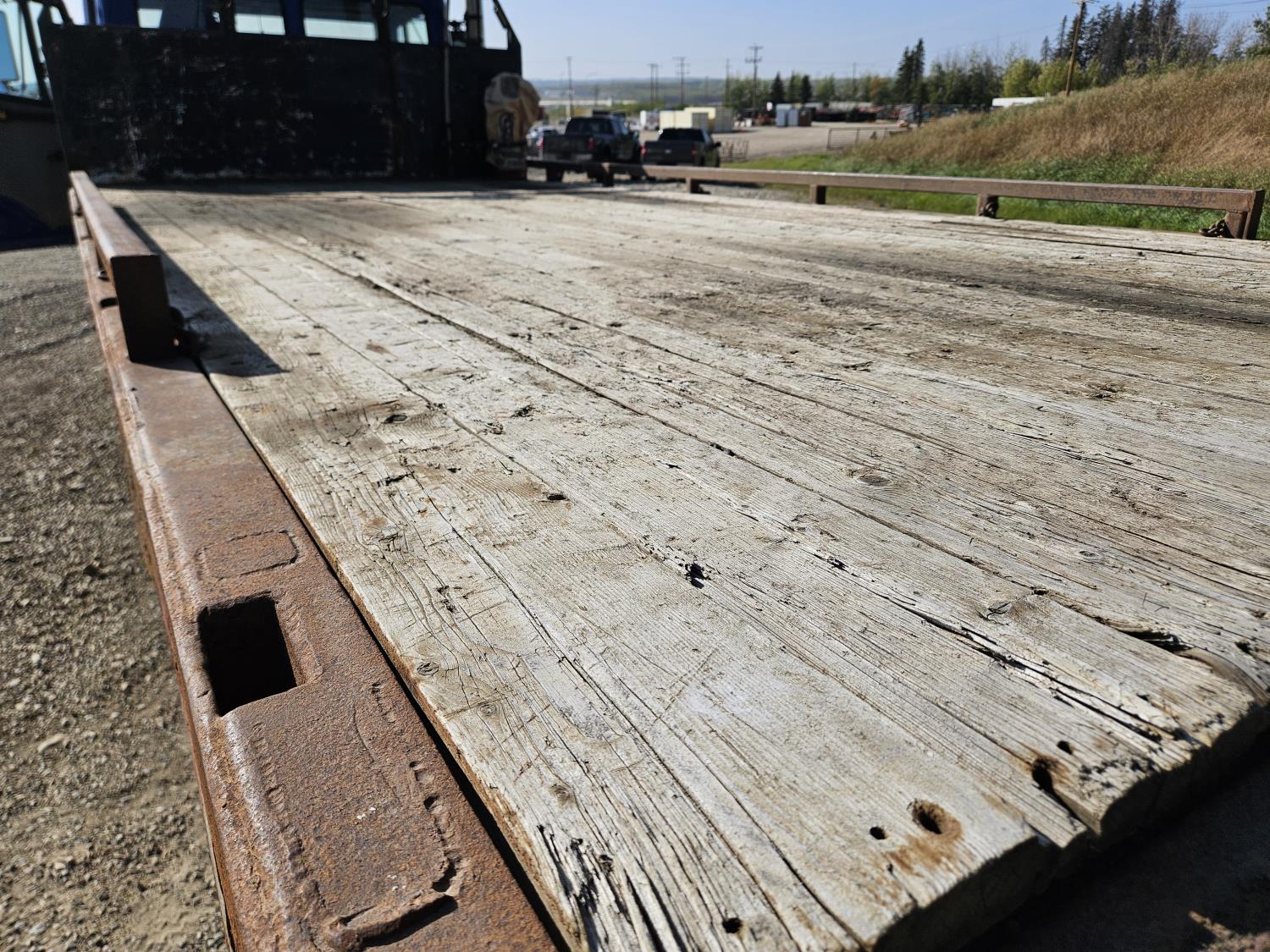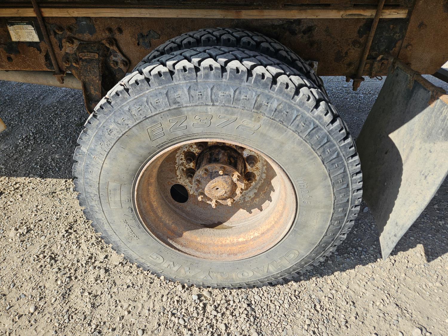 Cummins 5.9 L 6 cylinder 175 HP diesel engine, 6 speed manual transmission, radio, CB radio, steel headache rack, steel tool boxes, 103 inch x 18 ft deck, chain holders, air ride suspension, 12,000 lb front axle, 22,700 lb rear axles, 11R22.5 tires