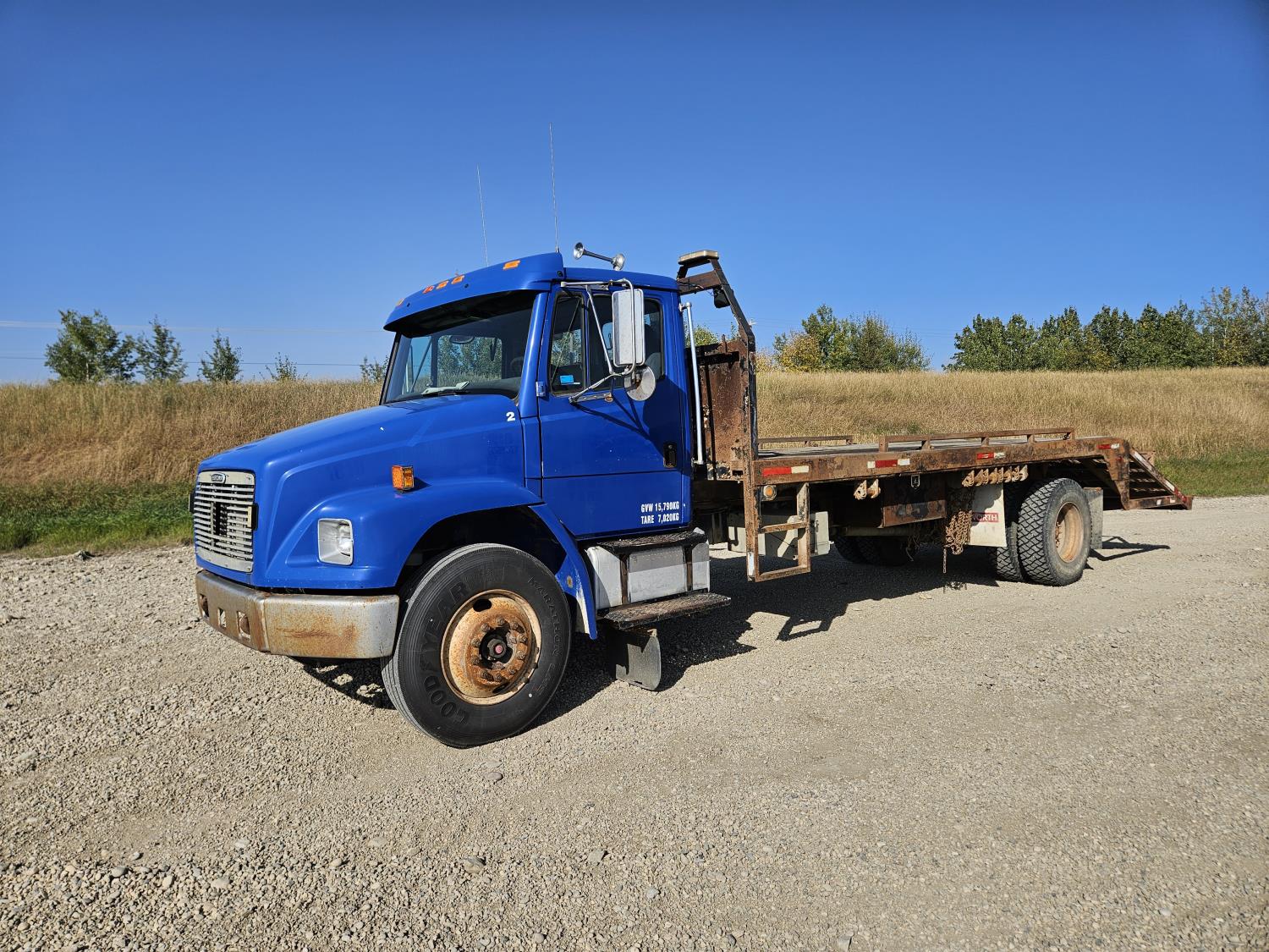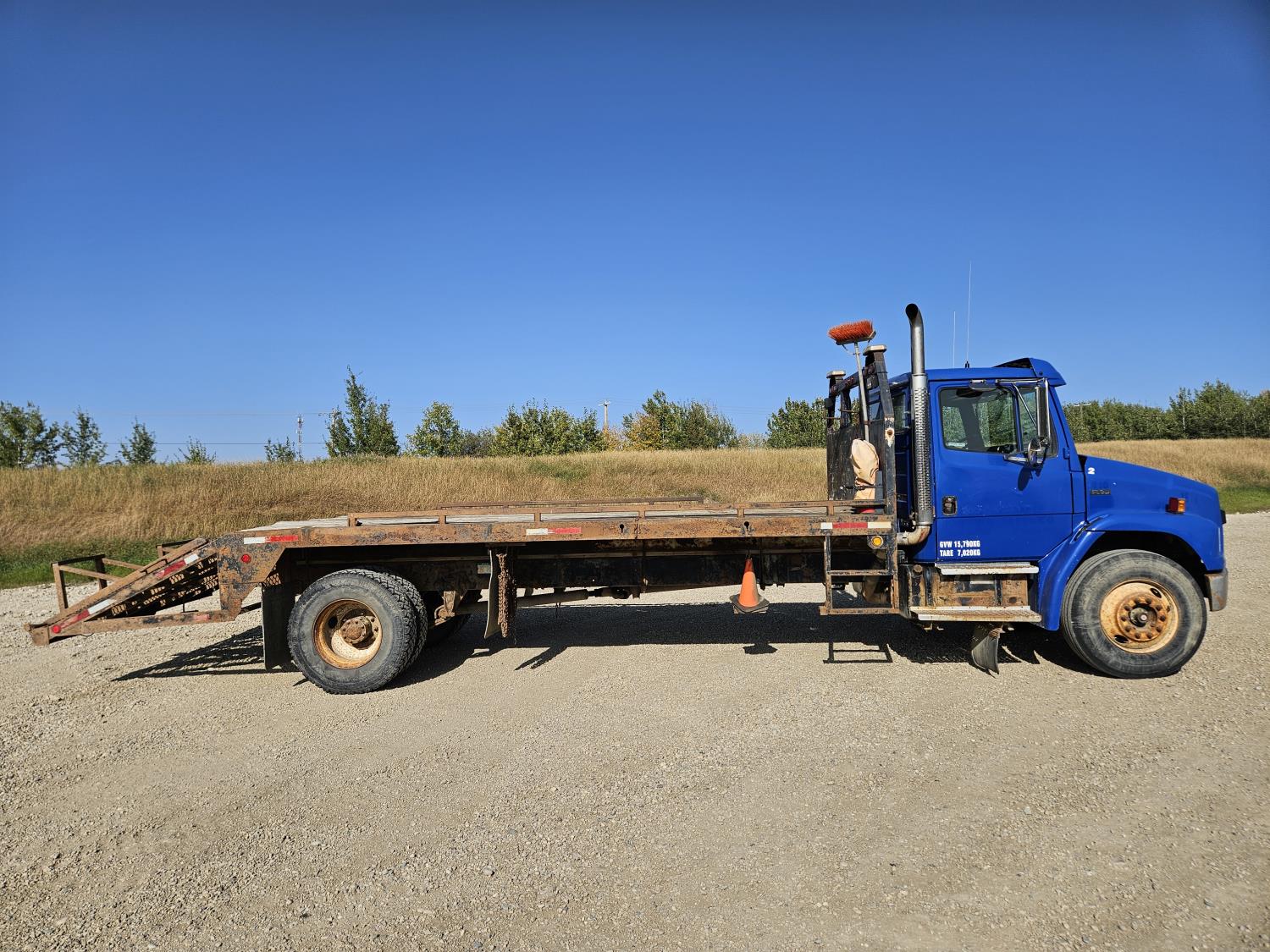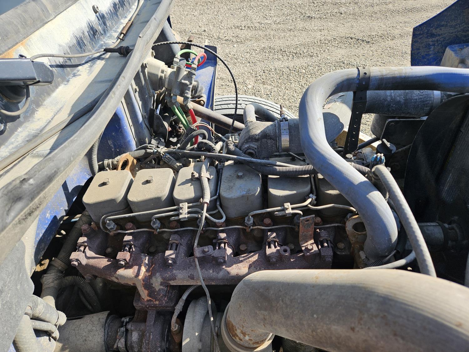 Cummins 5.9 L 6 cylinder 175 HP diesel engine, 6 speed manual transmission, radio, CB radio, steel headache rack, steel tool boxes, 103 inch x 18 ft deck, chain holders, air ride suspension, 12,000 lb front axle, 22,700 lb rear axles, 11R22.5 tires