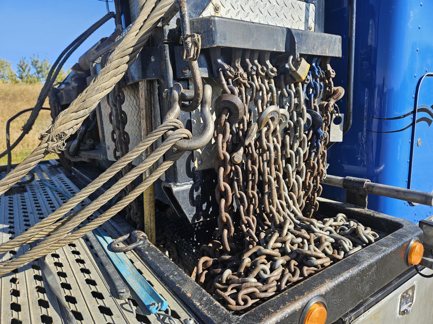 Caterpillar C15 550 HP engine, engine block heater, Eaton Fuller 18 speed manual transmission, A/C, cruise control, air ride driver seat, radio, CB radio, hydraulic wet kit, steel moose bumper, steel headache rack, steel tool boxes, chain holders, front live pto, Tulsa 30 hydraulic winch, front air assist suspension, air ride suspension, 20,000 lb front axle, 52,000 lb rear axles, full lockers, tire chains and rigging, Platinum kit @ 18209 hrs, new rad, new fifth wheel, rails and fenders @ 18628 hrs, New front and rear bushings @ 19667 hrs, all aluminum wheels, 425/65R22.5 front tires, 11R24.5 rear tires