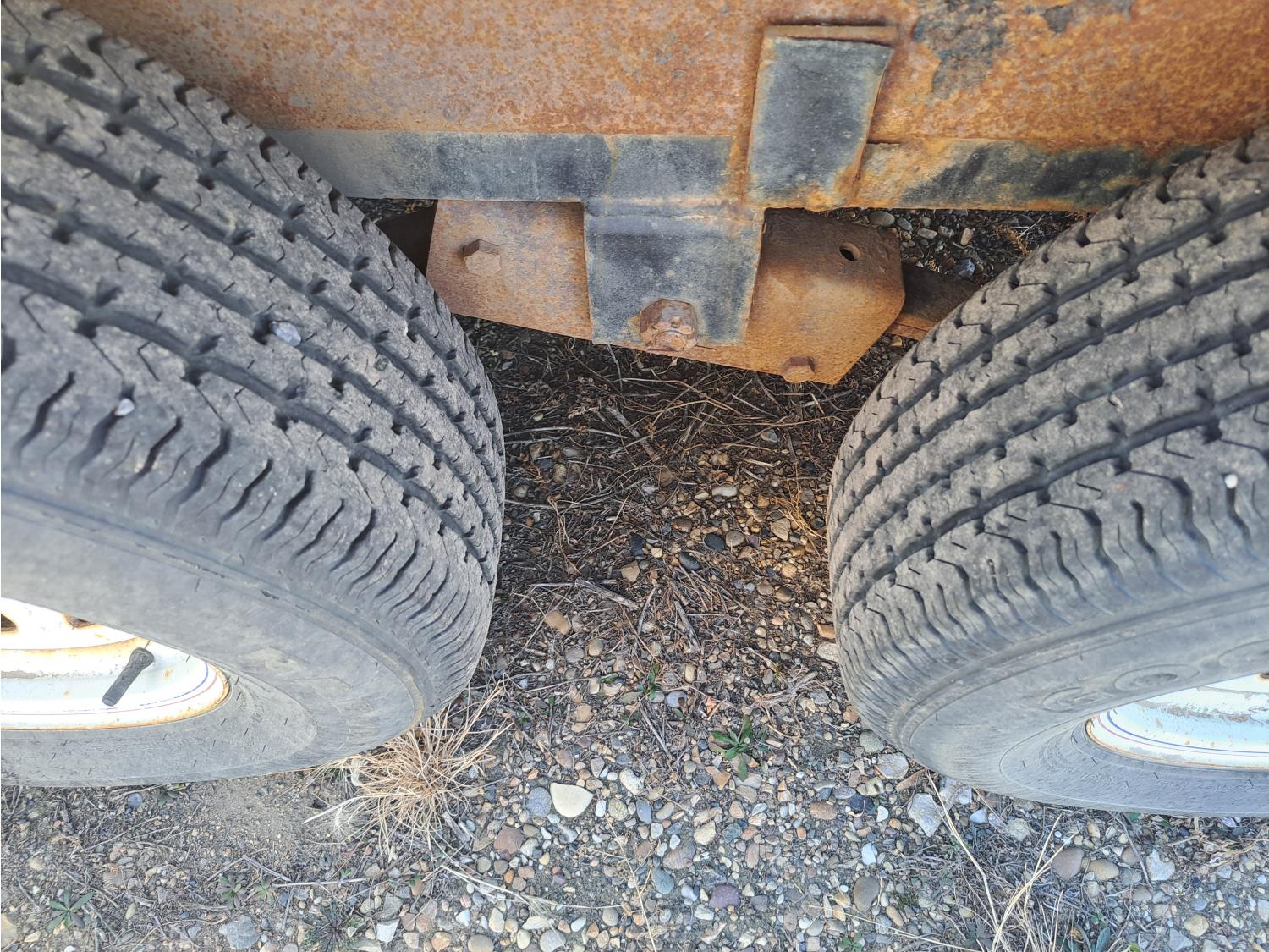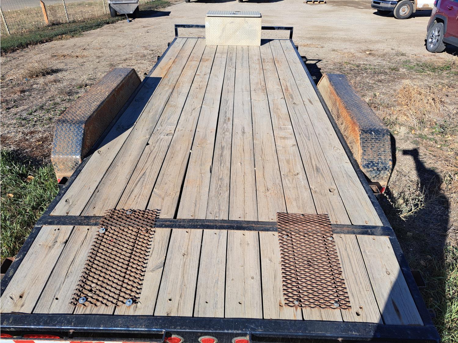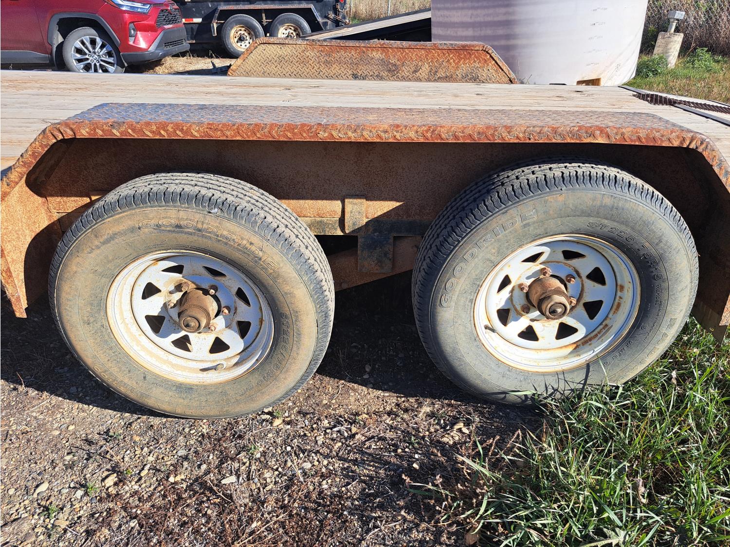 86 inch wide deck, wood deck, spring suspension, ball hitch, tool / storage box, stake pockets, 5000 lb axles, 225/75R15 tires
