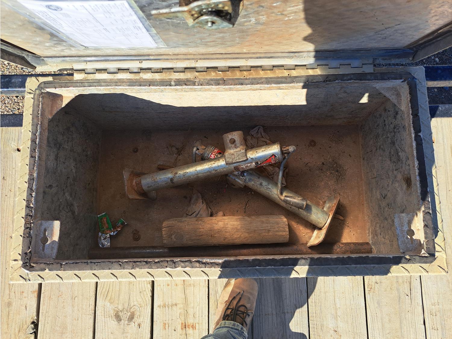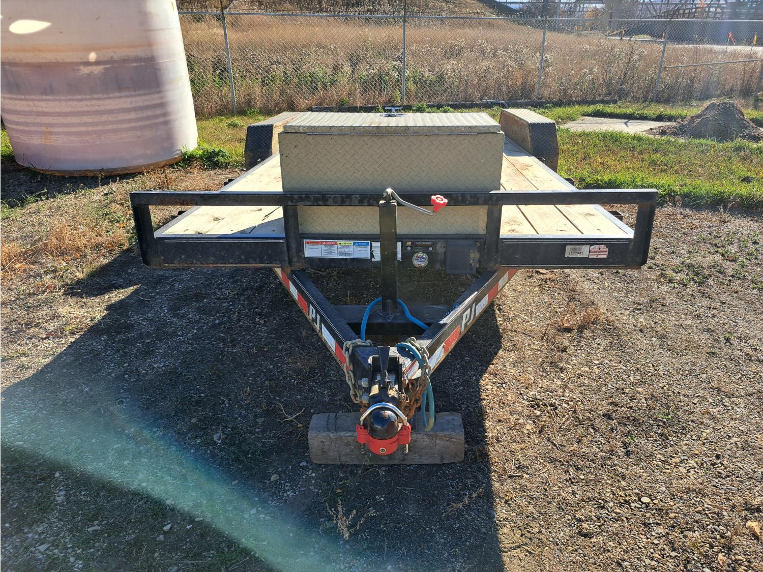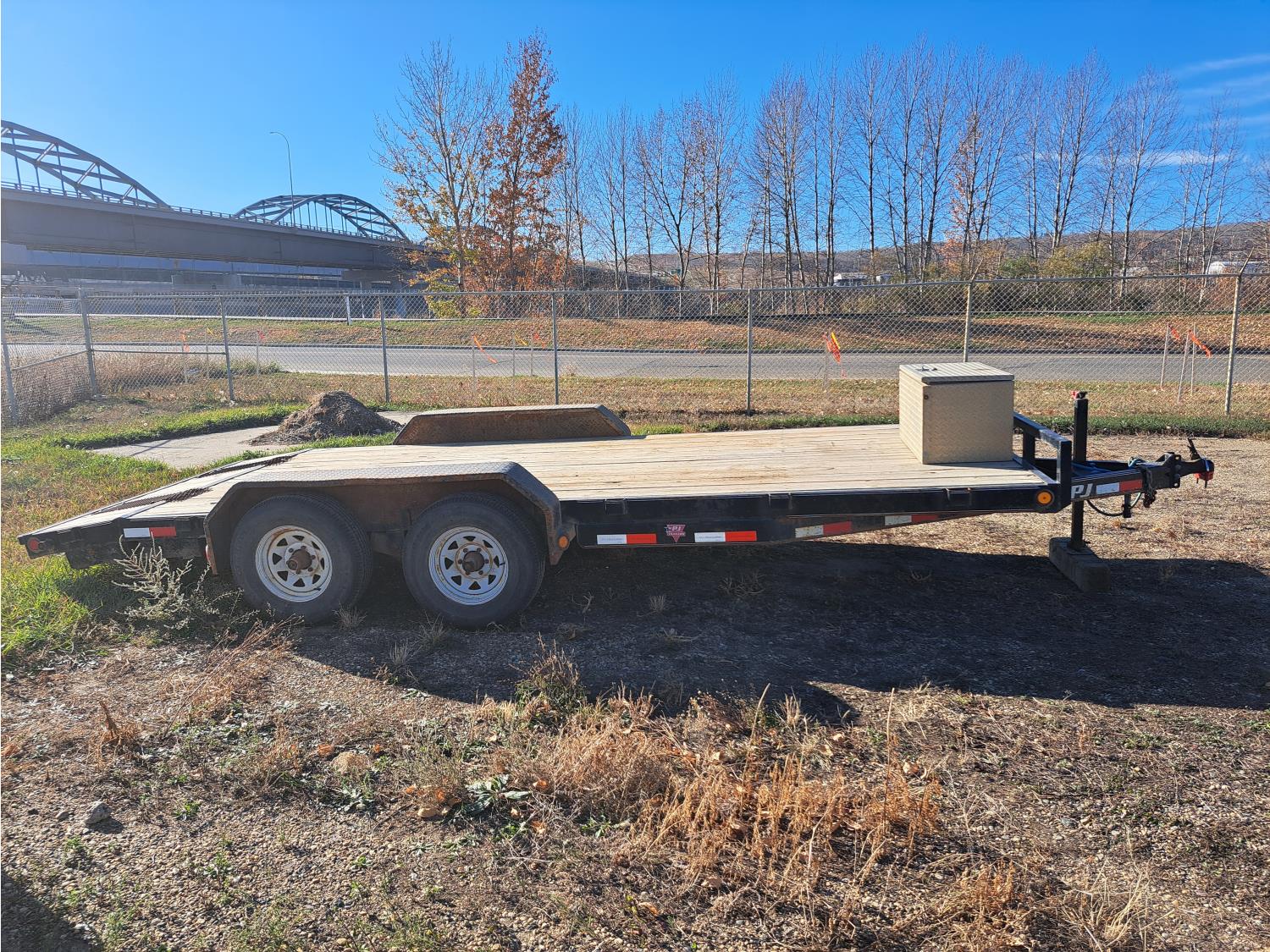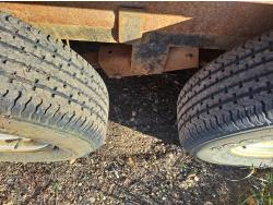 86 inch wide deck, wood deck, spring suspension, ball hitch, tool / storage box, stake pockets, 5000 lb axles, 225/75R15 tires