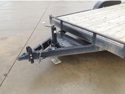 82 inch wide deck, wood deck, slide in ramps, spring suspension, ball hitch, tool / storage box, rub rails, stake pockets, 5000 lb axles, 225/75R15 tires