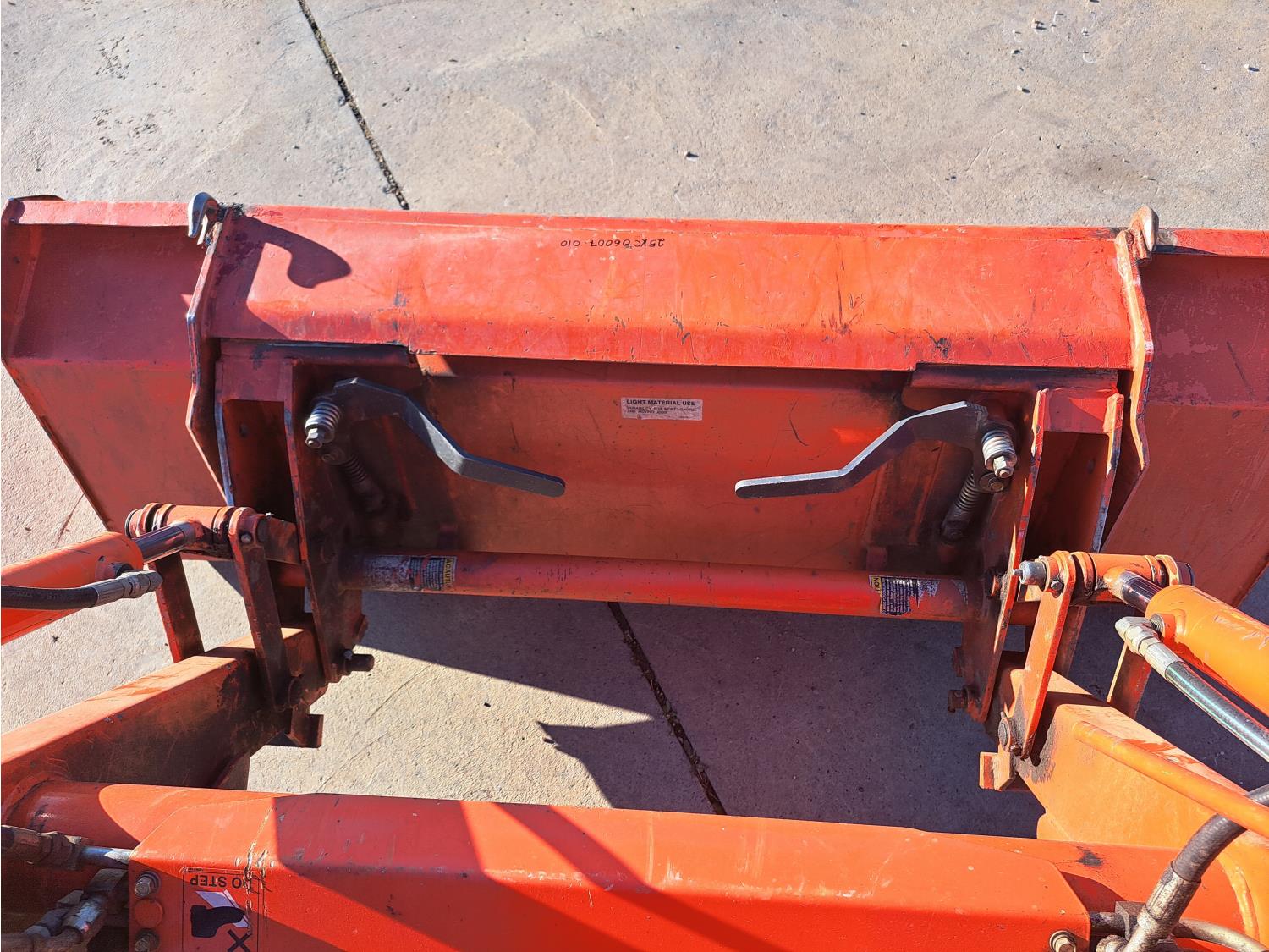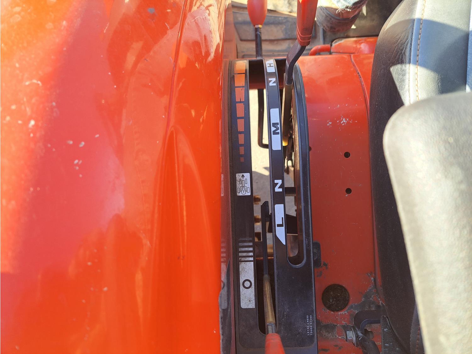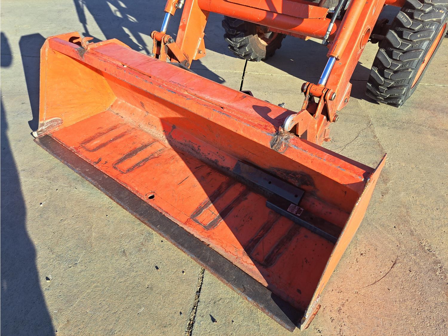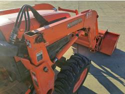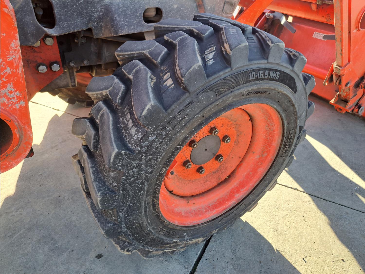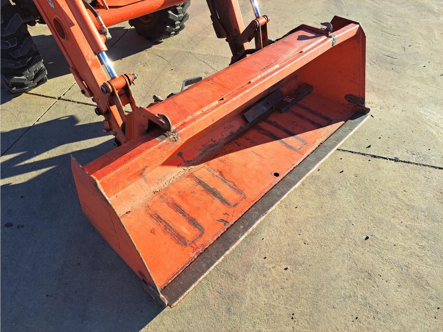 Kubota LA723 loader, 71 inch bucket, Kubota 1.6 L 3 cylinder 35 HP, diesel engine, 28 PTO HP, hydro 3 range transmission, open station platform, joystick, 540 PTO, 3 point hitch, 10-16.5 front tires, 420/70-24 rear tires