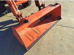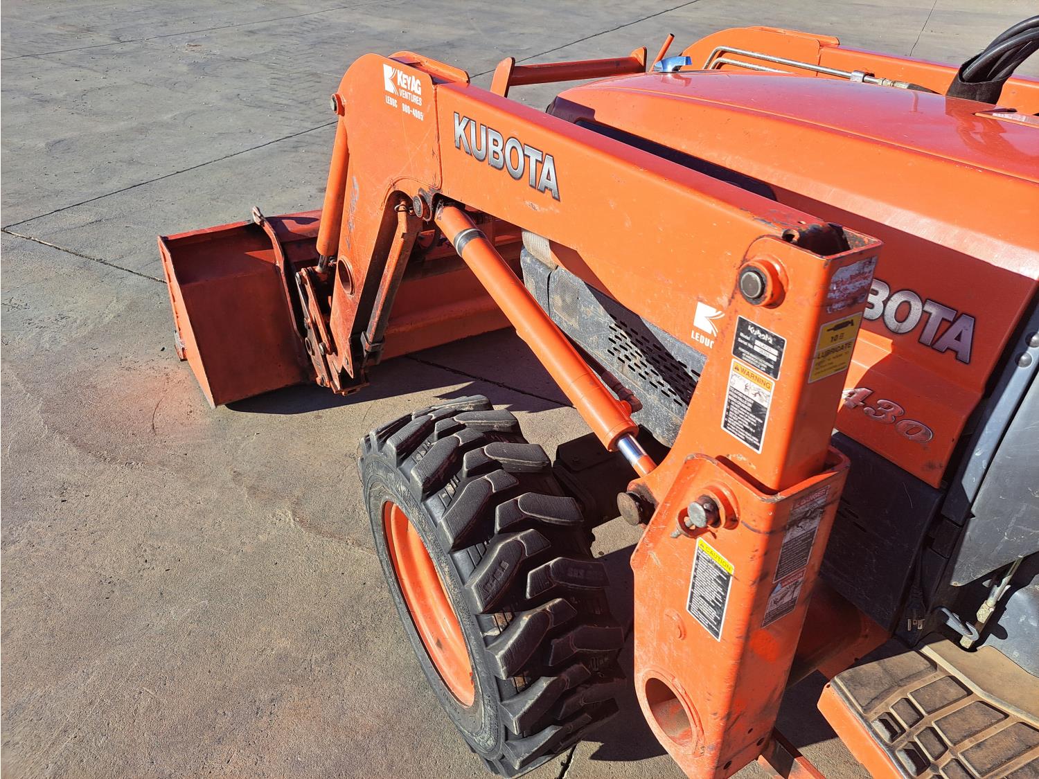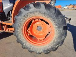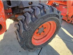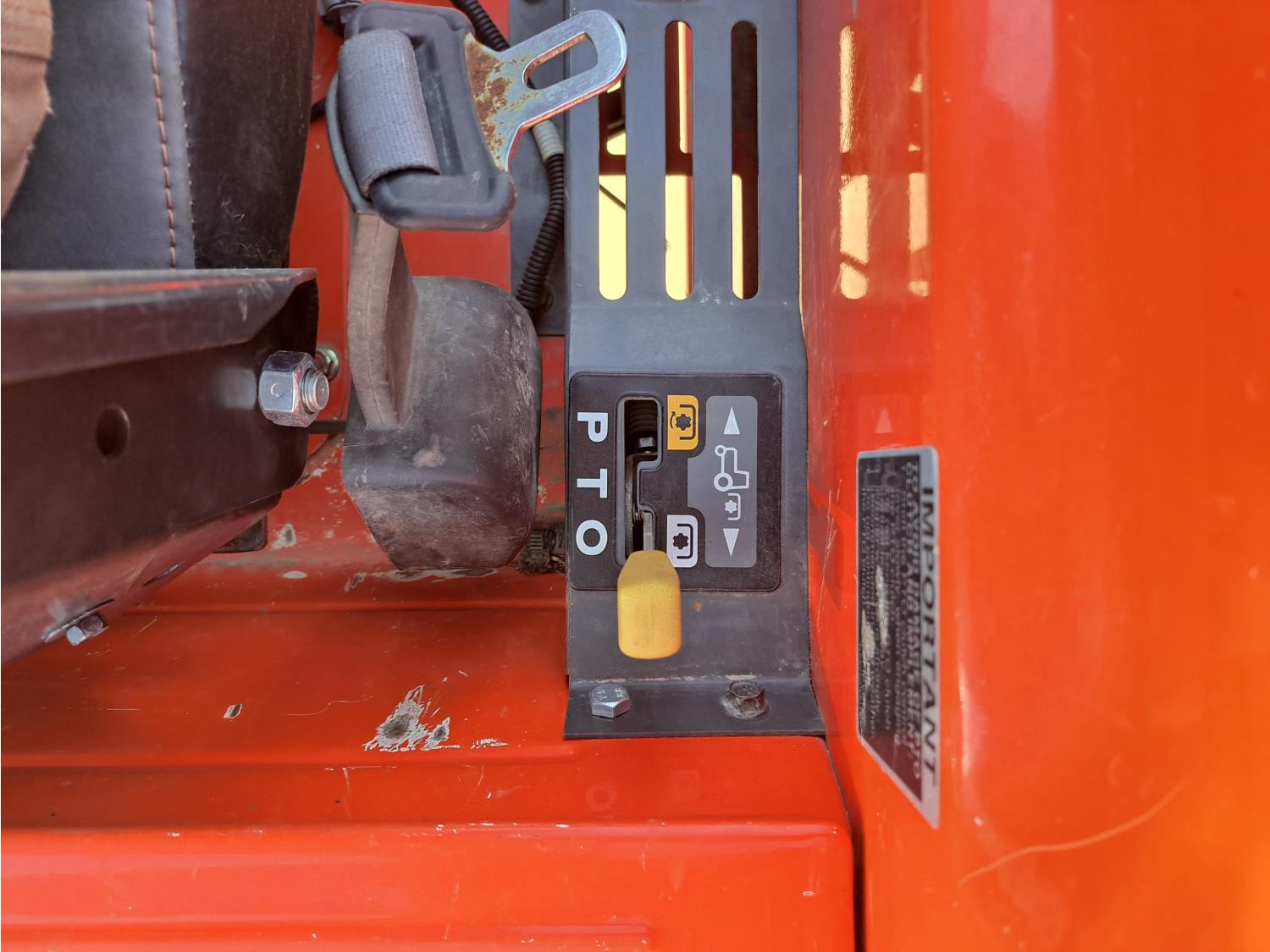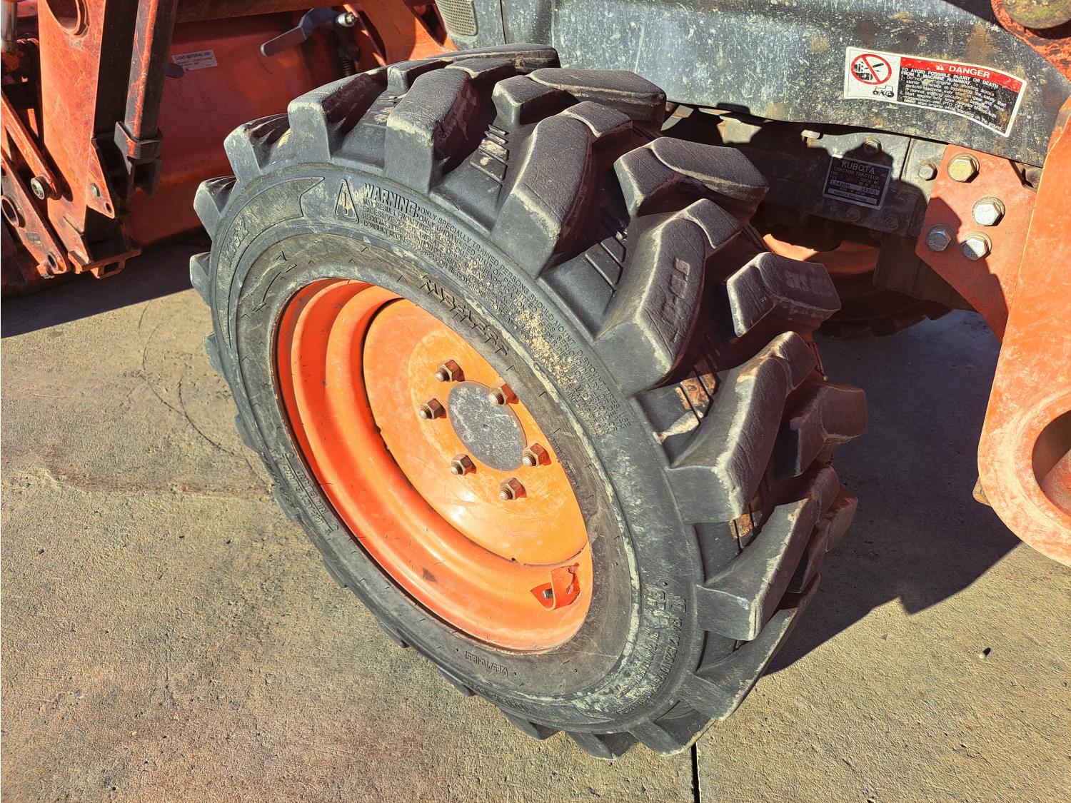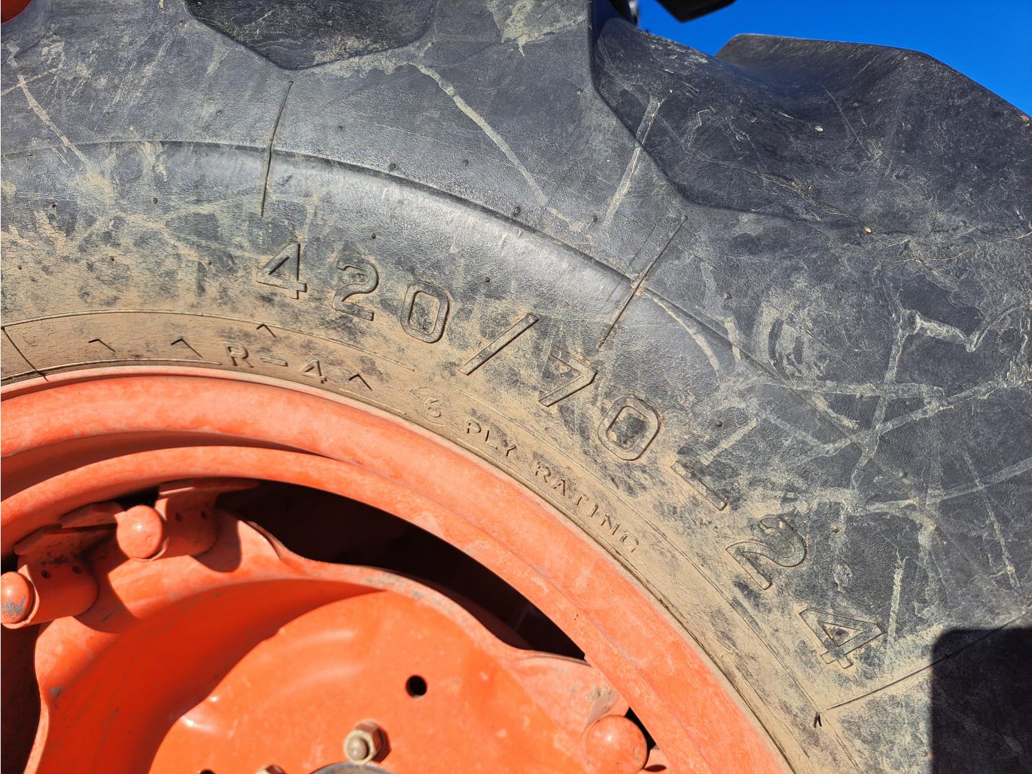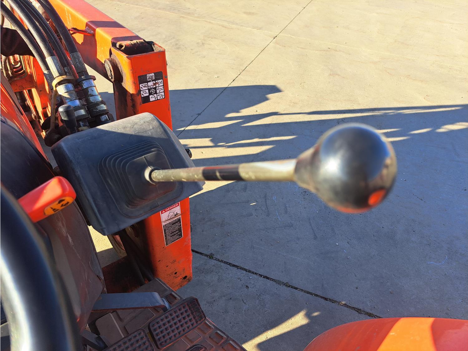 Kubota LA723 loader, 71 inch bucket, Kubota 1.6 L 3 cylinder 35 HP, diesel engine, 28 PTO HP, hydro 3 range transmission, open station platform, joystick, 540 PTO, 3 point hitch, 10-16.5 front tires, 420/70-24 rear tires