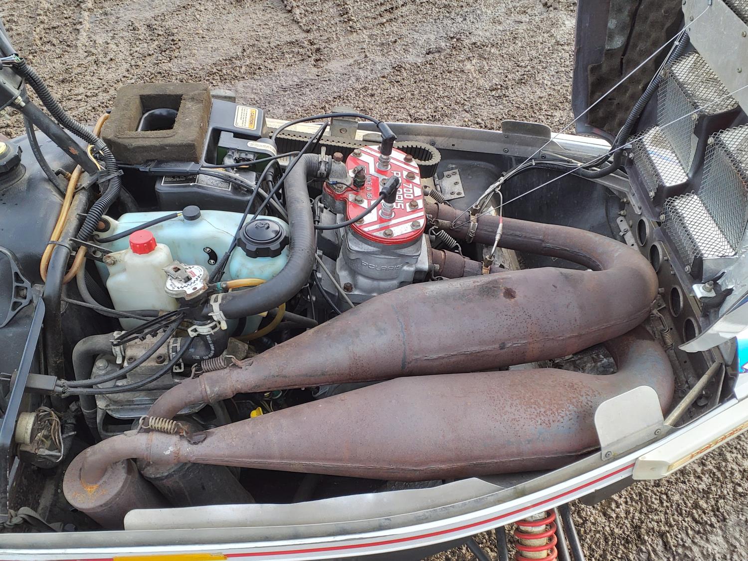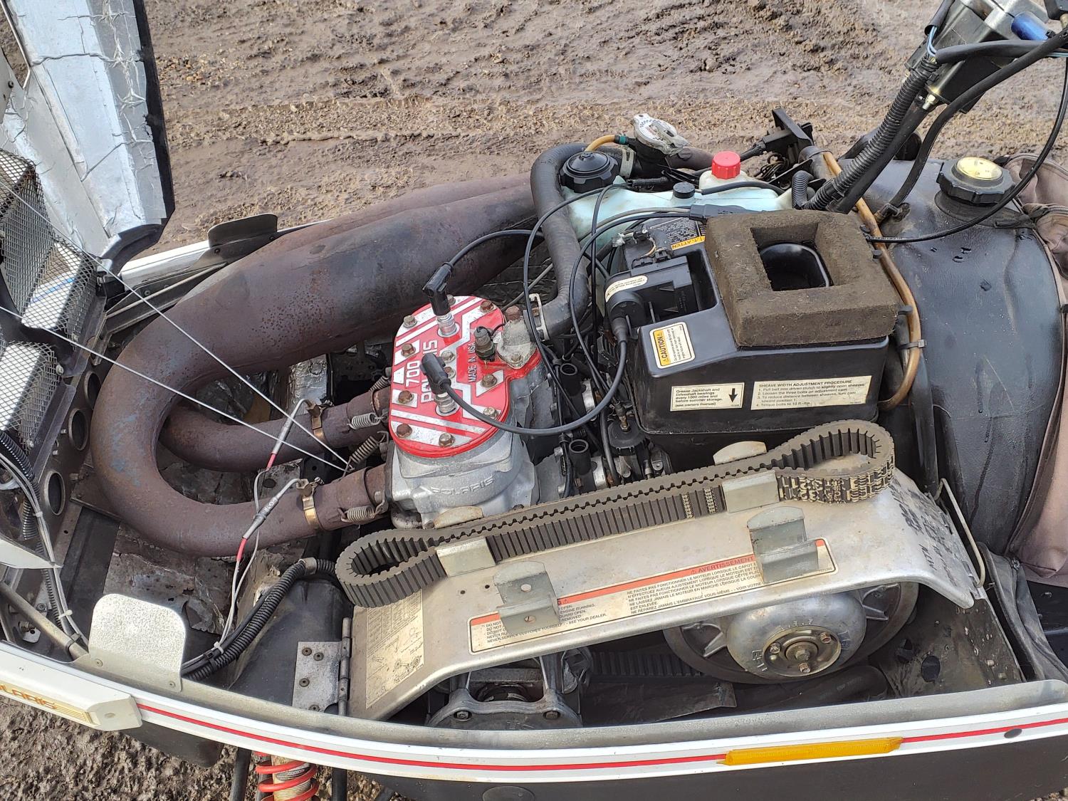 679 cc 2 cylinder 2 stroke engine, hand and thumb warmers, 121 inch long track, 15 inch wide track